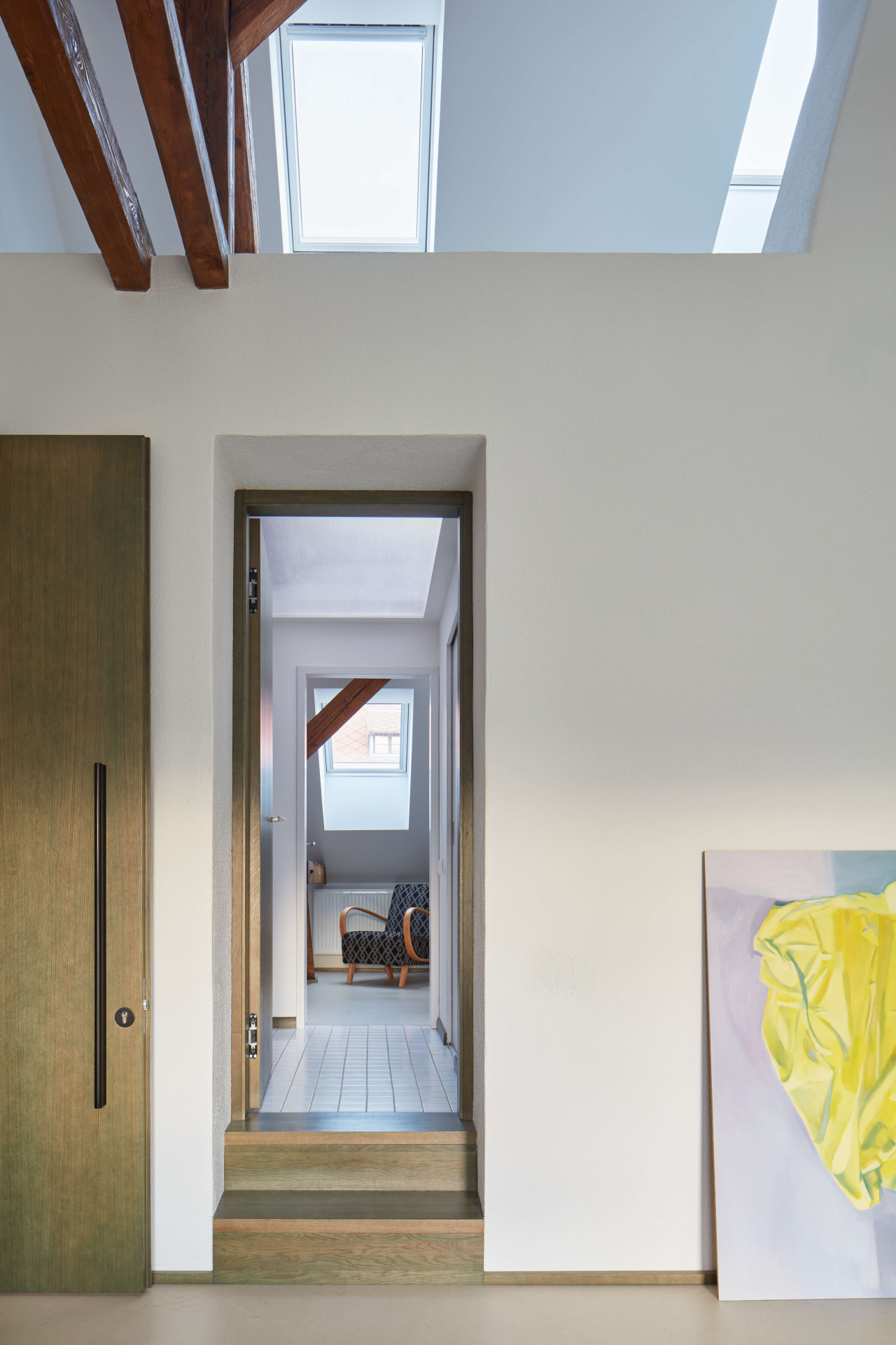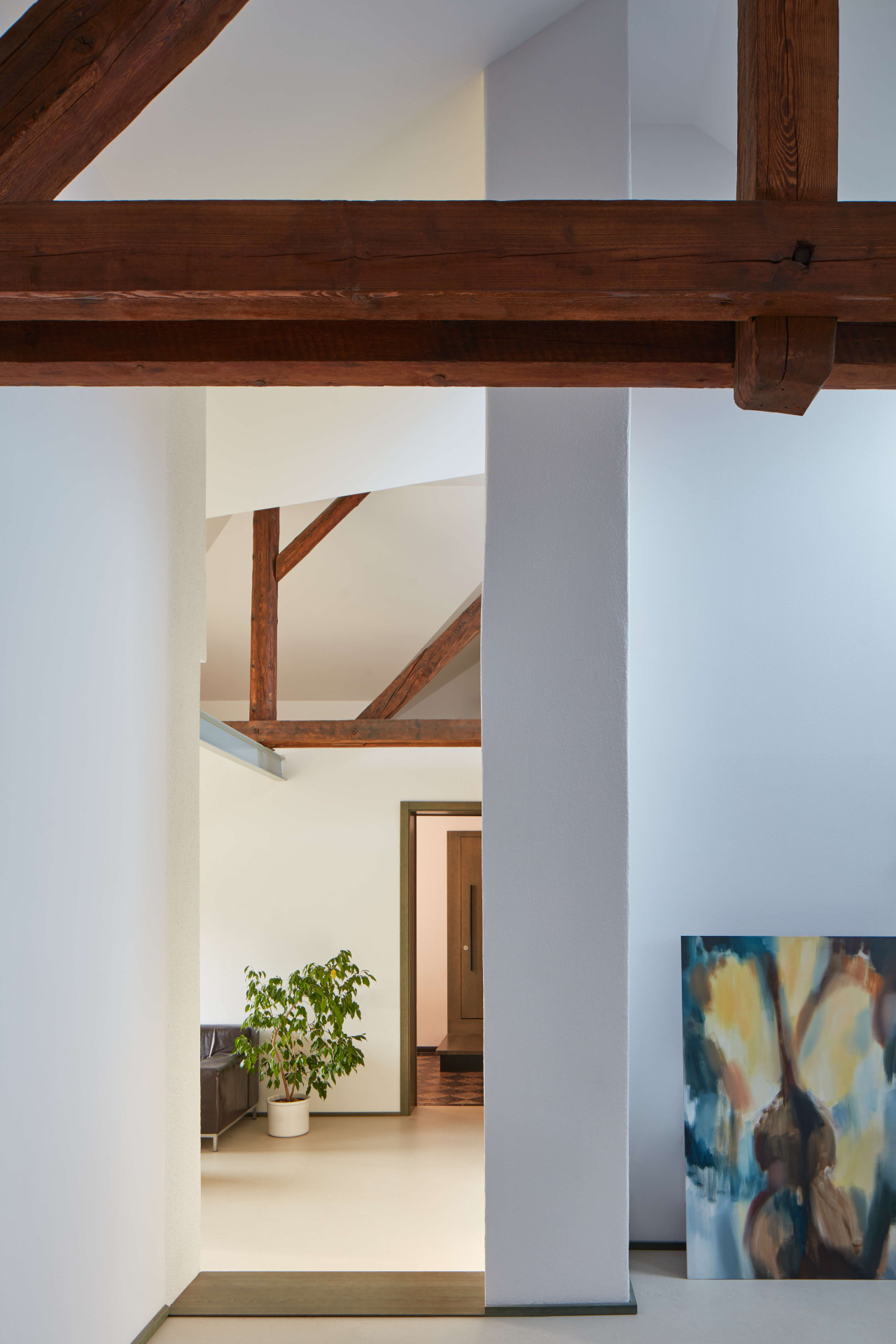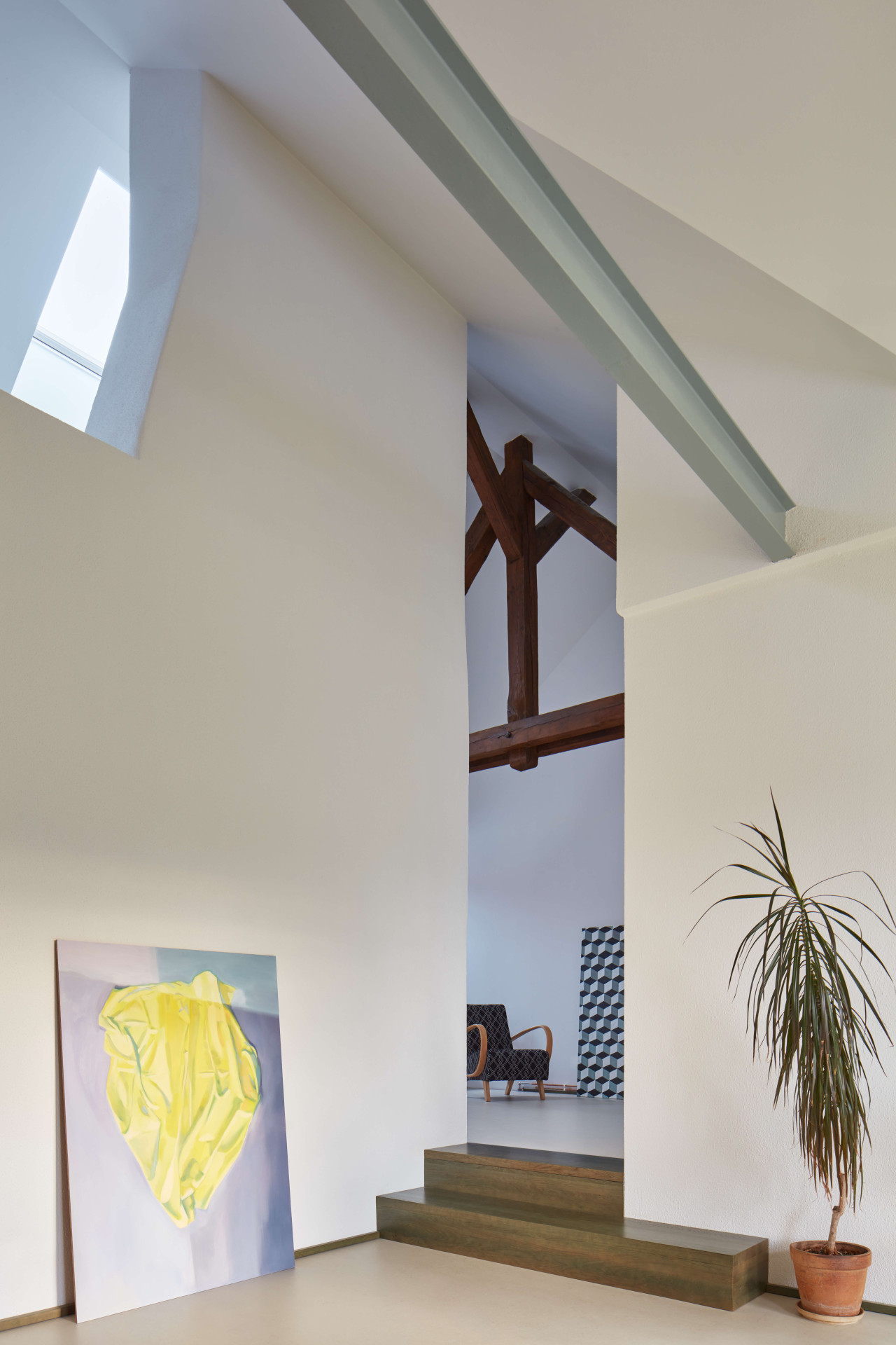 Staré prvky dostaly po rekonstrukci domu nový kontext. Stejně tomu tak je i s prostory. Schodišťová hala, která byla kdysi ústřední částí domu, je dnes hlavně komunikačním uzlem. S novými byty ale kontakt úplně neztratila, kdo jde zrovna do patra, lze pozorovat okénkem z kuchyně.