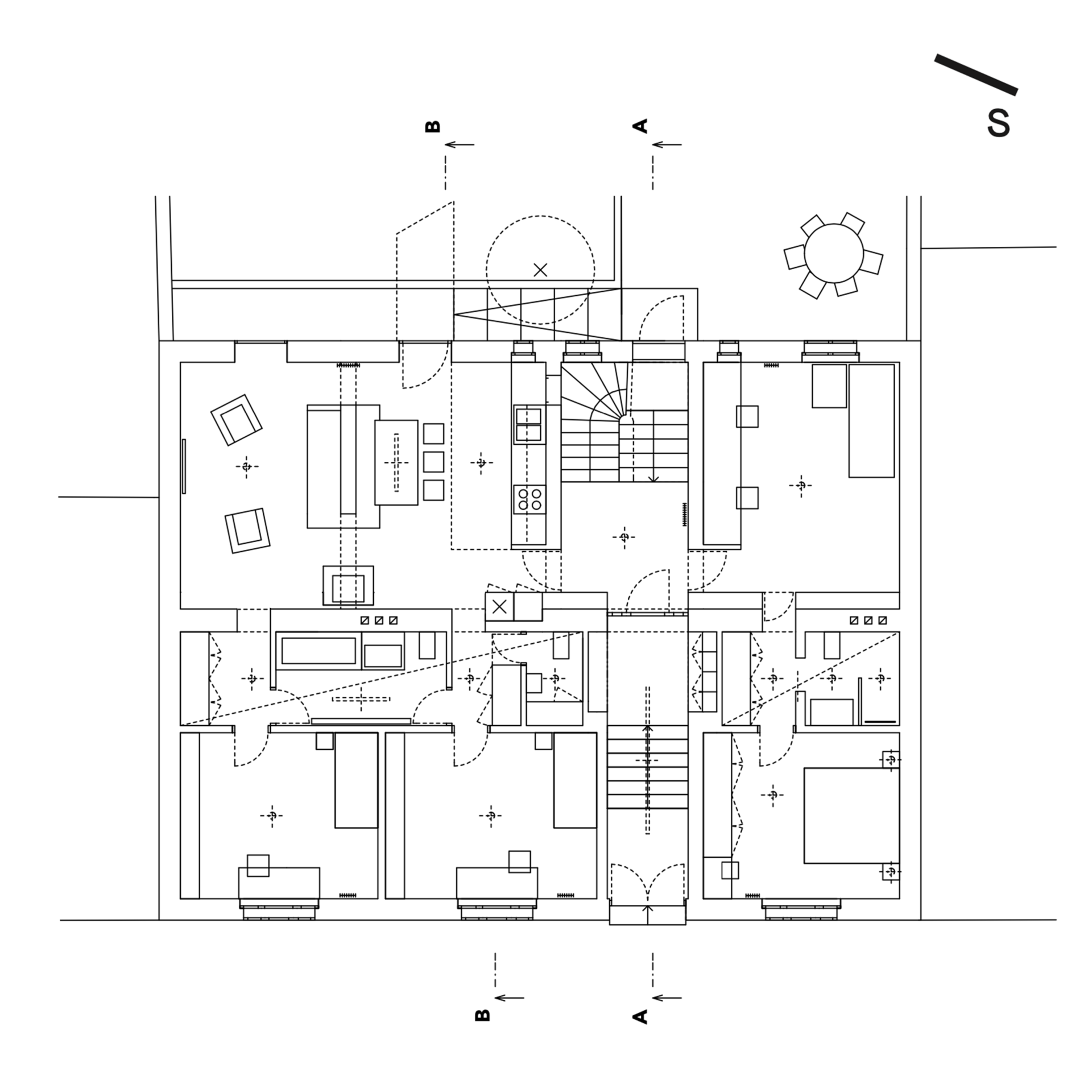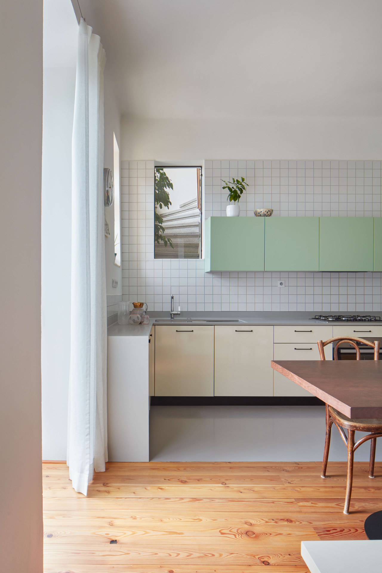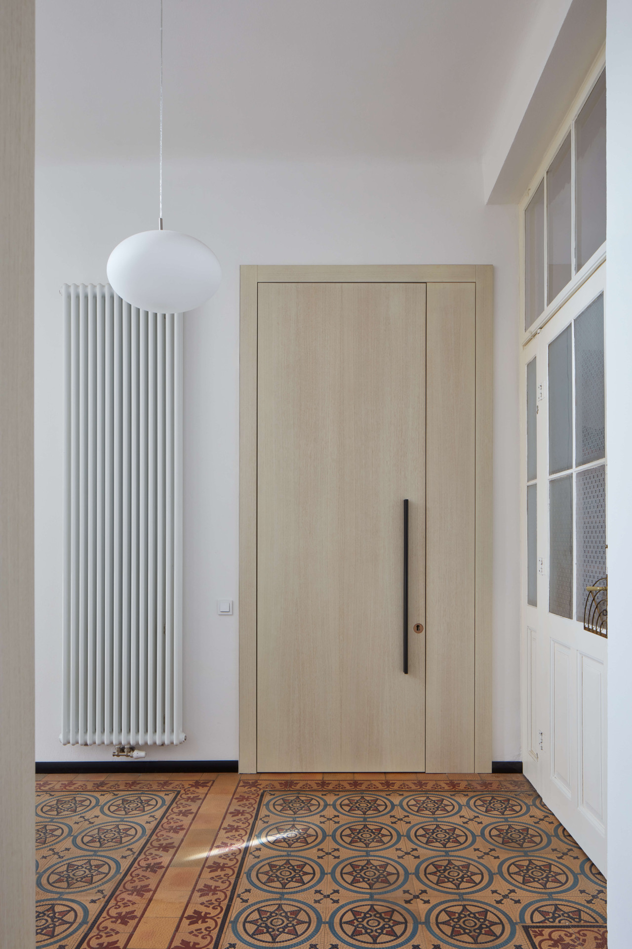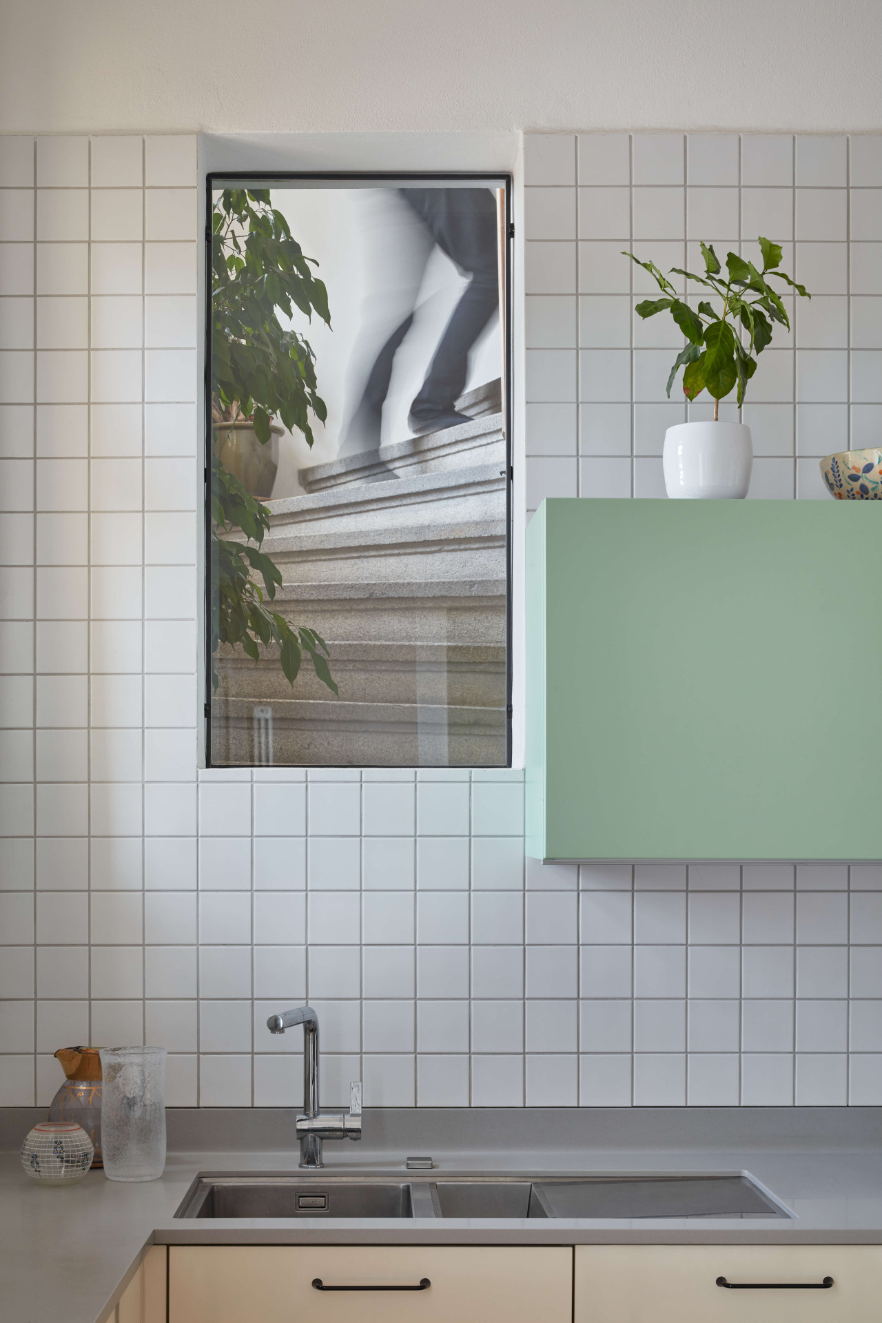 Staré prvky dostaly po rekonstrukci domu nový kontext. Stejně tomu tak je i s prostory. Schodišťová hala, která byla kdysi ústřední částí domu, je dnes hlavně komunikačním uzlem. S novými byty ale kontakt úplně neztratila, kdo jde zrovna do patra, lze pozorovat okénkem z kuchyně.
