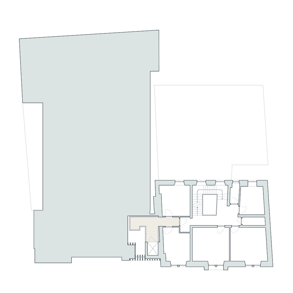 Součástí transformace bývalého kostela bylo rovněž vybudování nové přístavby. Ta zaplňuje proluku mezi kostelem a sousedními řadovými domy. Architekti ji pojali opět kontrastně – na první pohled ji odlišili od původního zdiva, a navíc tak akcentovali nový vstup do komunitního centra. Přístavba má dřevěnou konstrukci a je obložená teracovými panely. „Teracové panely jsou ve vyšších úrovních členěny řadou štíhlých dřevěných lamel, které dodávají fasádě rytmus a řád,“ popisují architekti. Uvnitř přístavby se pak nachází schodiště, které propojuje jednotlivá podlaží – nejnižší úroveň je věnovaná coworkingu, zbytek budovy funguje pro účely komunitního centra a jako zázemí pro konání akcí. Pro ty je možné využit třeba nový amfiteátr nebo společenský sál, který je vsazený přímo do kostelní lodi.