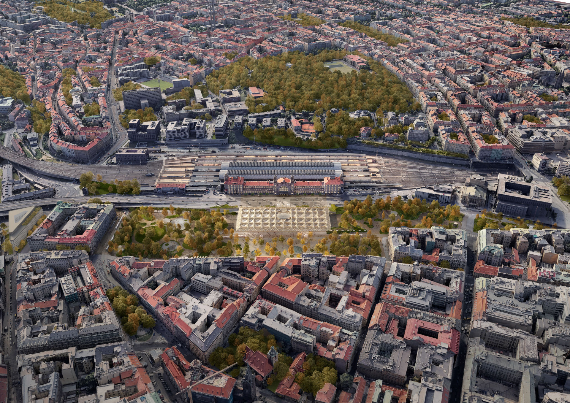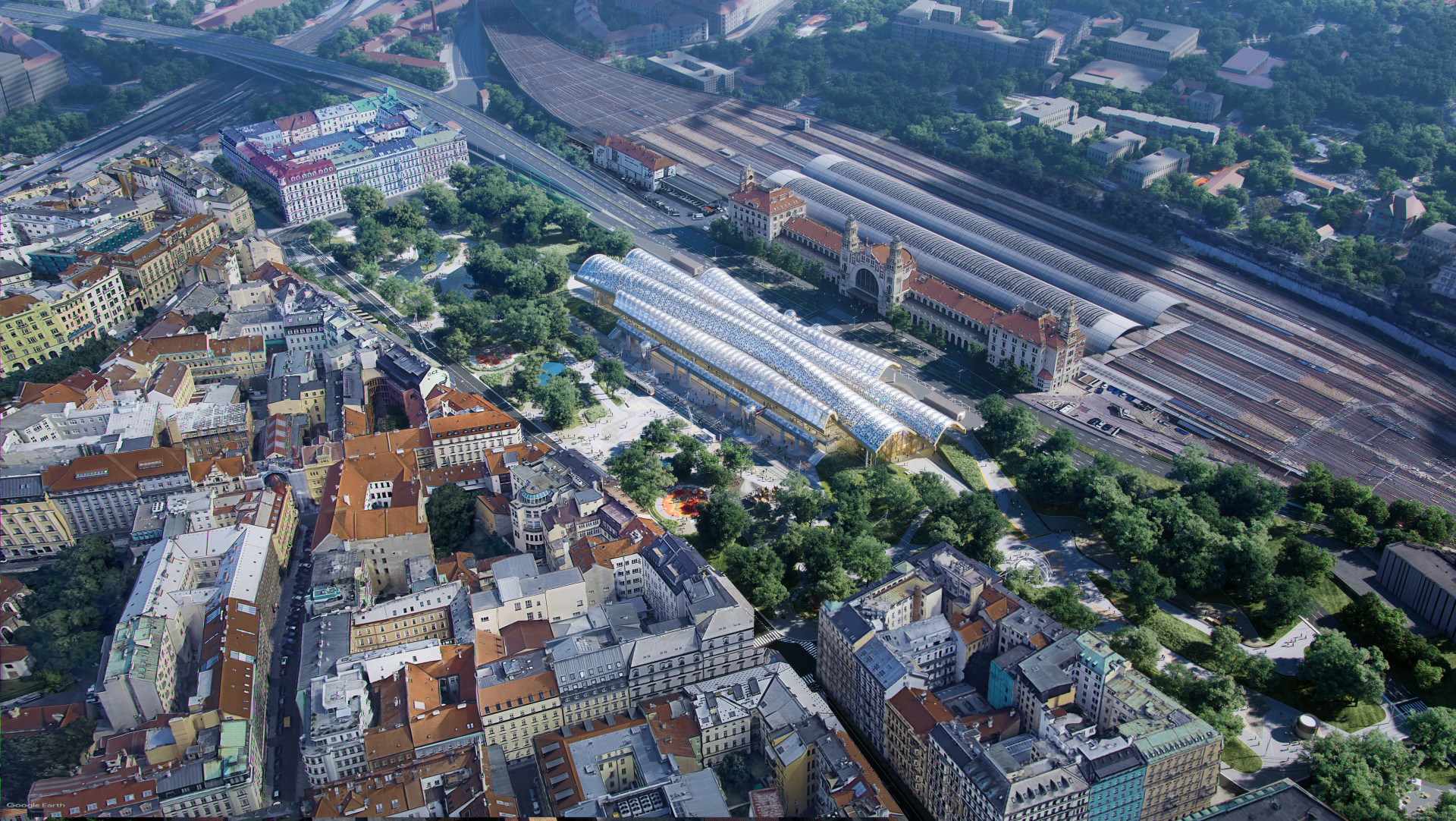 Dle hodnotící komise přinesli Henning Larsen Architects nejlepší řešení celého území hlavního nádraží. Předmětem bylo zlepšení propojení Vrchlického sadů, odbavovací haly, nové tramvajové zastávky přímo před nádražím a Fantovy budovy. To architekti chtějí řešit novou strukturou – dřevěnou střešní konstrukcí, která má navýšit kapacitu odbavovací haly, umožnit, aby přímo pod střechu přijely tramvaje a interiéry haly se více otevřely směrem k parku. Architekt Jacob Kurek o konceptu mluví jako o „místu pro setkávání pod jednou střechou,“ kde se díky transparentnosti dosáhne větší bezpečnosti. Na mysli přitom má „temná zákoutí“ dnešní haly a Vrchlického sadů, které hlavní město Praha požadovalo vyřešit.