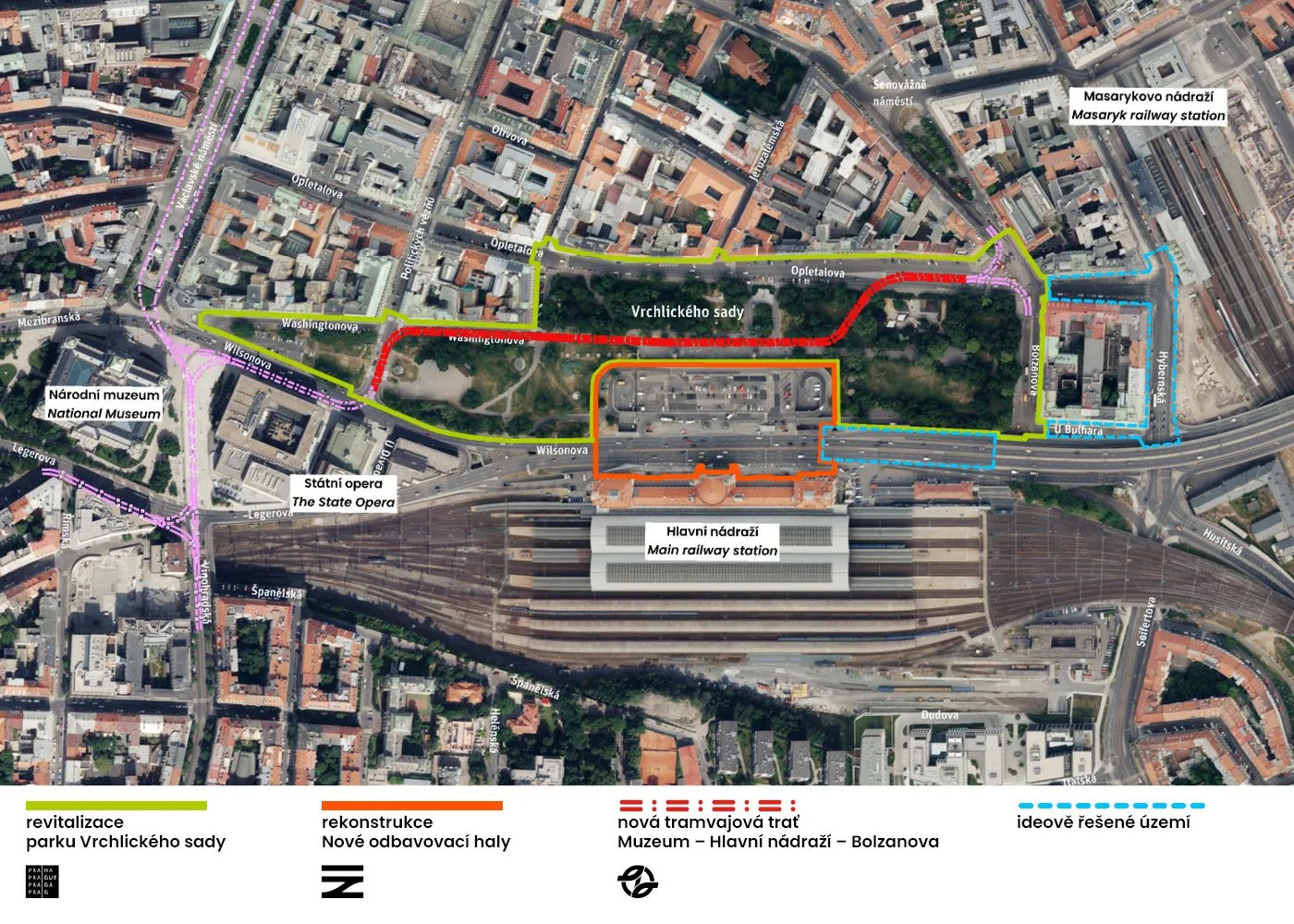 Kancelář rozdělila Vrchlického sady na tři části – kulturní zónu, „nádražní náměstí“ a zónu pro doplňkové aktivity. Rozdělení má také přispět k lepší přehlednosti celého území, celkově návrh slibuje zlepšení podmínek pro pěší i cyklisty. „V návaznosti na plánované zklidnění magistrály zlepší úpravy celého území mobilitu cestujících a Pražanů, a to díky nové zastávce tramvaje přímo před odbavovací halou a napojení směrem k Masarykovu nádraží a dalším městským destinacím,“ stojí v tiskových informacích.