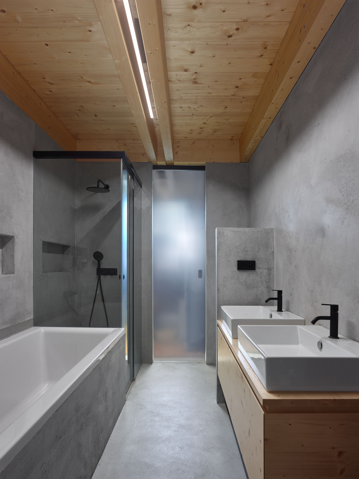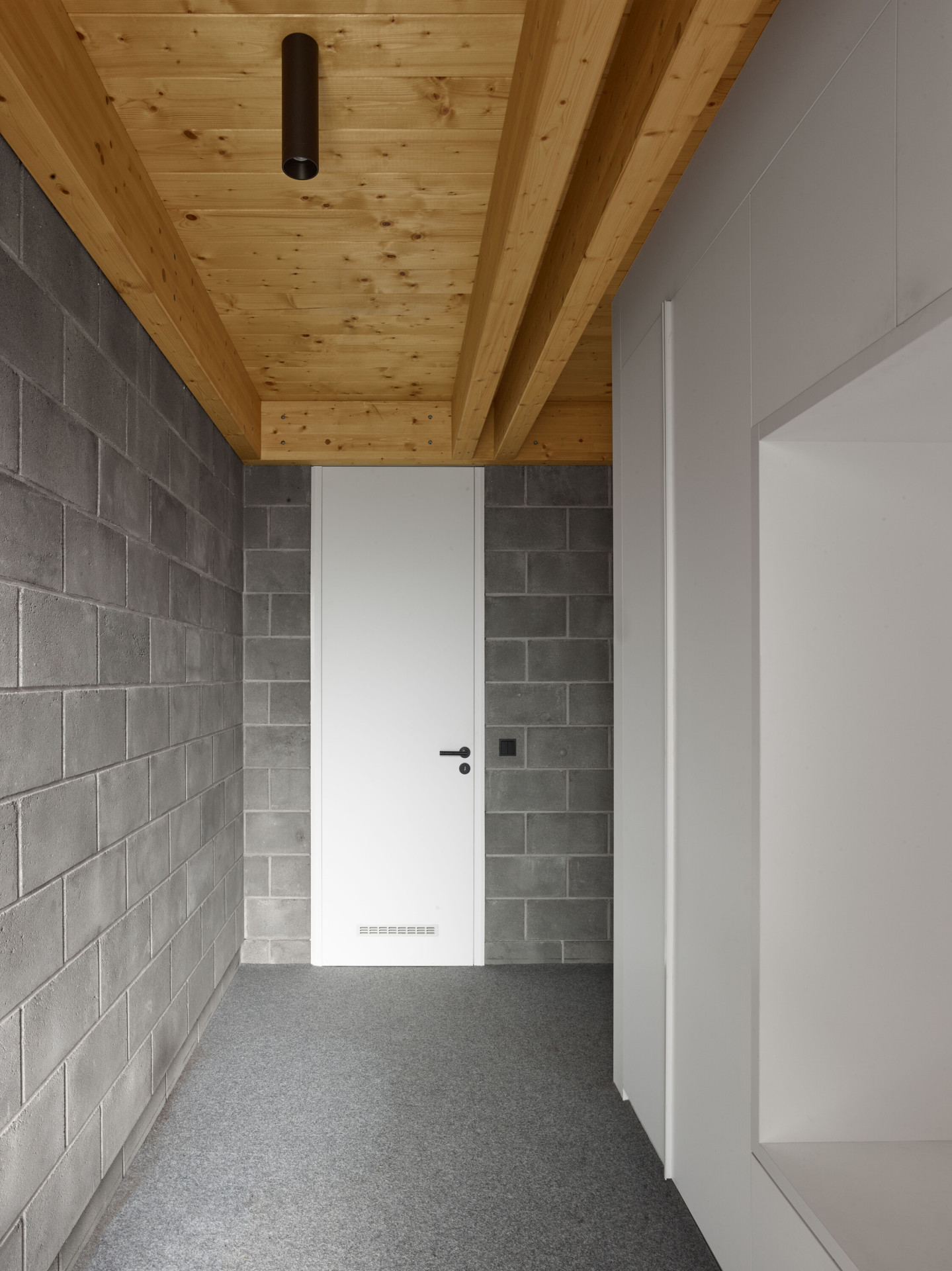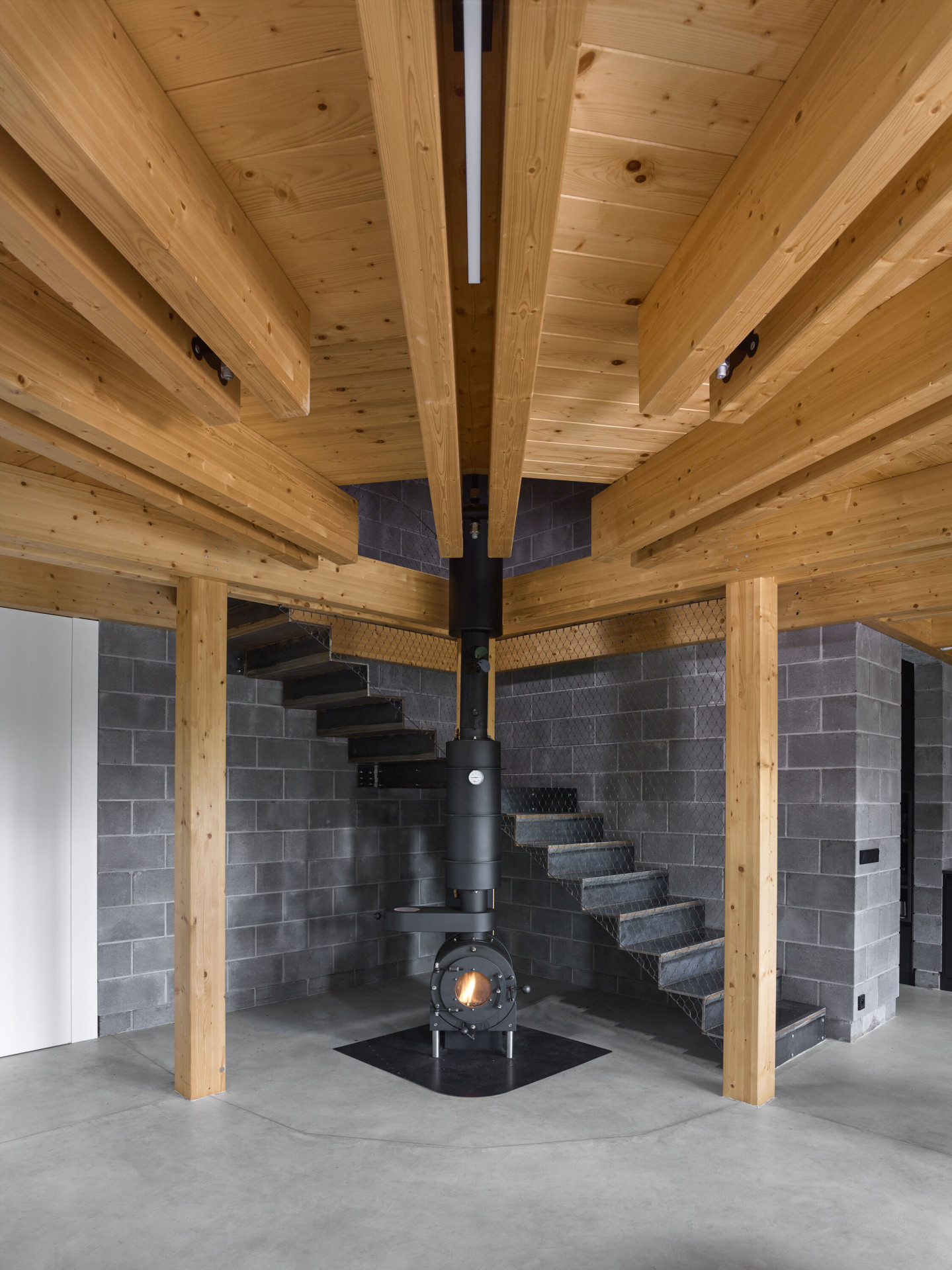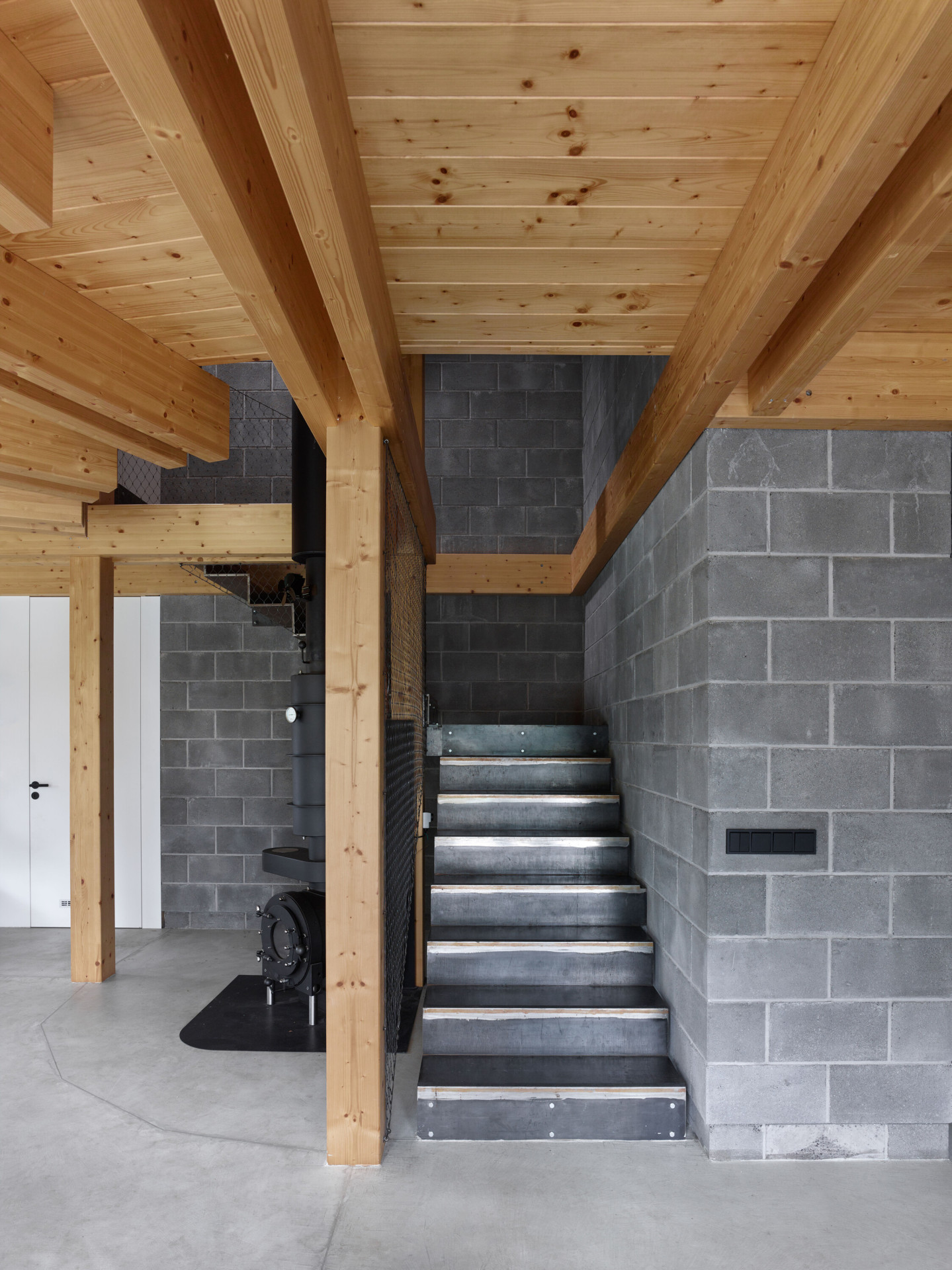 Rodinný dům na Křivoklátsku z většiny tvoří dřevěná konstrukce maximálně přiznaná v exteriéru i interiéru. Boční návětrné stěny jsou pak z důvodu trvanlivosti sestaveny z betonových tvárnic. „Sendvičová stěna s tepelnou izolací pomáhá i přirozené akumulaci tepla a tím i stabilitě domu. Veškeré technické zázemí a koupelny jsou soustředěny právě u těchto pevných a stabilních stěn,“ vysvětlují architekti.
