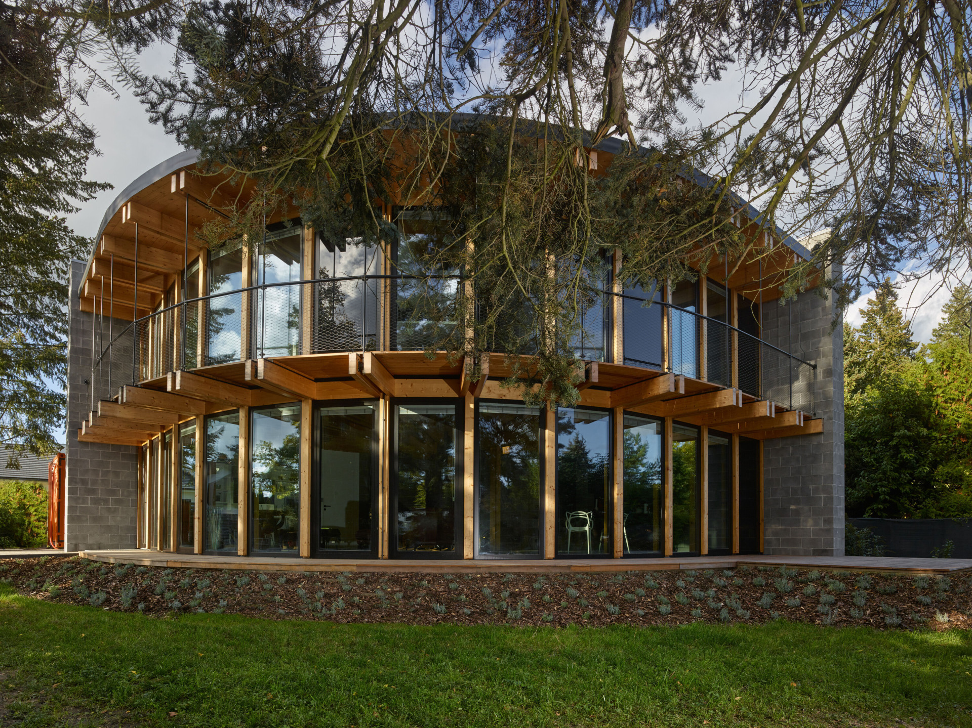Stavba ve svém přízemí obsahuje obývací pokoj, jídelnu a kuchyň, v patře jsou pak situované čtyři ložnice. Všechny obytné pokoje mají výhled do zahrady skrze velká okna v antracitových rámech, která tvoří plášť celé zaoblené fasády. V létě ji dokáže před přehříváním chránit systém pasivního stínění tvořený přesahy střech nebo žaluziemi. „Stejně jako přijímat slunce, se dům umí i bránit nepříjemnému přehřátí díky přetažené střeše a horizontální cloně, která chrání okna před letními poledními paprsky a v patře slouží i jako balkon,“ vysvětlují architekti.