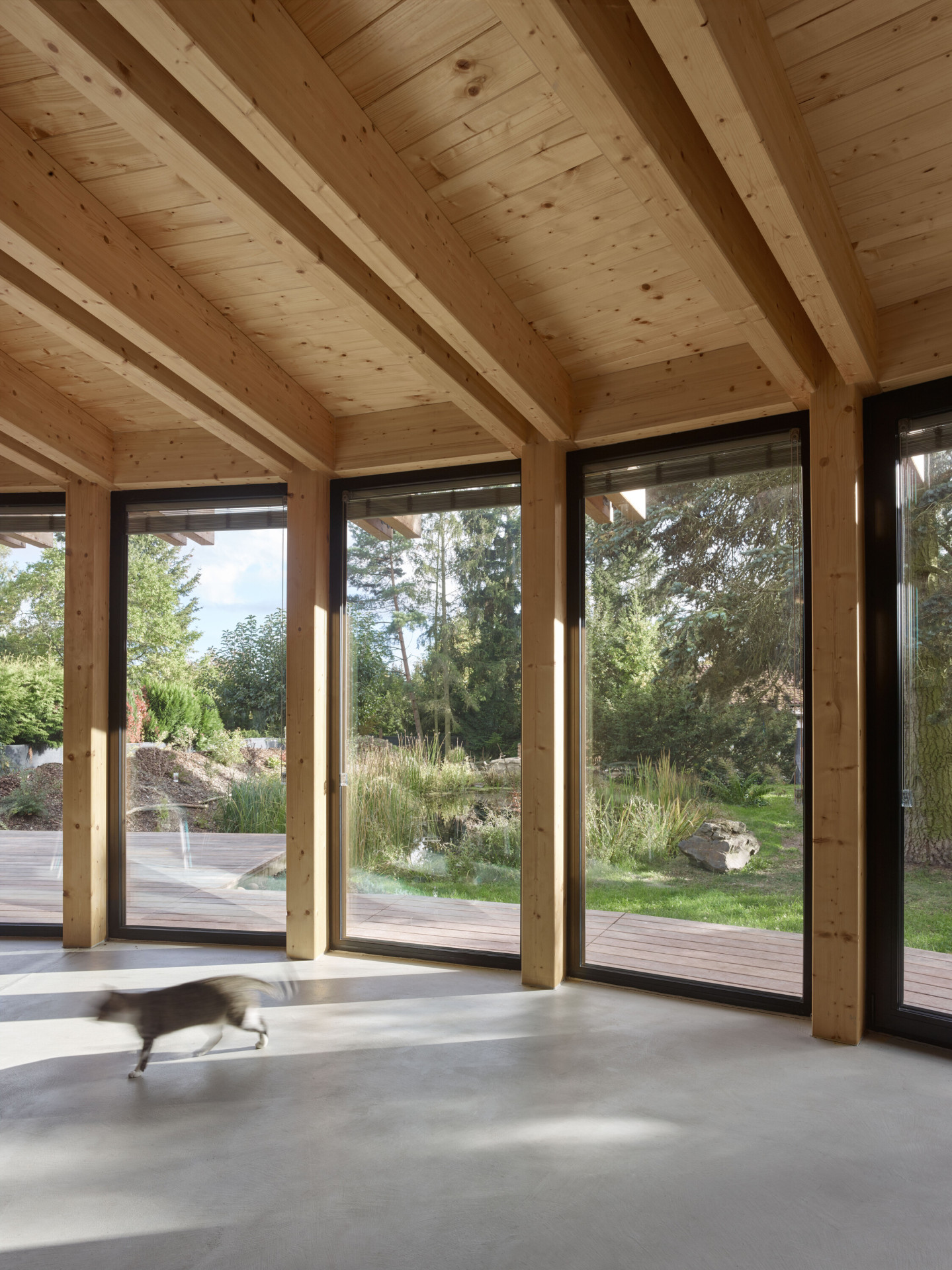 V průběhu realizace domu prošla úpravami i zahrada. Vzniklo v ní koupací jezírko, které zadržuje dešťovou vodu. Vybudována byla také kořenová čistička, která umožňuje zužitkovat odpadní vody pro zavlažování.