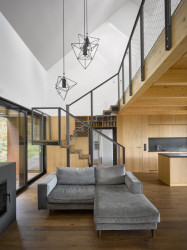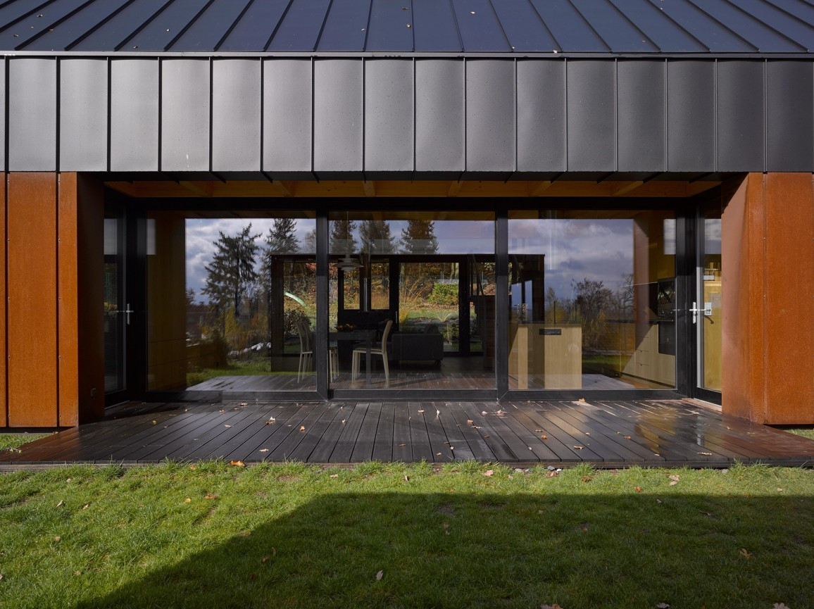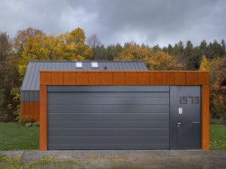 V sousedství lesa, na okraj Mníšku pod Brdy, navrhli architekti Ján Stempel a Jan Jakub Tesař dvoupodlažní rodinný dům. Konceptem projektu se stala hra objemů - samostojící garáž má přesné rozměry "díry" ve hmotě domu a zároveň tvoří vizuální bariéru při pohledu z ulice. Plášť obou objektů tvoří rezavý corten, u domu pak přechází v místě změny podlaží v elegantní černý plech.