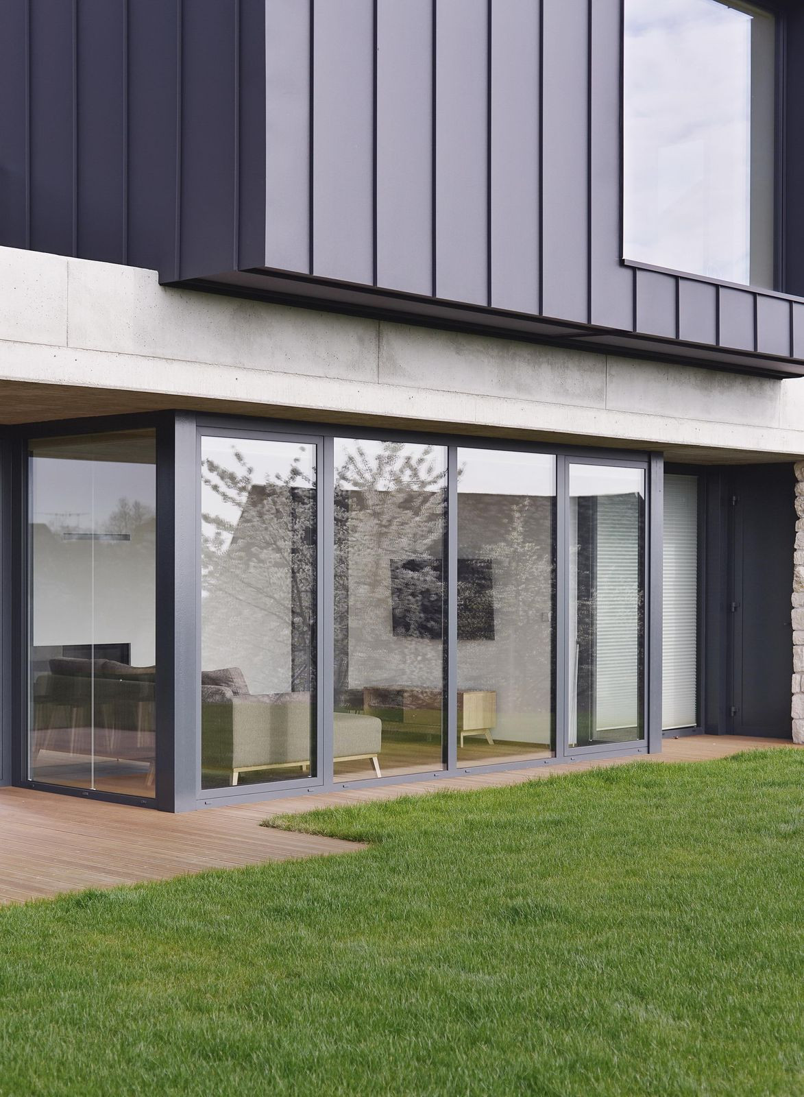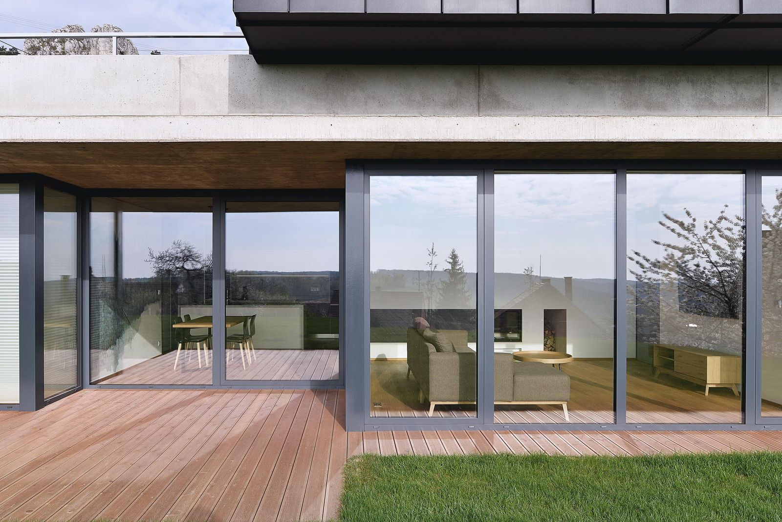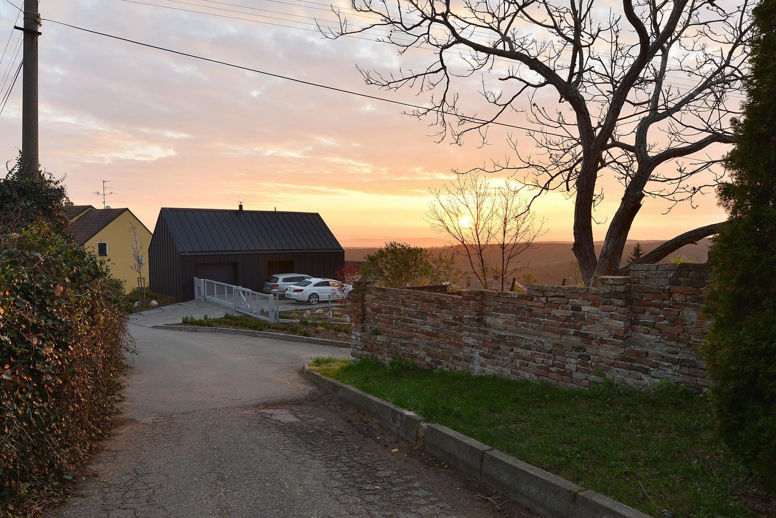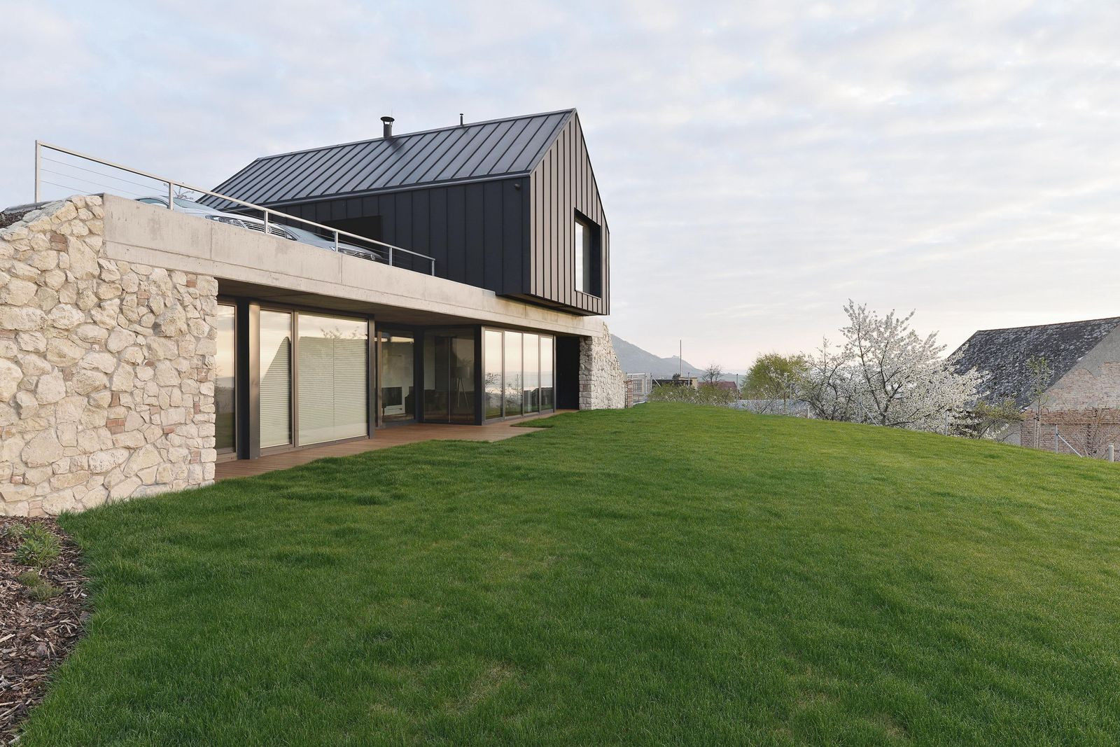 Respektované architektonické studio architektů prof. Jána Stempela a Jakuba Jana Tesaře řešilo při návrhu rodinného domu v malé obci v Pálavě protichůdné požadavky: klienti si přáli dům zapuštěný do terénu s rovnou střechou, nařízení CHKO ovšem nařizovalo stavbu se sedlovou střechou. Architekti situaci vyřešili tak, že na vlastní rodinný dům splývající se svažitým terénem postavili ještě jeden objekt sloužící jako vstup, garáž i kancelář, který dostal tradiční formu požadovanou krajinnými předpisy.