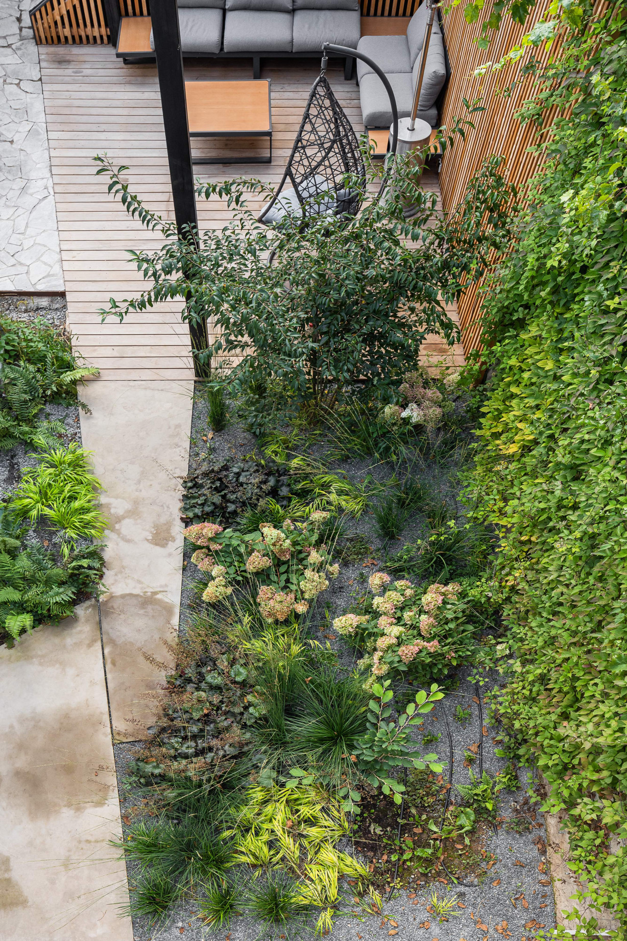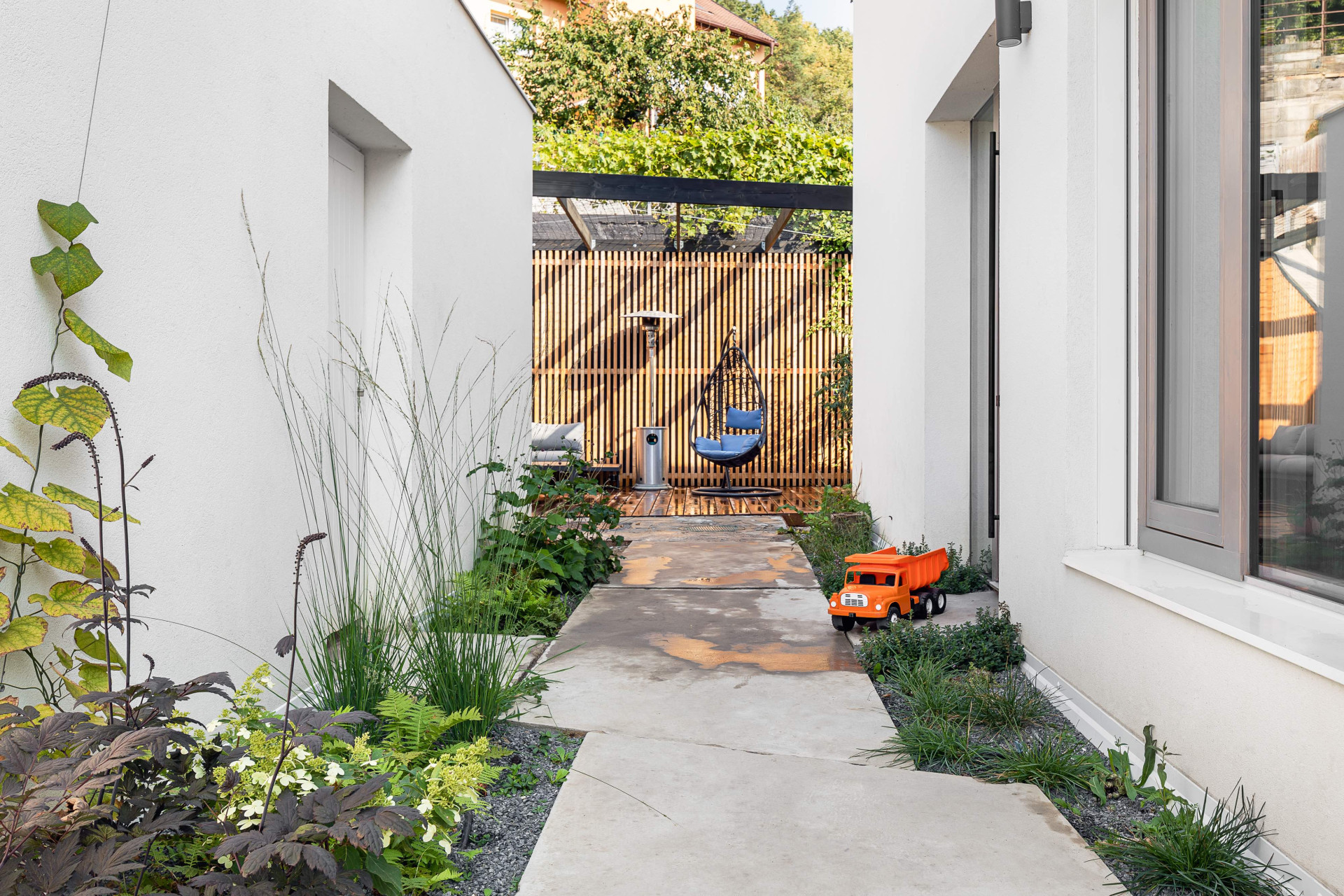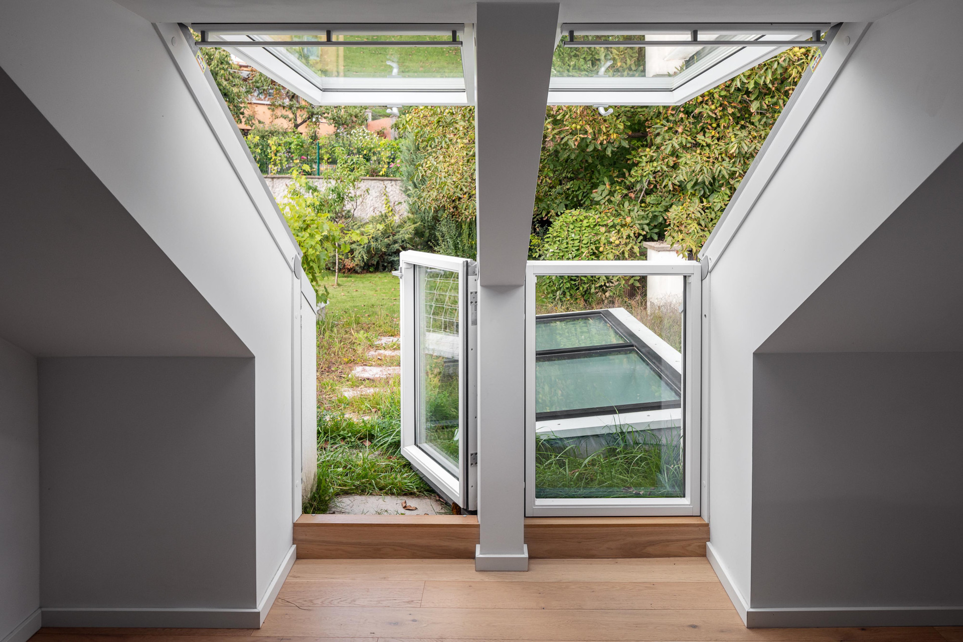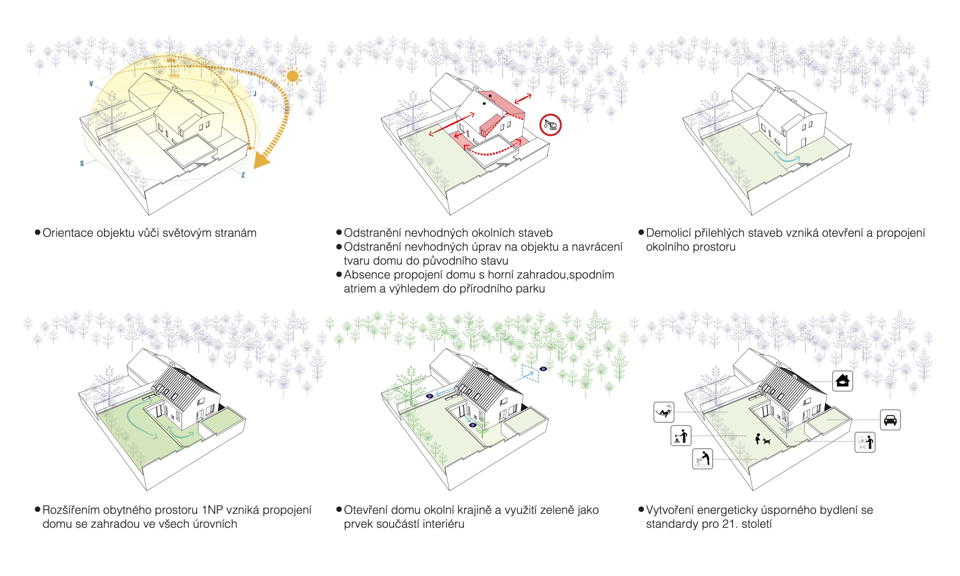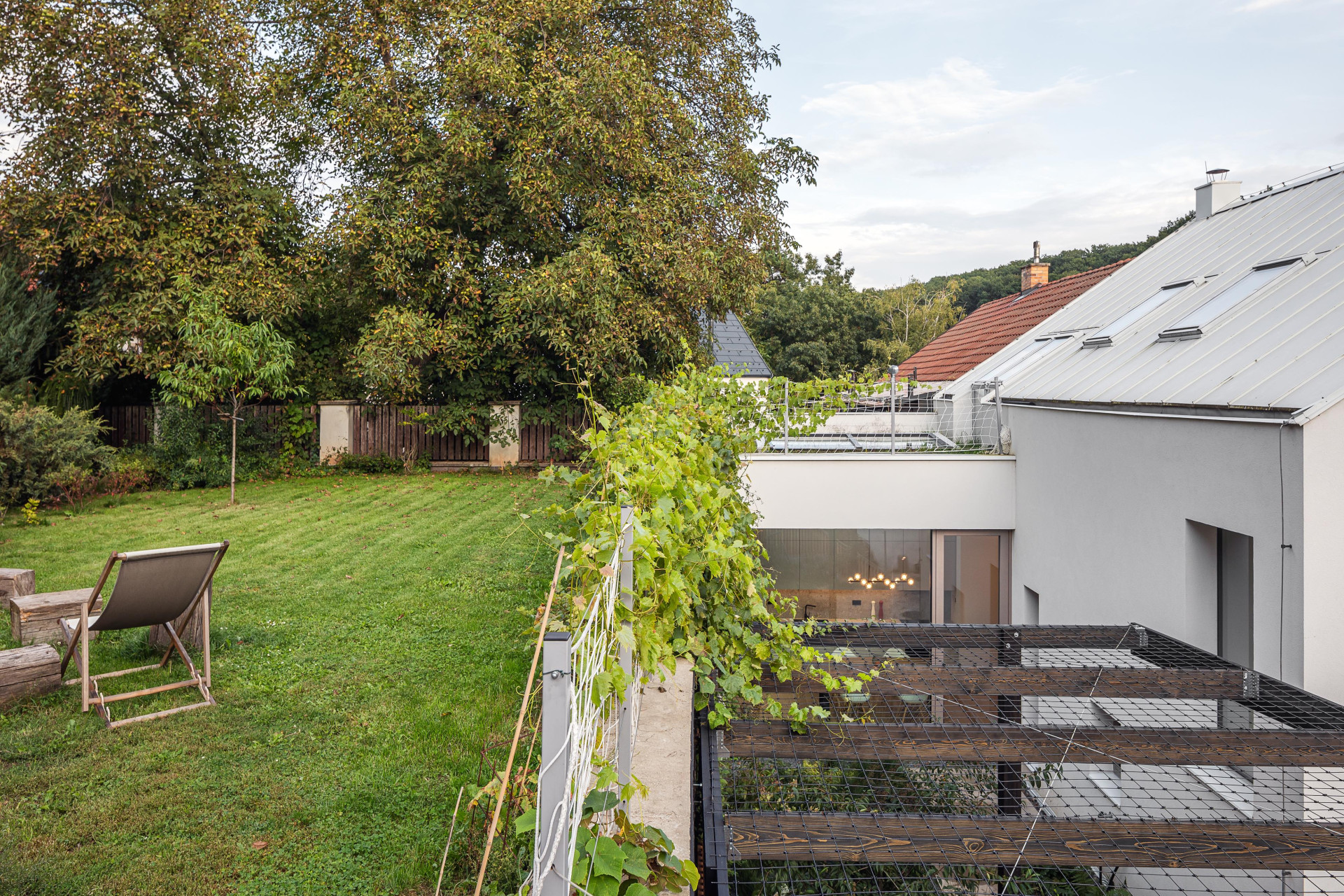 Propojení s přilehlou zahradou, která je dvojúrovňová, mělo být také co nejvíce funkční. „Pro dosažení konceptu došlo k odstranění střechy s různými nástavbami a vytvoření původního sedlového tvaru, přesunutí garáže, jež rozdělovala spodní zahradu na 2 nelogické celky a přistavění jídelny s kuchyní, která díky své zelené střeše navazuje na horní zahradu a umožňuje tak přímé propojení s horním patrem domu,“ popisuje architektka. Z obývacího pokoje se nyní otevírá výhled do blízkého přírodního parku, z kuchyně se zase dá vejít do pobytového atria, které obestupuje okolní zástavba.
