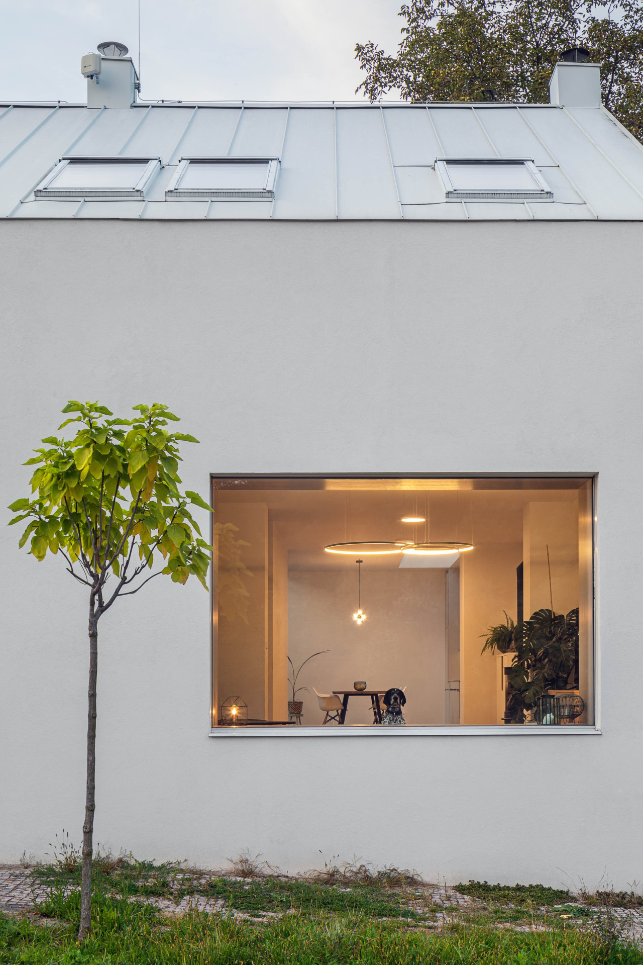 Dům obklopený pro lokalitu charakteristickými venkovskými domy se svým průčelím obrací k přírodnímu parku Smetanka. Jeho další strany pak směřují do vlastní zahrady. Otevřít interiéry výhledům do obklopující zeleně bylo jedním z hlavních přání klientů Ivety Langerové. Pokoje proto dostaly velká okna, kuchyň s jídelnou navíc osvětluje velký střešní světlík, za pozornost stojí také prosklení v čele schodiště.