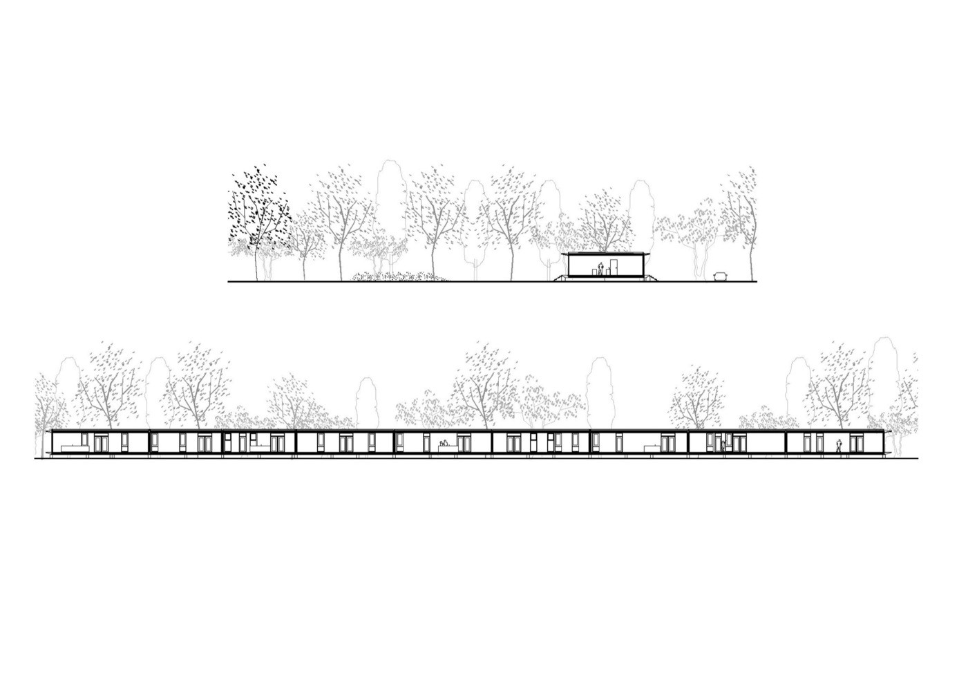 Přístup architektů byl velmi racionální. Omezený rozpočet využili pouze na návrh „schránky“ domu, který tvoří 100 metrů dlouhý prosklený jednopodlažní hranol. Dům rozdělili na devět samostatných prostorů o jednotné velikosti 160 metrů čtverečních, které umožňují naprostou dispoziční svobodu jejich využití. Přirozené světlo do interiéru přichází z obou delších stran kvádru. K nim předsazená veranda krytá slunolamy pak přispívá ke komunitnímu životu.