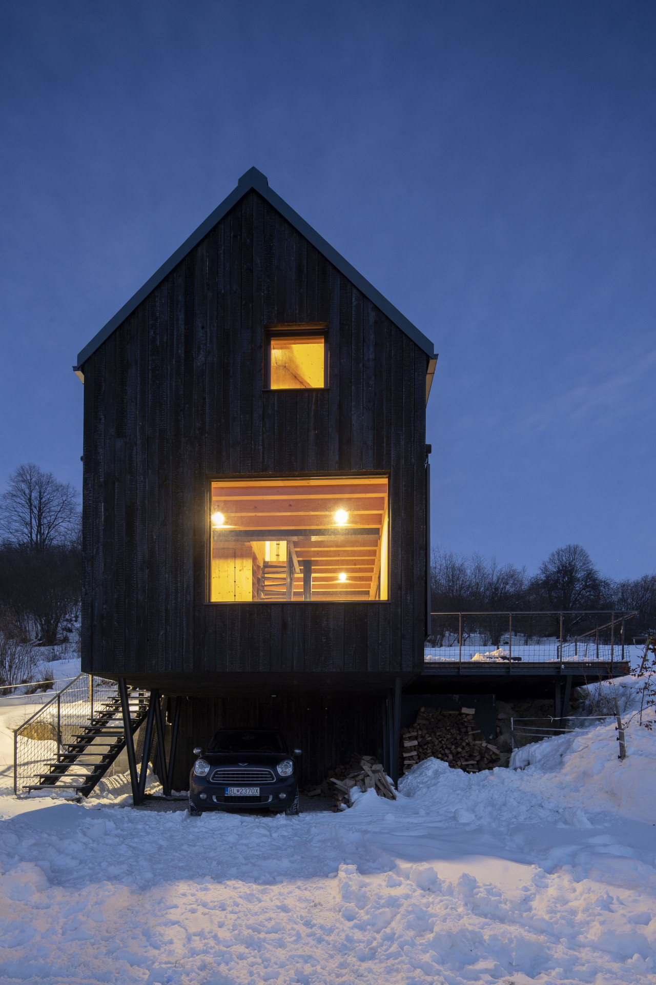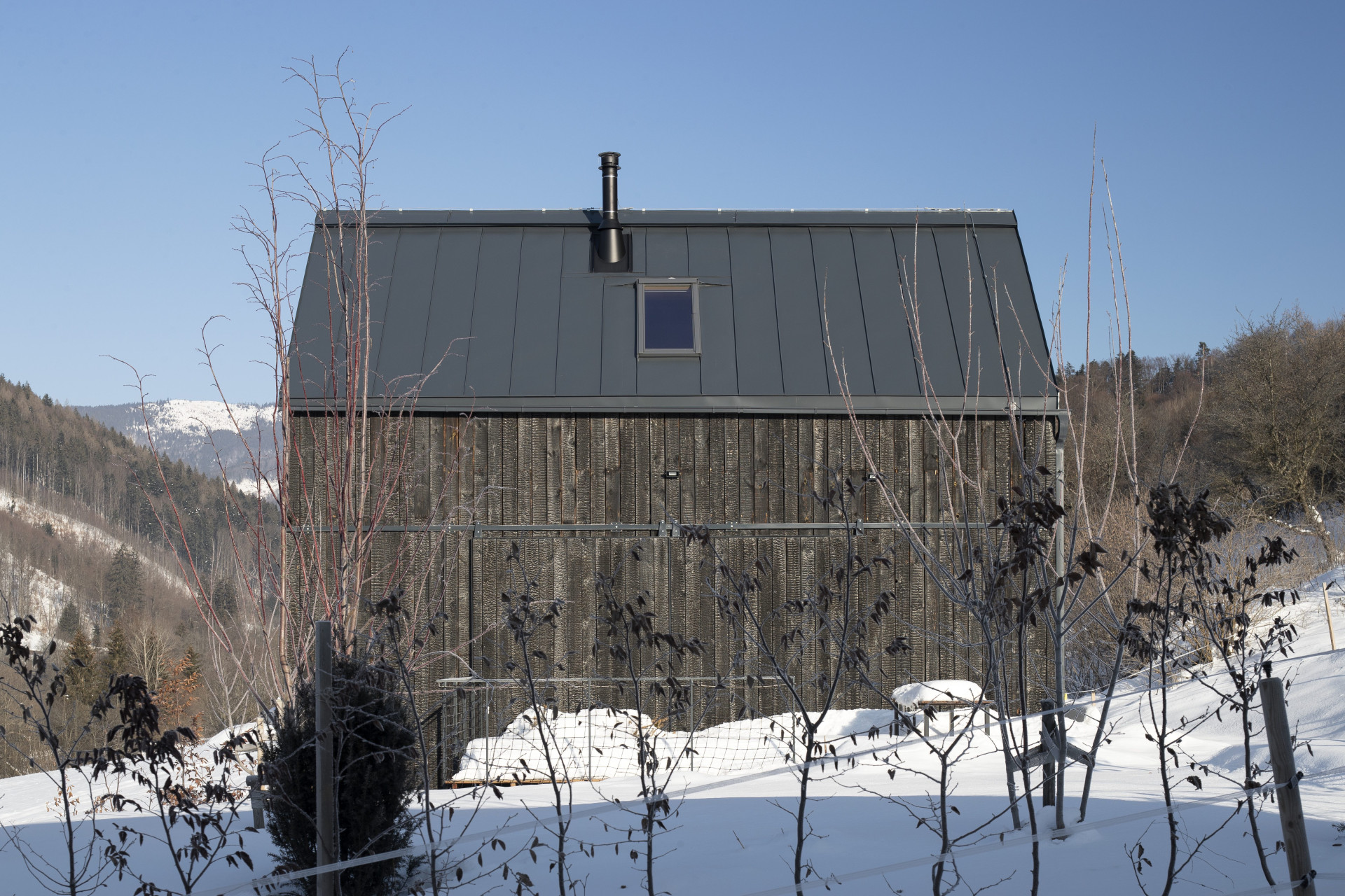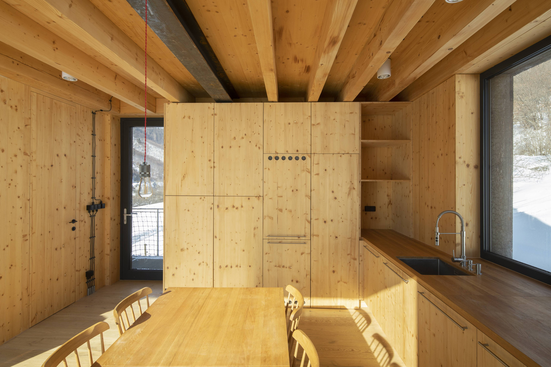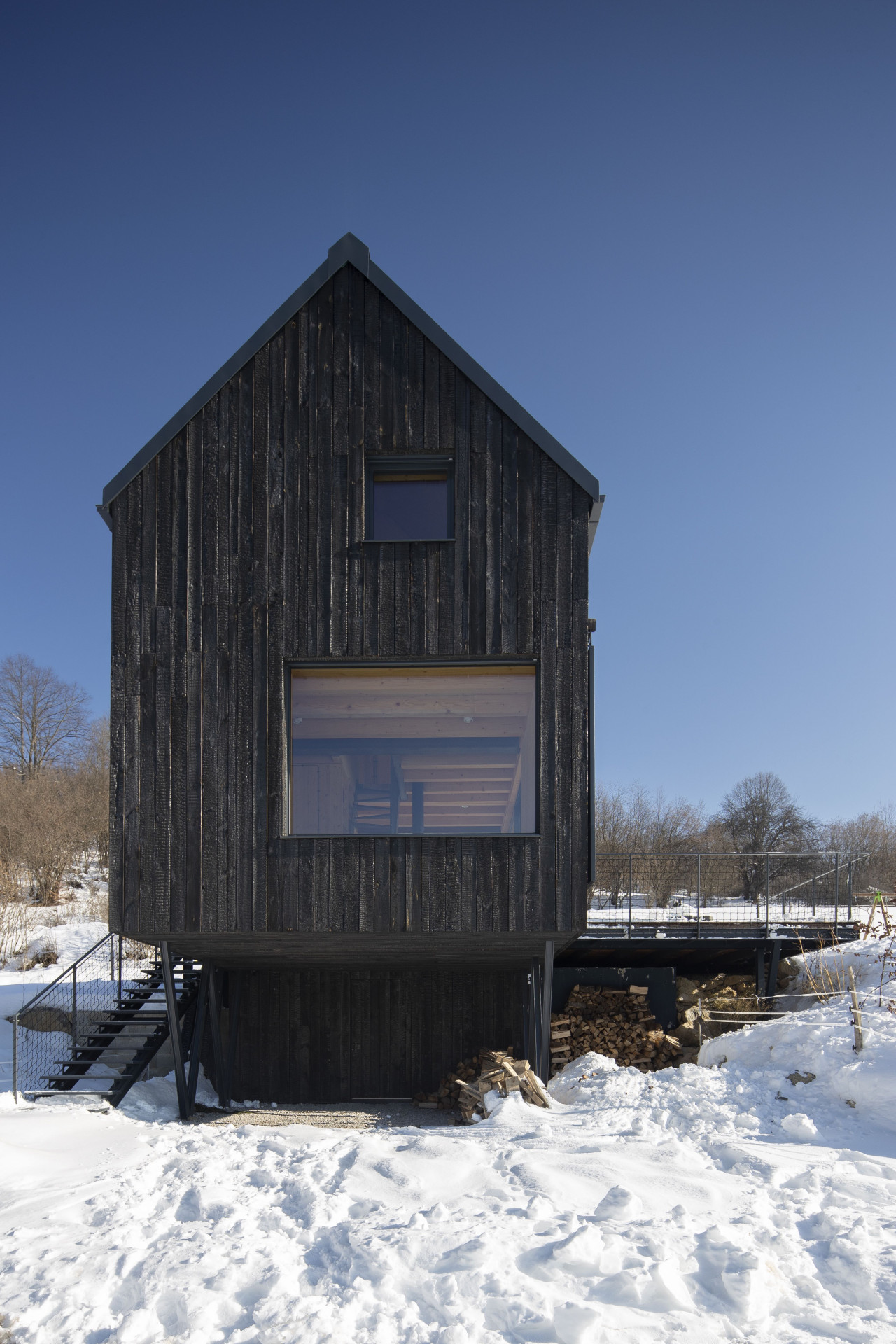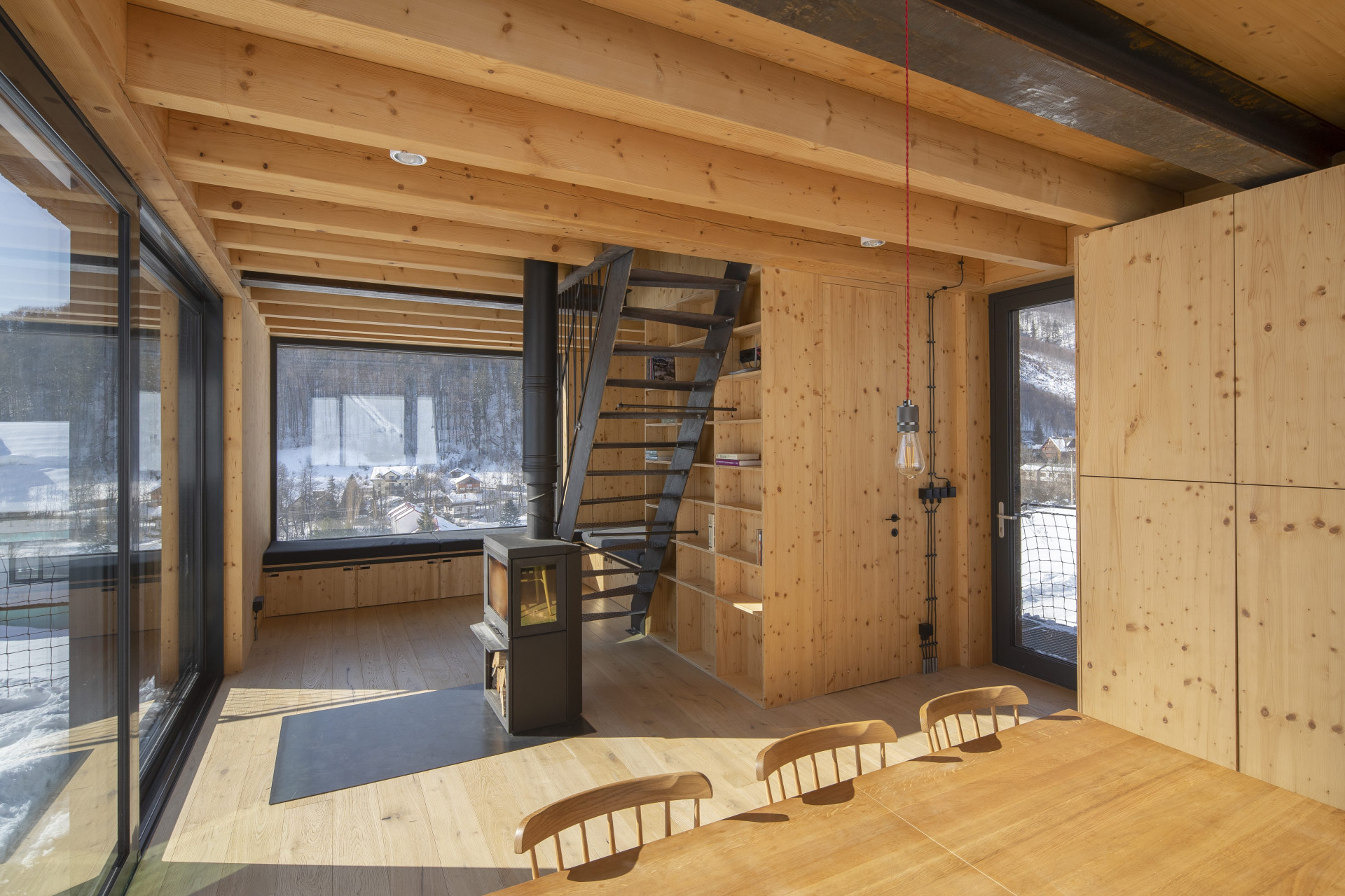 Zastavěná plocha domu zabírá pouze 50 metrů čtverečních, vedle nenápadného vzhledu tak má také pokornou velikost. Hlavním materiálem se stalo dřevo – a to jak v konstrukci, tak interiéru i vnějším plášti. Ten je tvořen vertikálně kladenými borovicovými prkny s opalovaným povrchem po vzoru japonské techniky Shou Sugi Ban. Takto ošetřené dřevo dobře zvládá odolávat i náročným klimatickým podmínkám, které v horském prostředí panují.