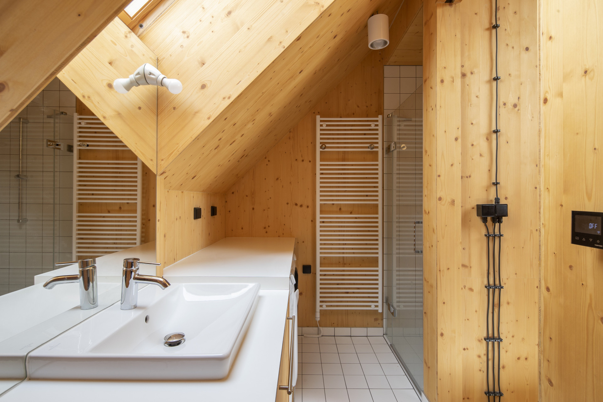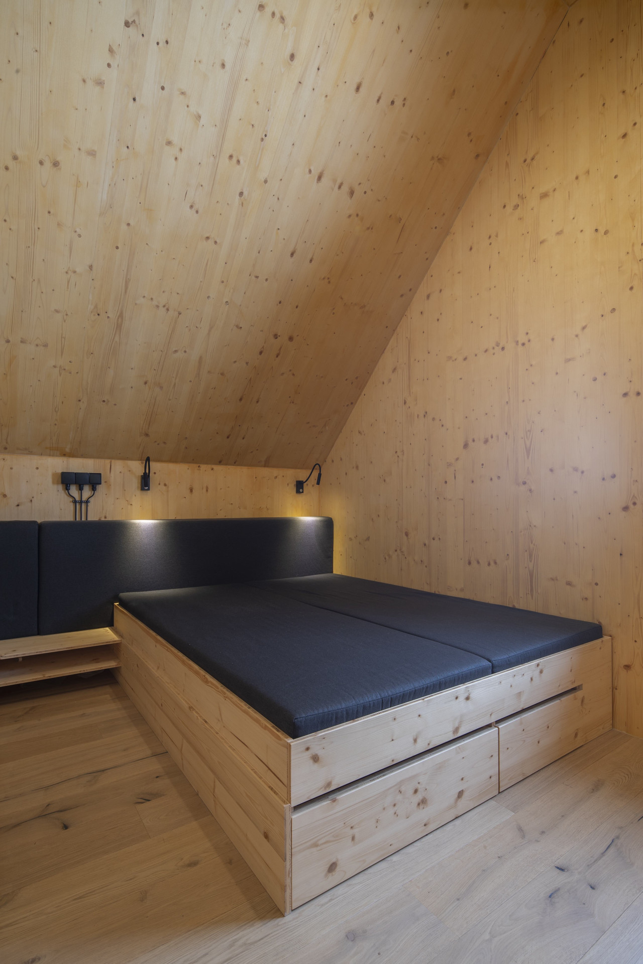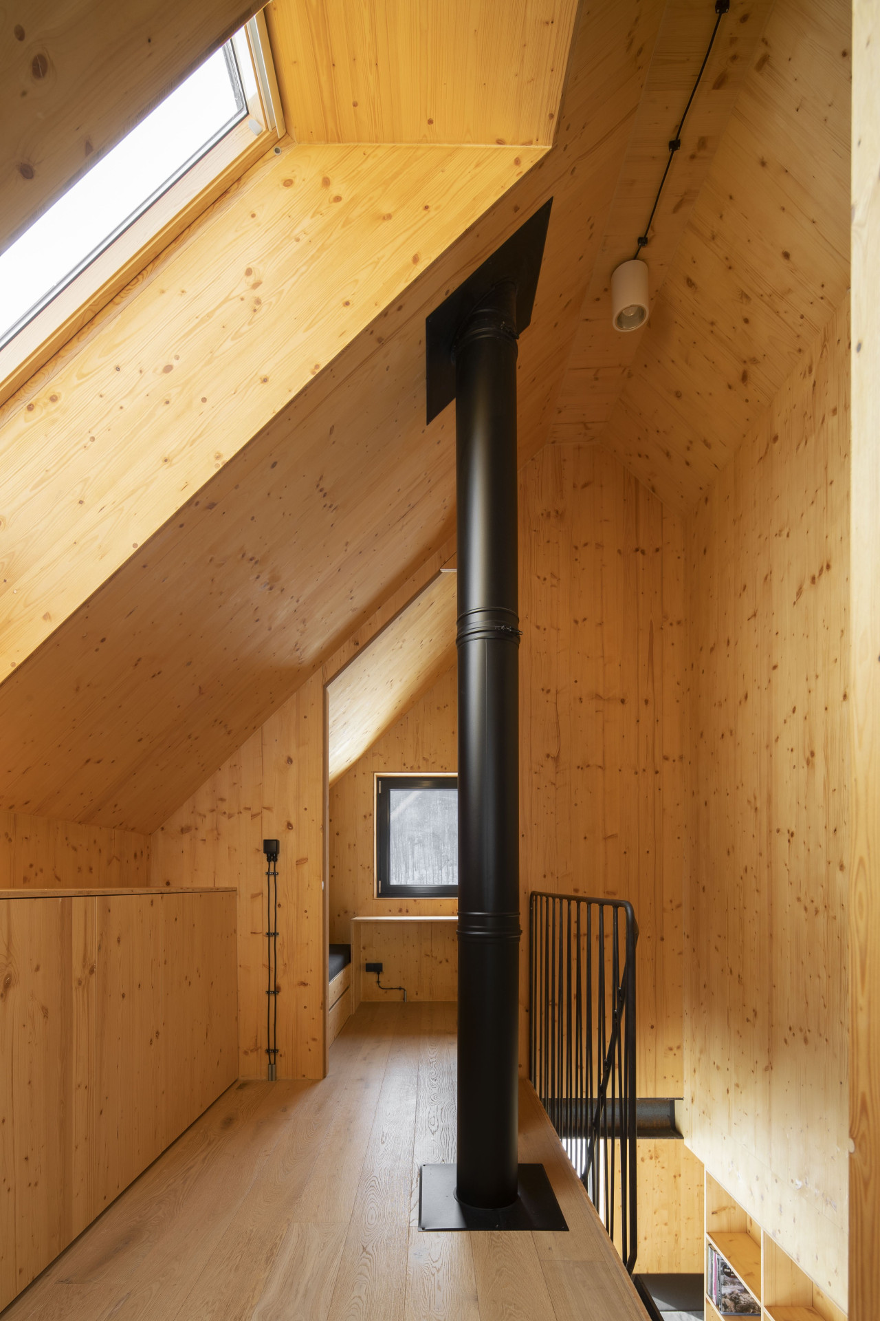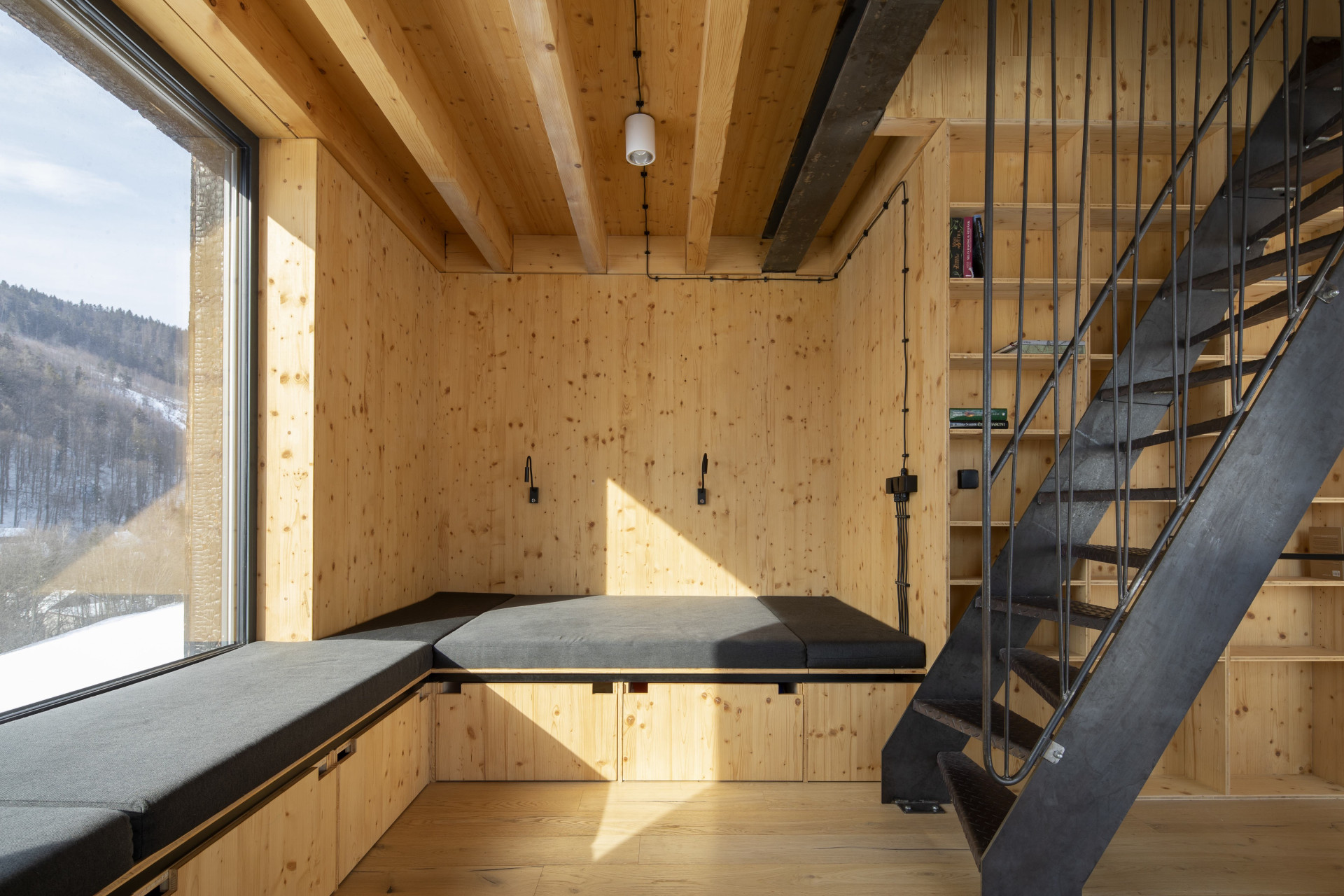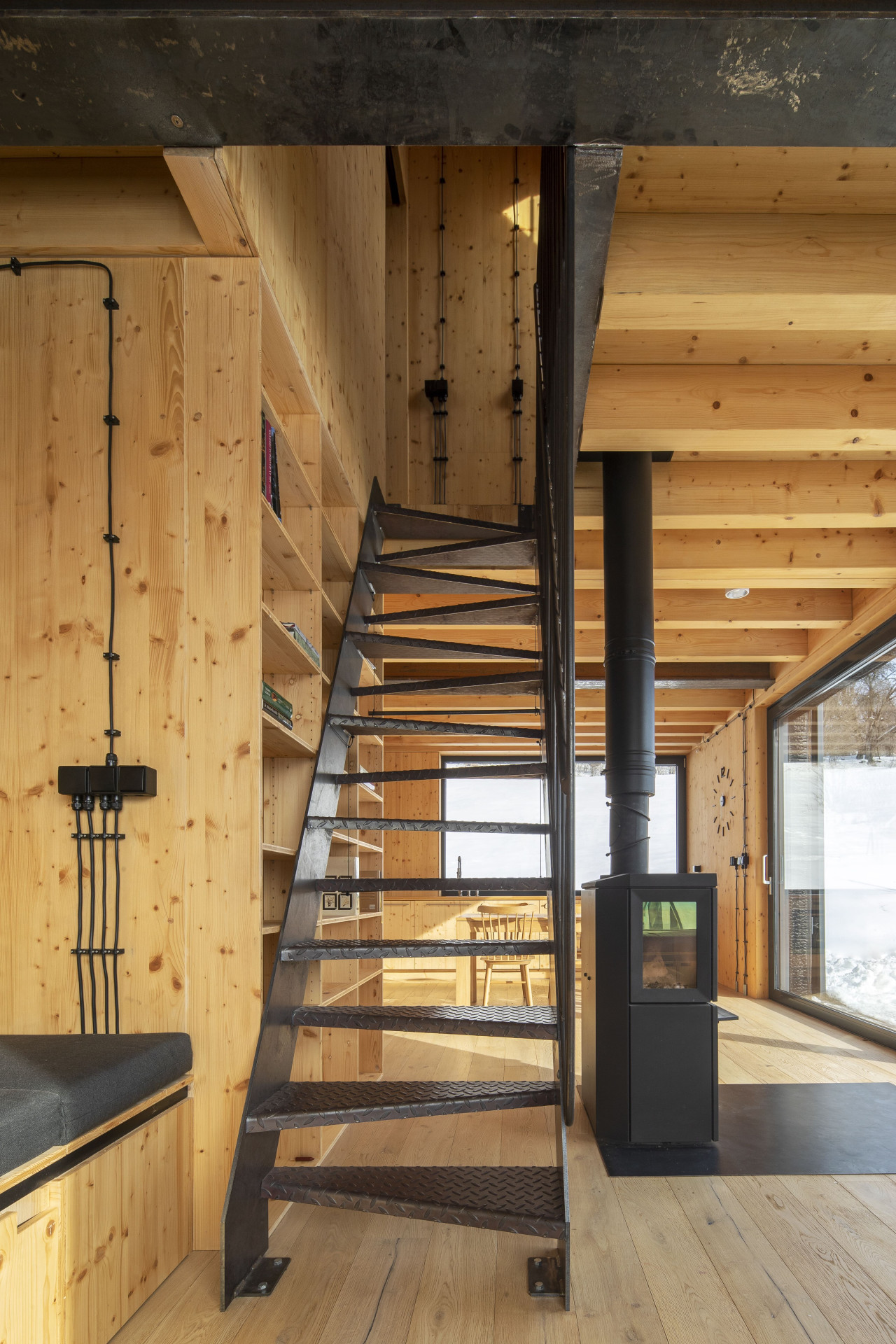Obklady stěn i vybavení jsou provedeny ze smrkových biodesek, ty byly pouze naolejovány, takže si dřevo zachovalo svou charakteristickou barvu i kresbu. Detaily, stejně tak i ocelové schodiště, které propojuje přízemí a patro s ložnicemi, jsou tmavé jako exteriér chaty.