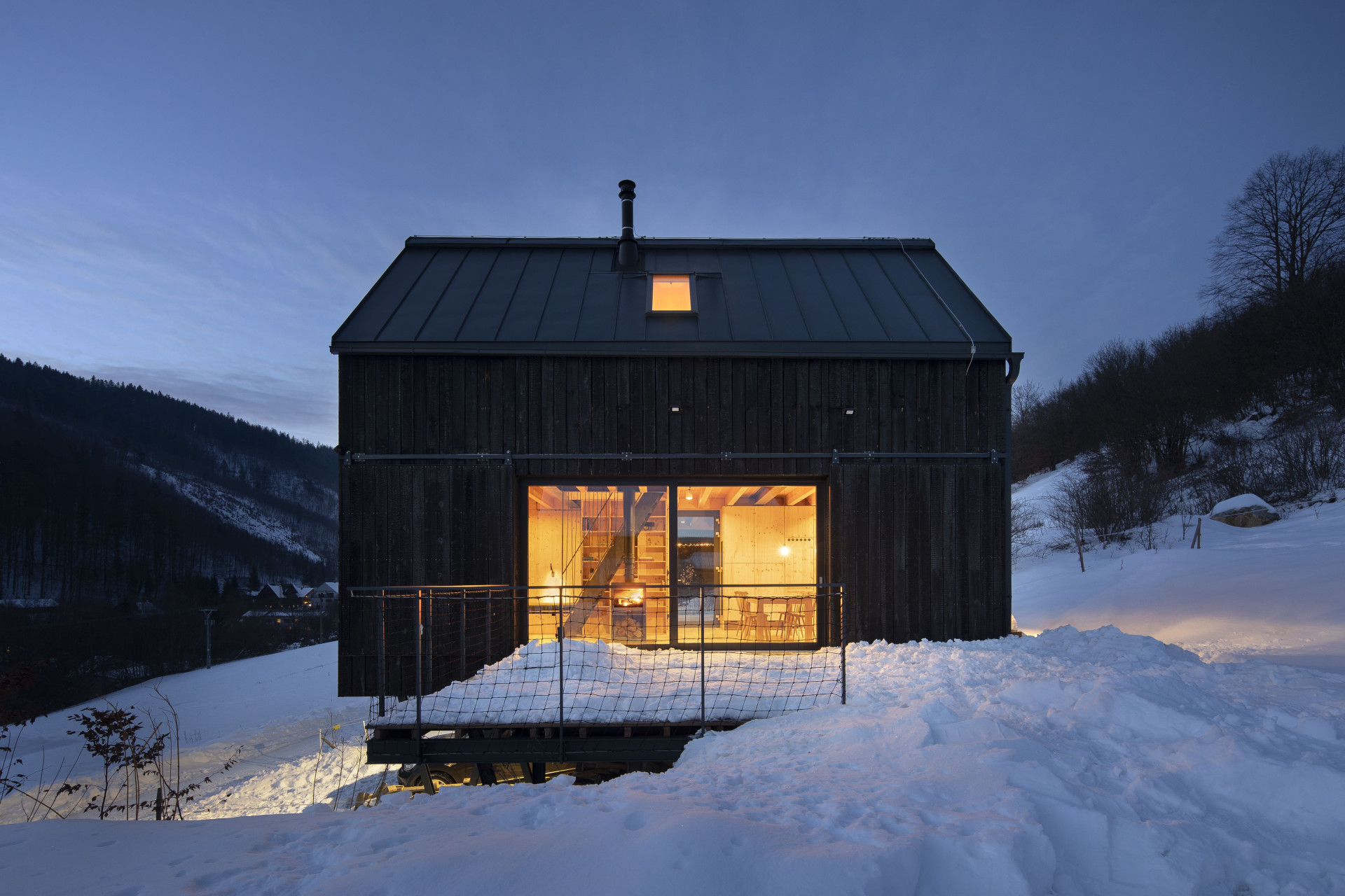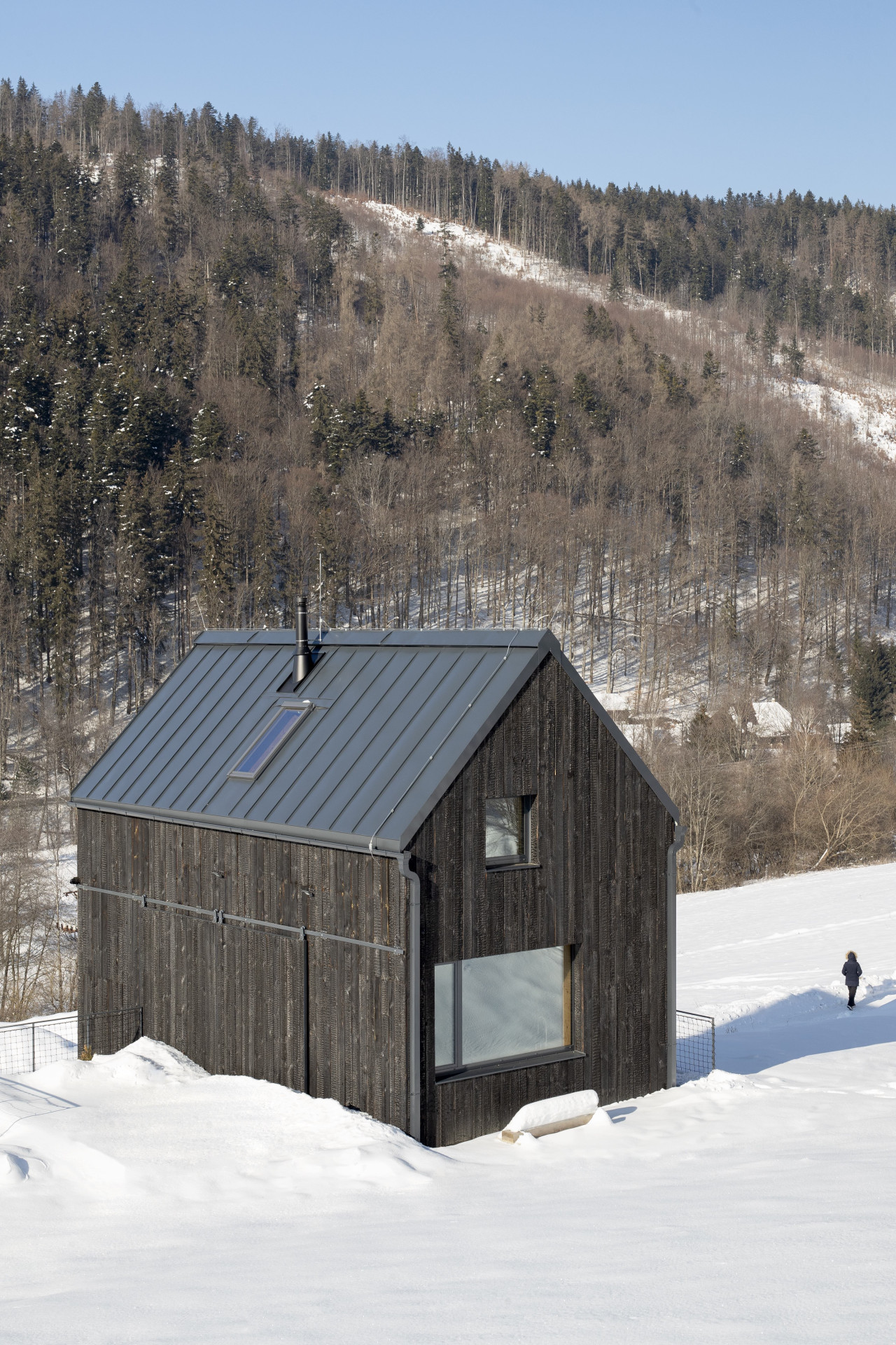 Malá stavba v Nízkých Tatrách se při dálkových pohledech ztrácí ve svém okolí. Díky tmavému dřevěnému obkladu a plechové střešní krytině se v úpatích kopců s lesy chová decentně. Když v ní zrovna nejsou její majitelé, schovají se za dřevěnou fasádu i nevětší skleněné plochy.