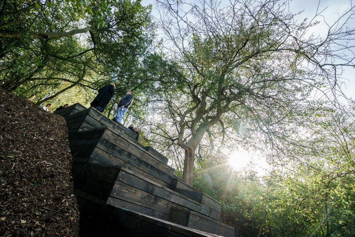 Výsledkem je pobytová lavice ve formě tribuny, která nabízí různé úrovně sezení. Přístupná je dobře z horní i spodní úrovně. Konstrukce lavice je dřevěná z masivních 160mm KVH nosníků, opláštěná prkennou palubou. Dřevěné prvky jsou chráněny silně ředěnou vrstvou lazury, takže prosvítá kresba dřeva, a lavice díky šedému tónování splývá se svahem a okolím.