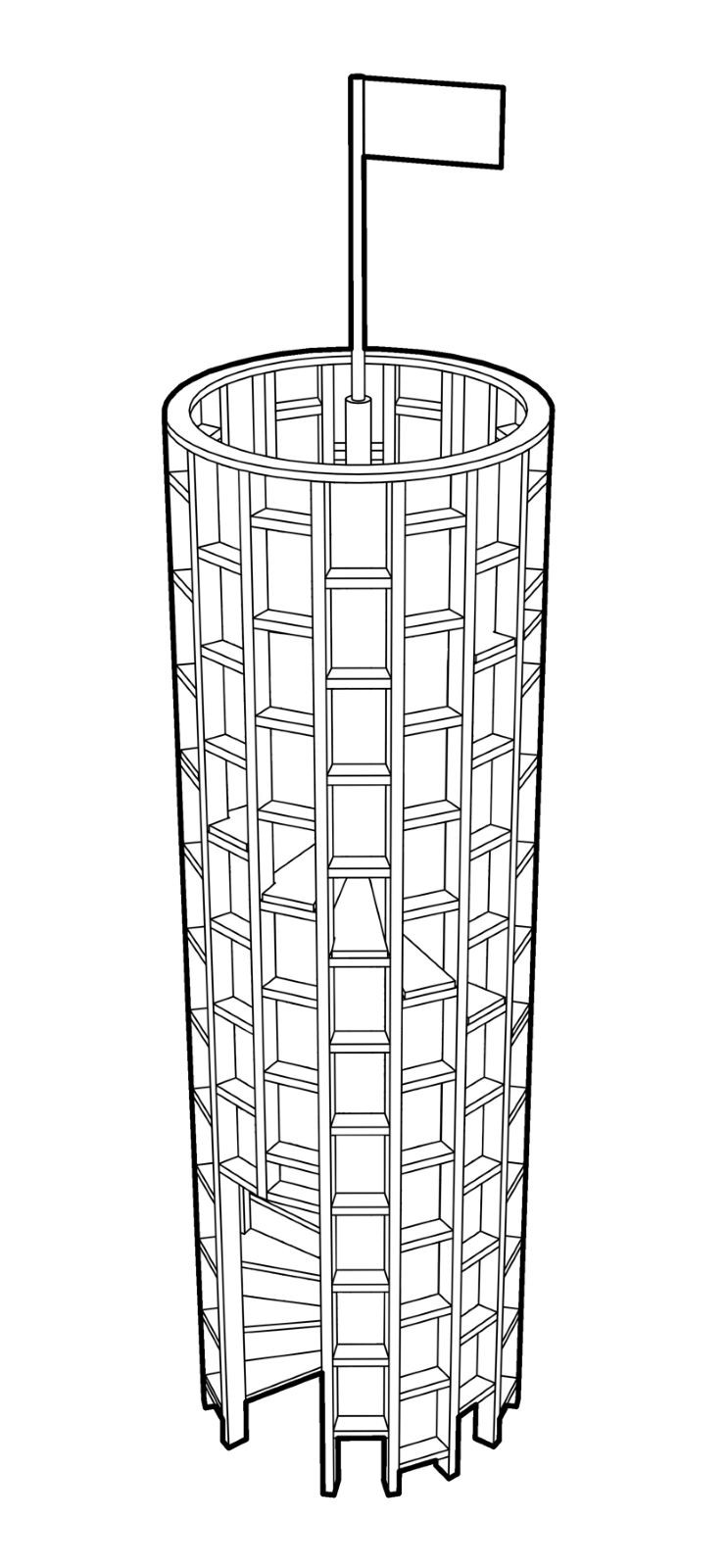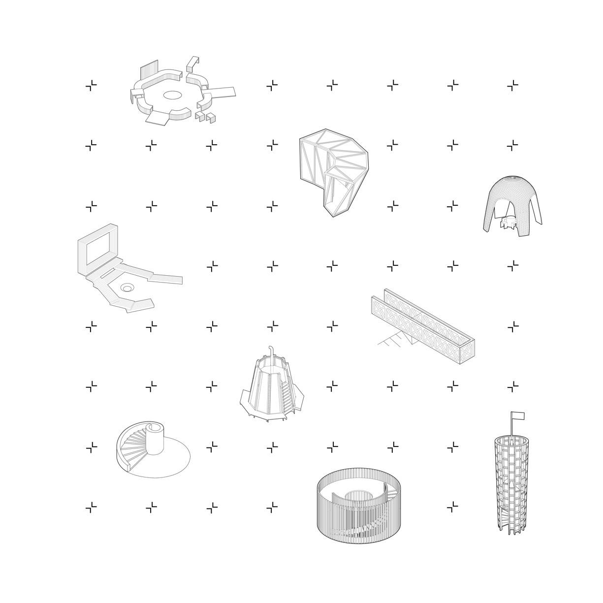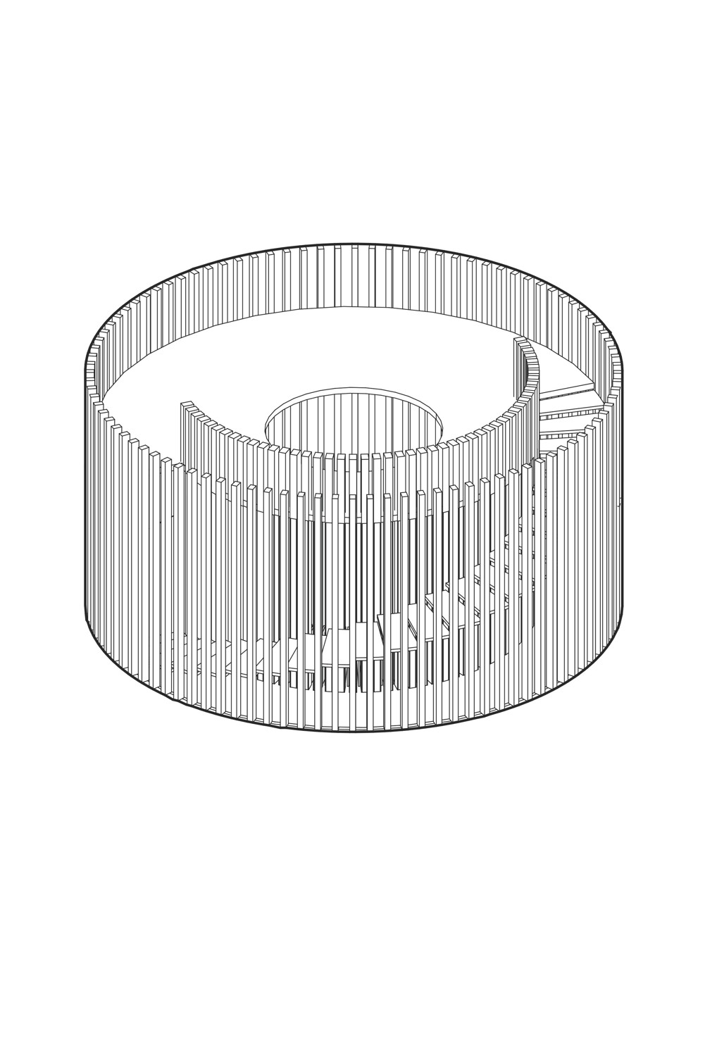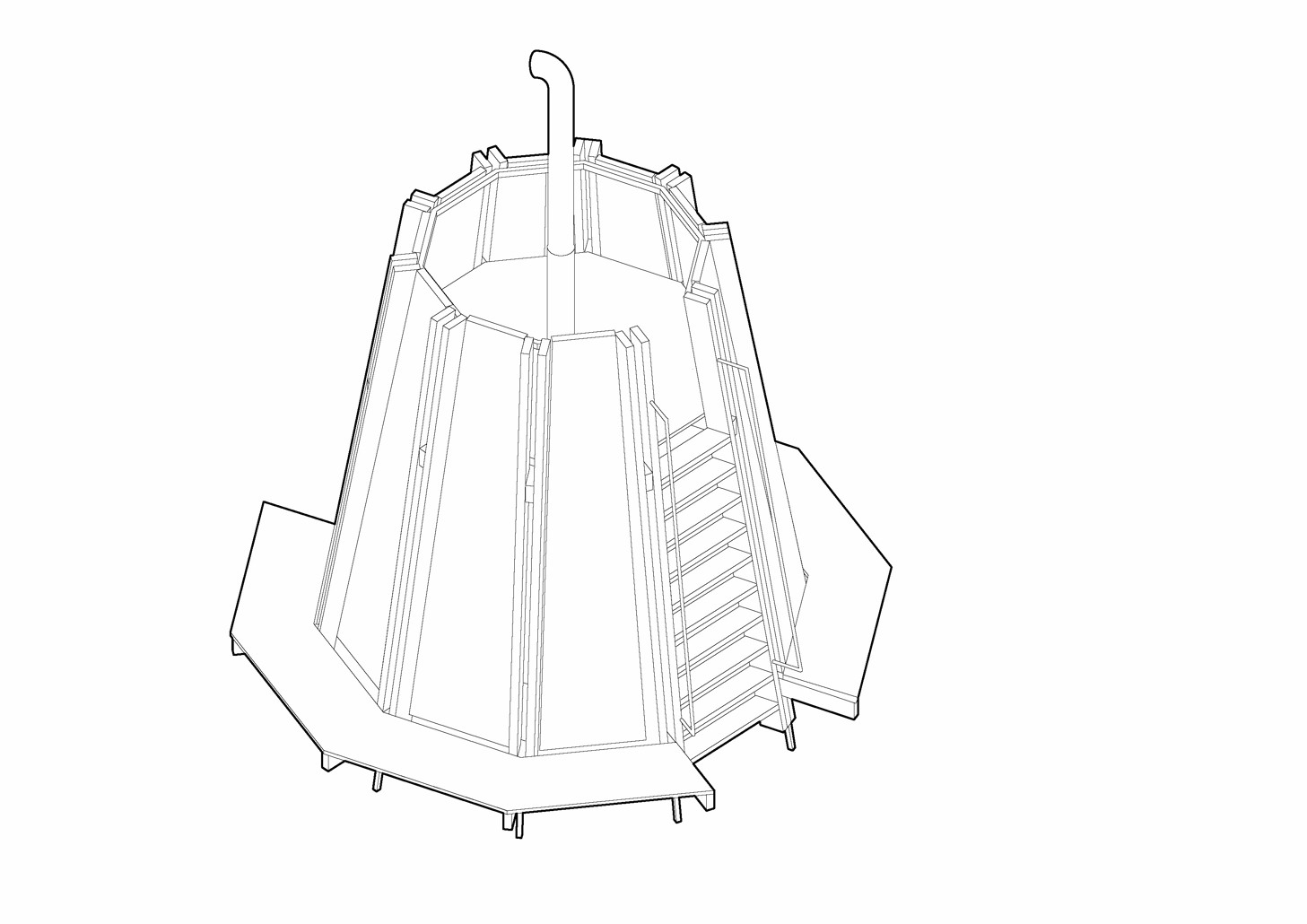 Spirála, umístěná na terénním výběžku, je odpovědí na základní požadavky návštěvníka parku. Nabízí • úkryt, obohacený o hru světla pronikajícího skrz dřevěné lamely, • výhled, jako odměnu za výstup po točitých schodech, • odpočinek, v síti napnuté pod oblohou.