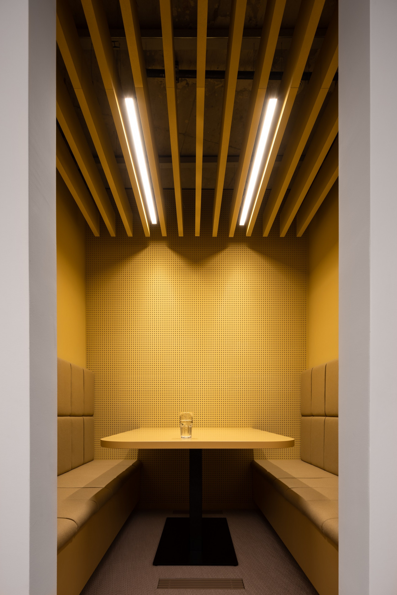 Monochromatická žloutkově žlutá je kromě příček v kancelářích použitá také v telefonních kupé a v dalších interiérech v technickém zázemí, takzvaném vajíčku. Jeho zaoblený vejcovitý tvar inspiroval architekty k volbě barev – zvenku je použitá skořápkově bílá a zevnitř již zmíněná žlutá. Kromě dvou malých telefonních místností jsou ve „vajíčku” umístěny také serverovna, původní toalety, dvě menší zasedací místnosti, nika pro kopírky a prostor pro malou kuchyňku.