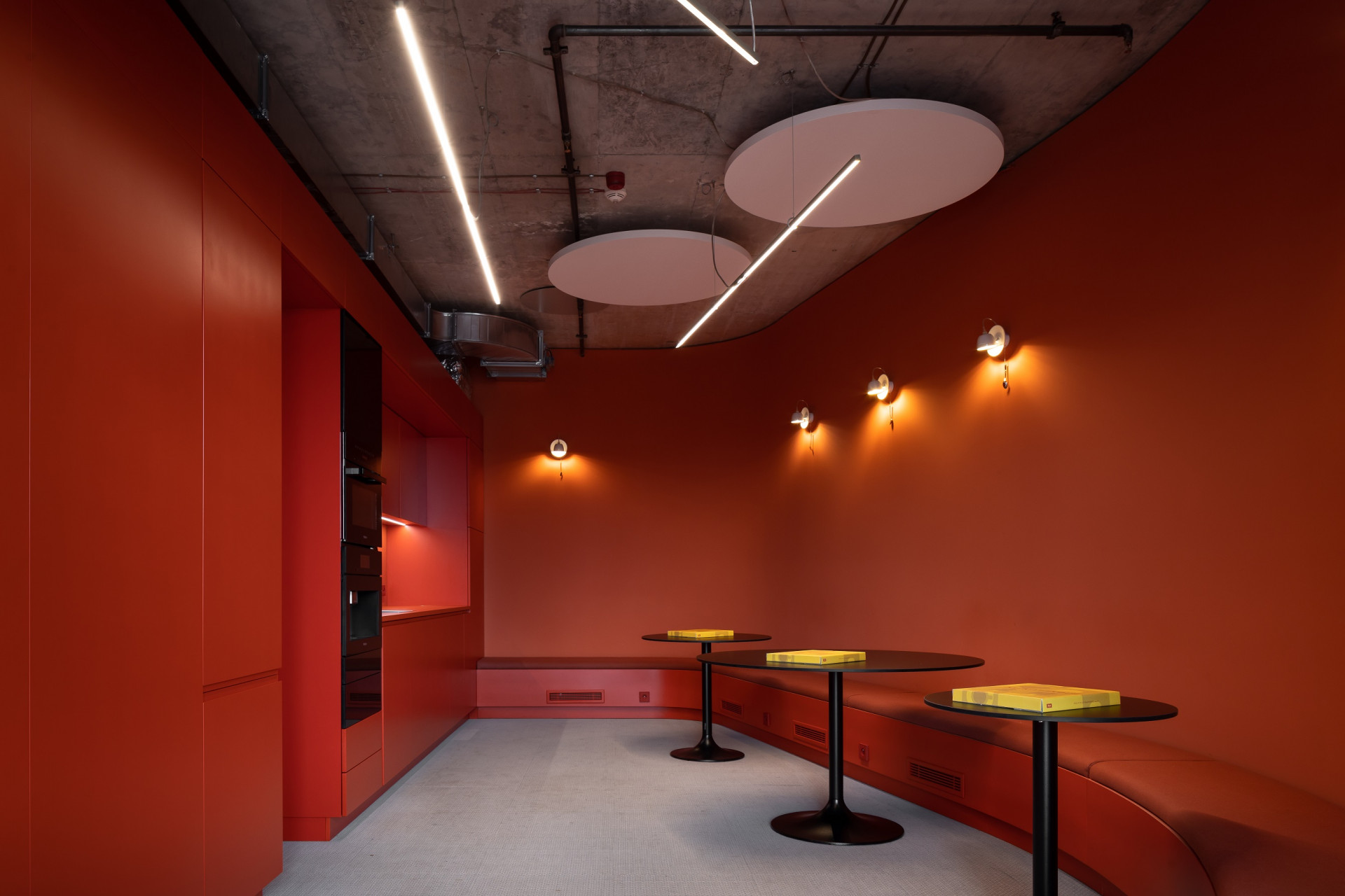 Ty se objevují na panelech v červeném, zeleném, oranžovém nebo žlutém provedení v nově vzniklých kancelářích a zasedacích místnostech okolo fasády, do kterých se nově vejde celkem osmdesát osob. Dřevěné, prosklené či akustické vertikální panely navržené na míru vytvářejí dohromady příčky a některé z nich slouží také jako úložné prostory. Mezi další výrazně barevné prvky patří hlavní kuchyňka provedená celá v červené barvě a mobiliář pečlivě vybraný nizozemskými designéry.