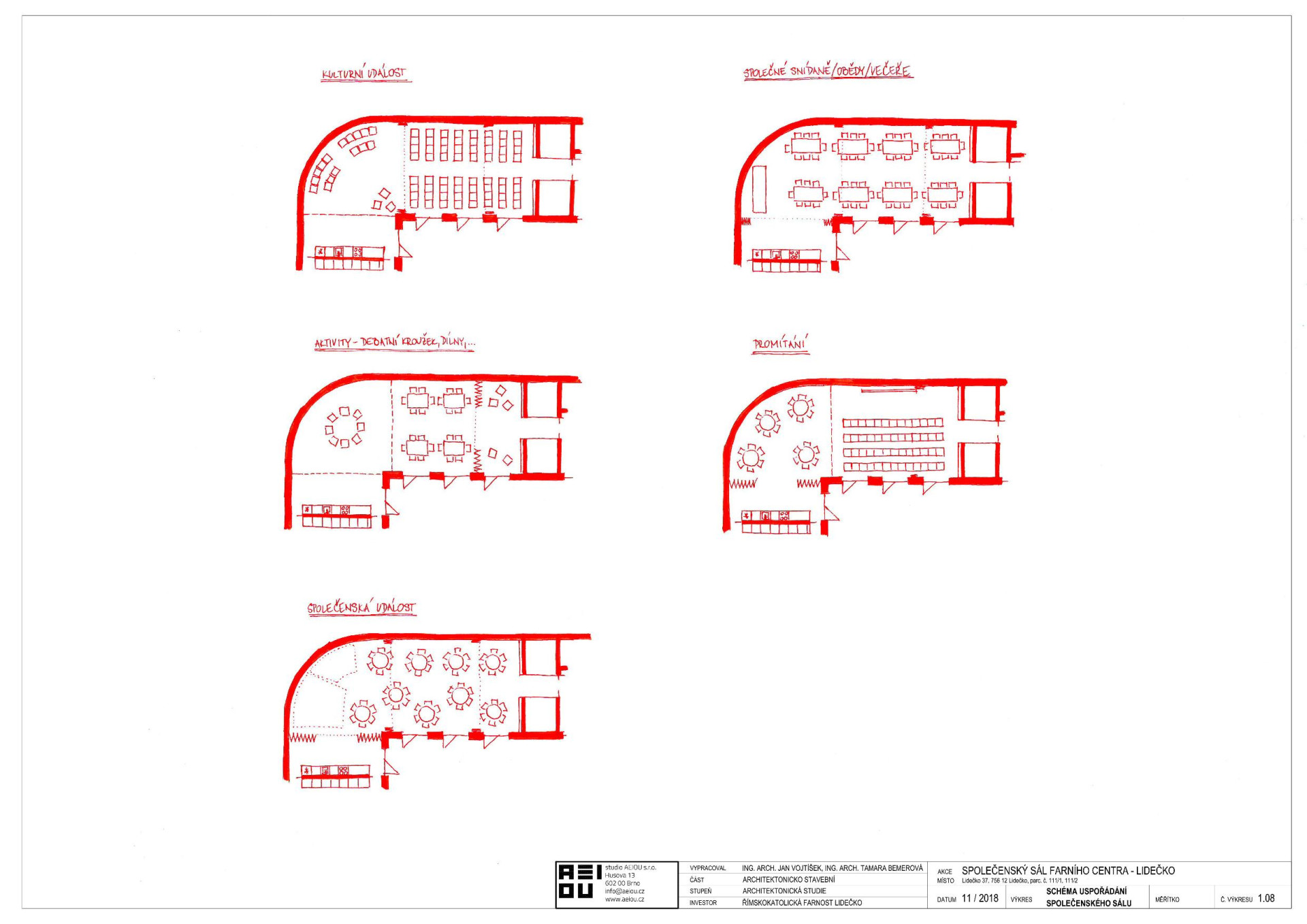 Z charakteru lokality vyšlo také zadání, kterým byl víceúčelový a dispozičně variabilní společenský sál pro farnost. Zároveň ale měl být určen i pro místní spolky, v obci fungují různé divadelní spolky, hasičské sdružení, loutkové divadlo a další. Od začátku bylo jasné, že centrum bude využívat i obec, to hezky ilustruje, jak v Lidečku společně lidé fungují. Církev v čele s místním odvážným/stmelujícím/šikovným/