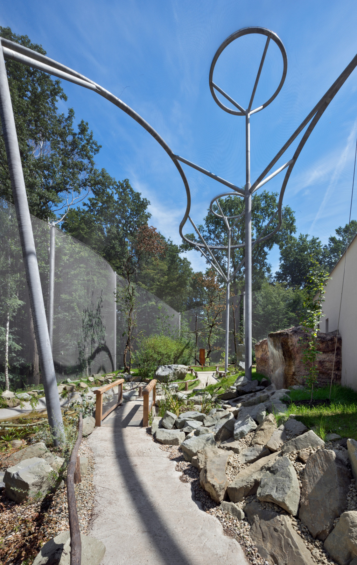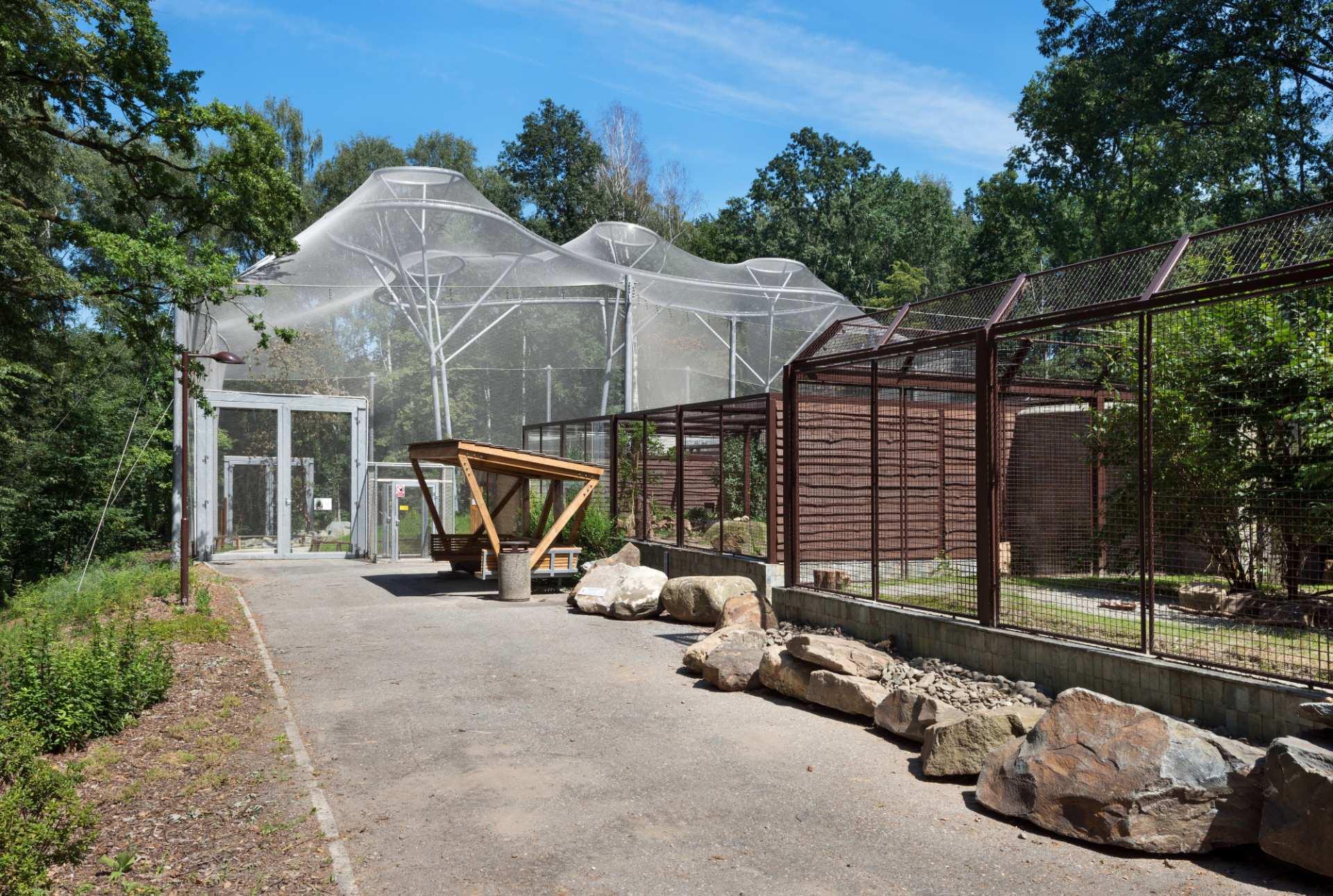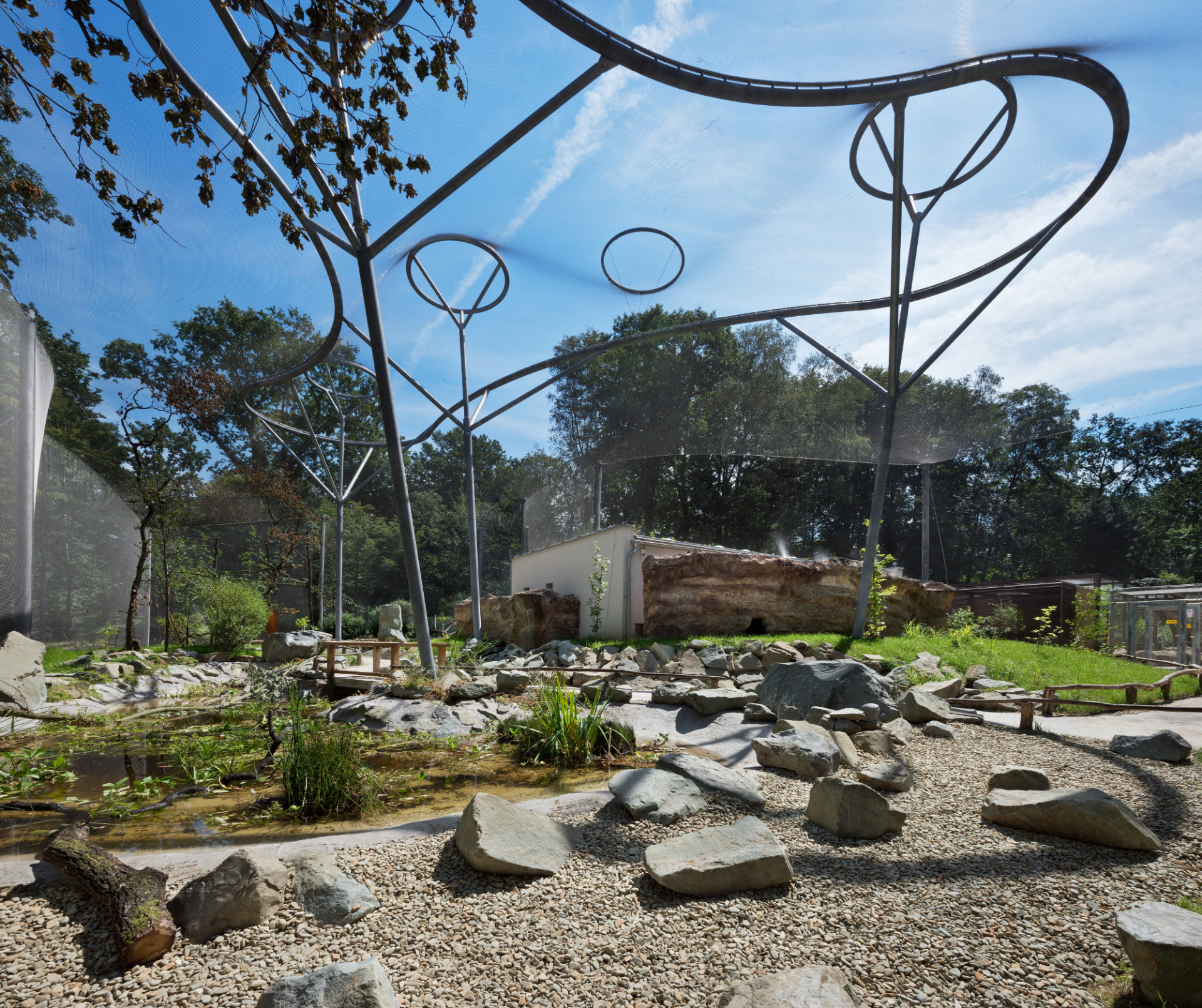 Elegantní, lehké a vzdušné tvarosloví voliéry tvoří na míru navržená nosná konstrukce promyšleného systému sloupů a táhel, založených na mikropilotech. Na nosný systém navazují zdánlivě levitující, téměř neviditelné stěny a zastřešení tvořené nerezovou splétanou sítí.