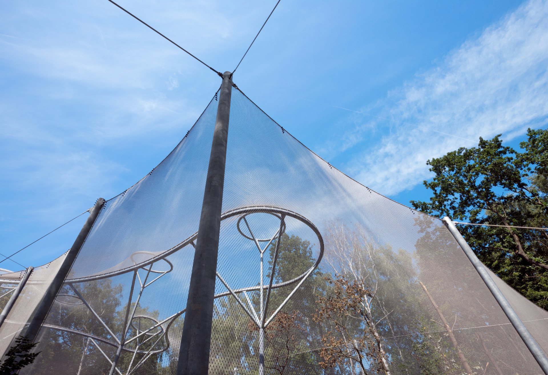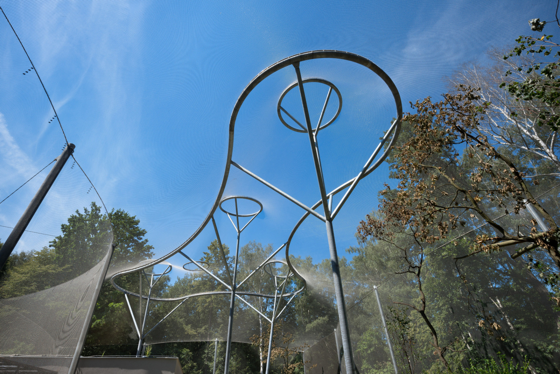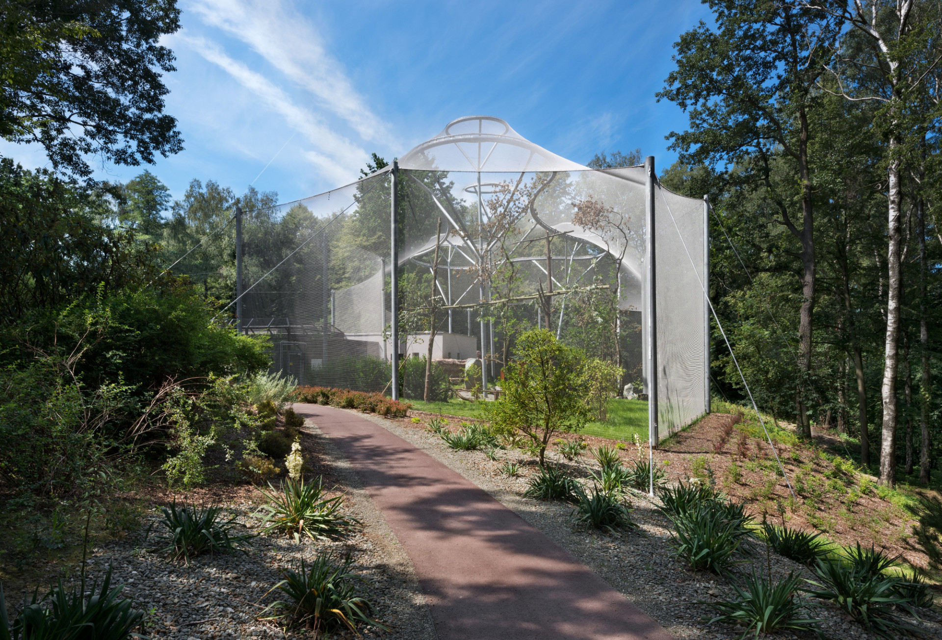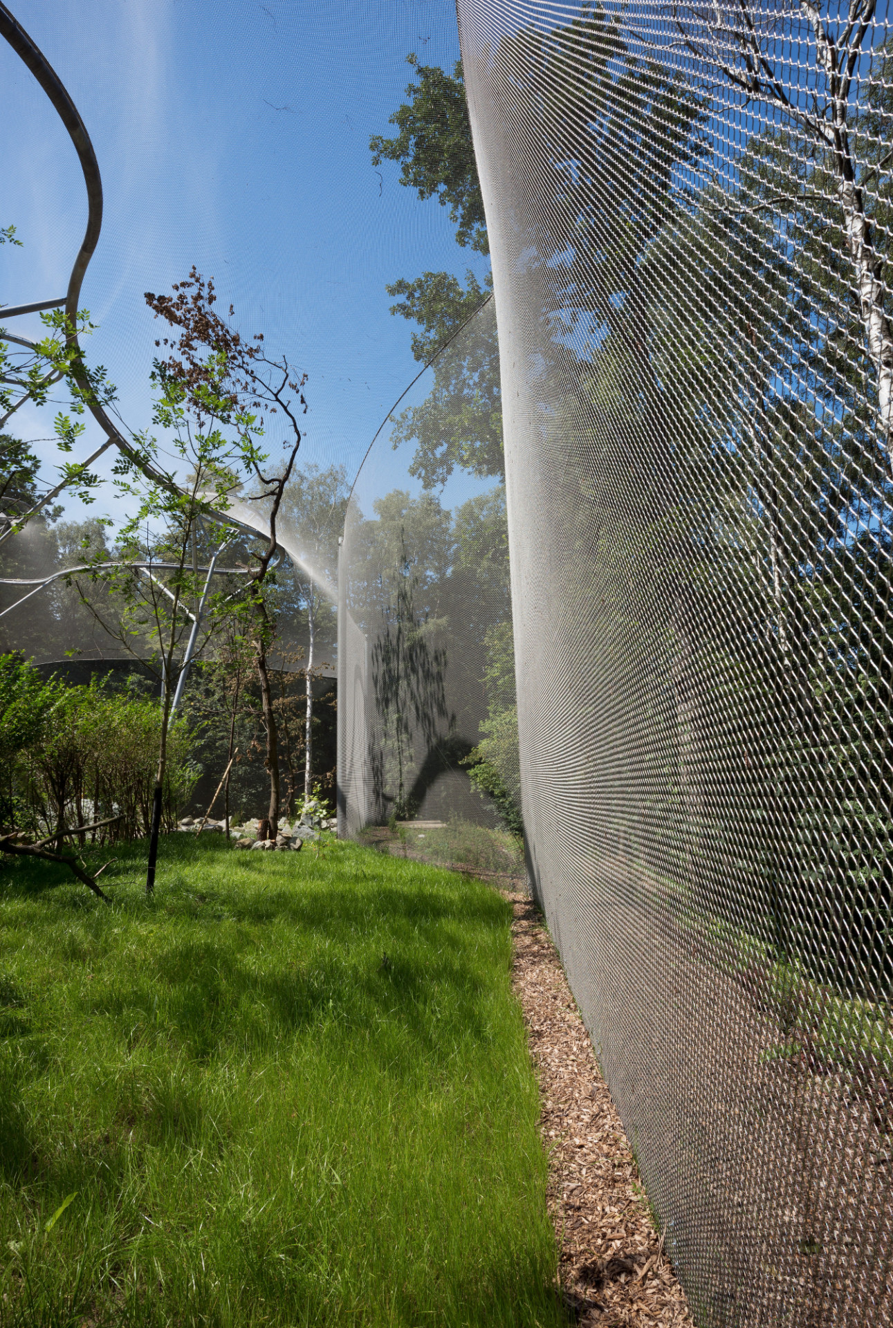 Elegantní, lehké a vzdušné tvarosloví voliéry tvoří na míru navržená nosná konstrukce promyšleného systému sloupů a táhel, založených na mikropilotech. Na nosný systém navazují zdánlivě levitující, téměř neviditelné stěny a zastřešení tvořené nerezovou splétanou sítí.