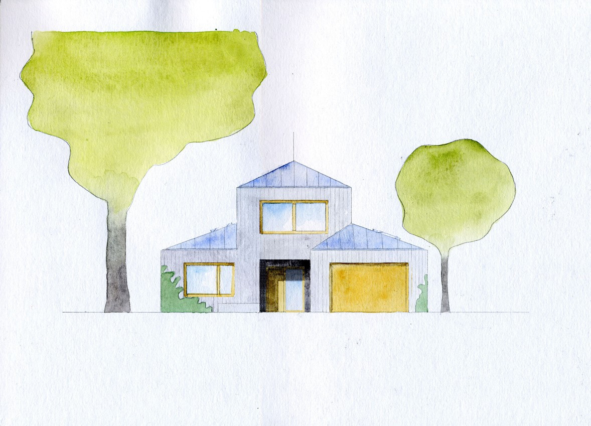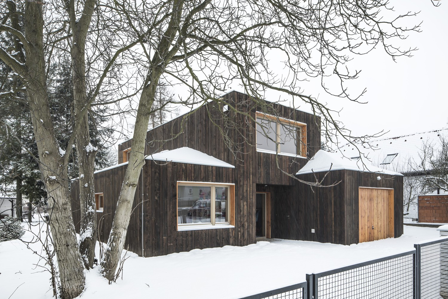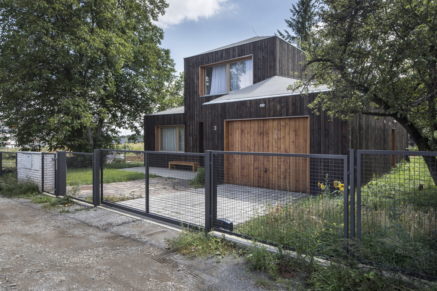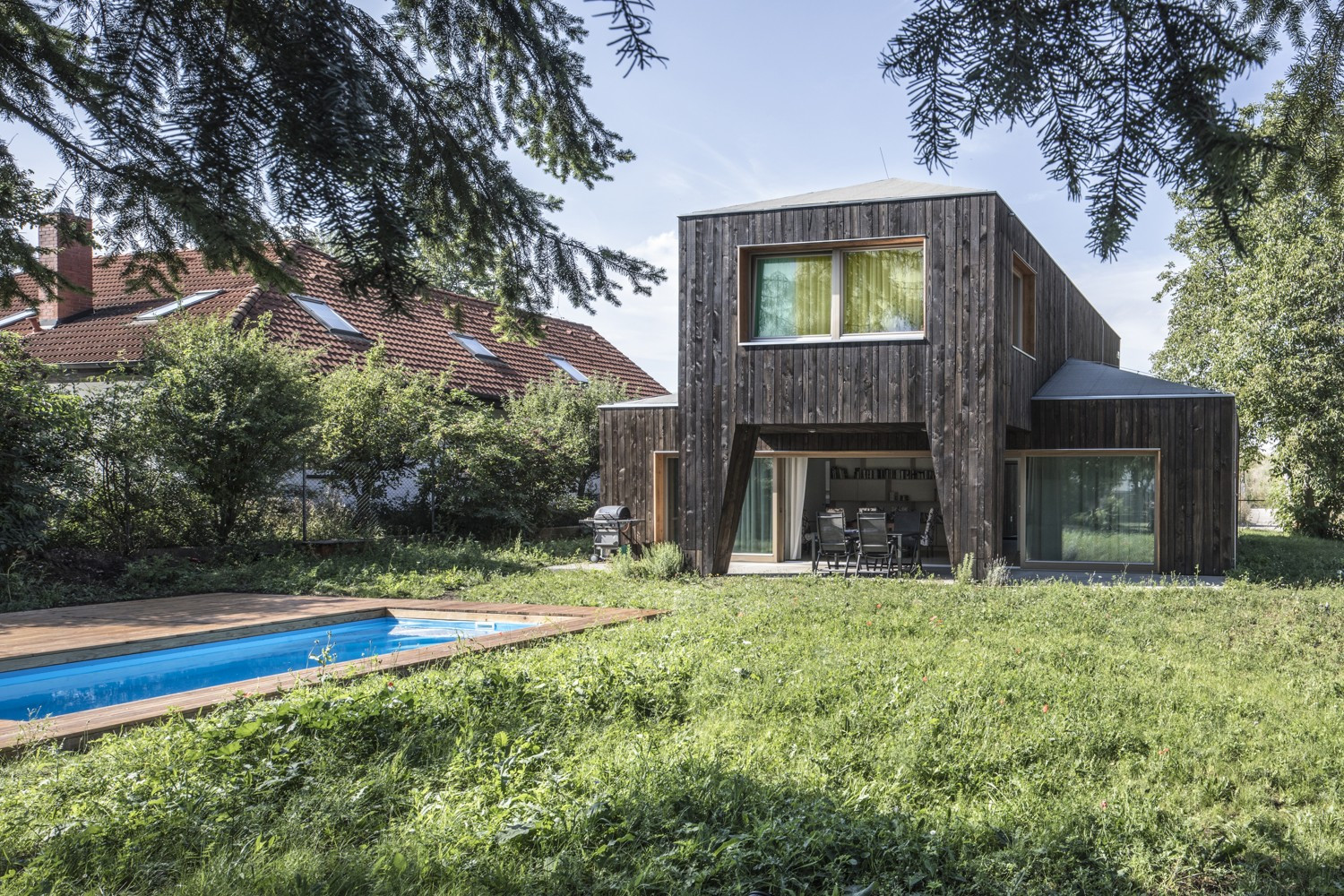 S územním rozhodnutím vydaným předem na jinou stavbu se studio Rusina Frei vypořádalo po svém. Do okrajové části Prahy navrhli architekti rodinný dům, který se přizpůsobuje jak požadovaným územním podmínkám, tak drobnějšímu měřítku bývalé zahrádkářské kolonie. V kontrastu ke světlému interiéru s betonovou podlahou a stropem v přízemí dům pokrývají tmavá dřevěná prkna. Horní část domu se "rozkročuje" nad přízemní hmotou a vytváří zastřešenou terasu směrem do zahrady s bazénem.