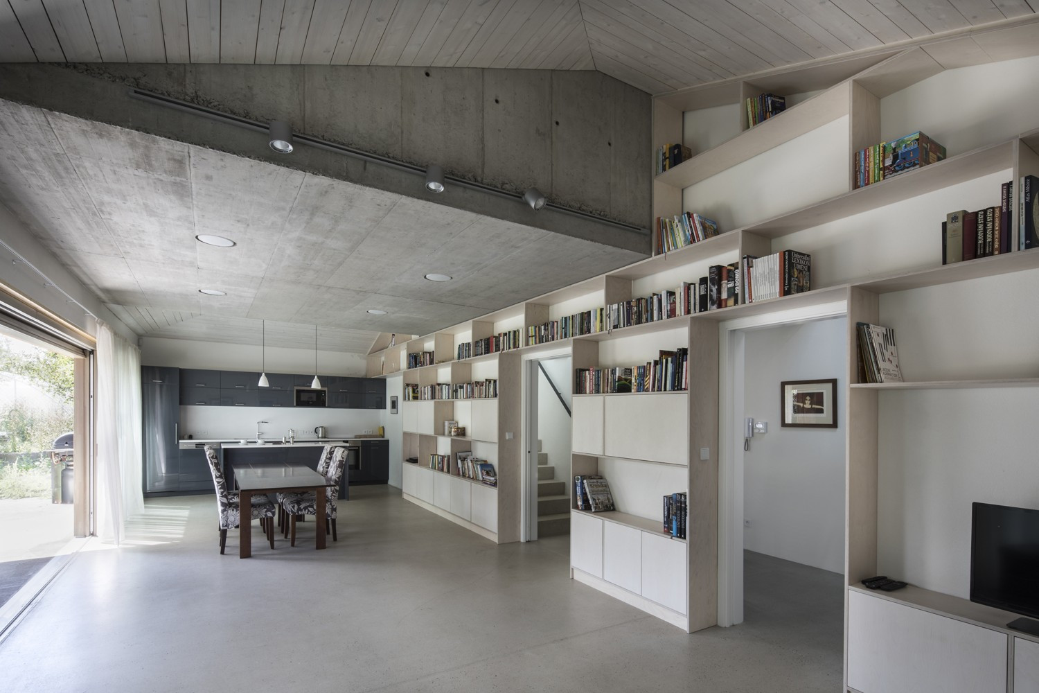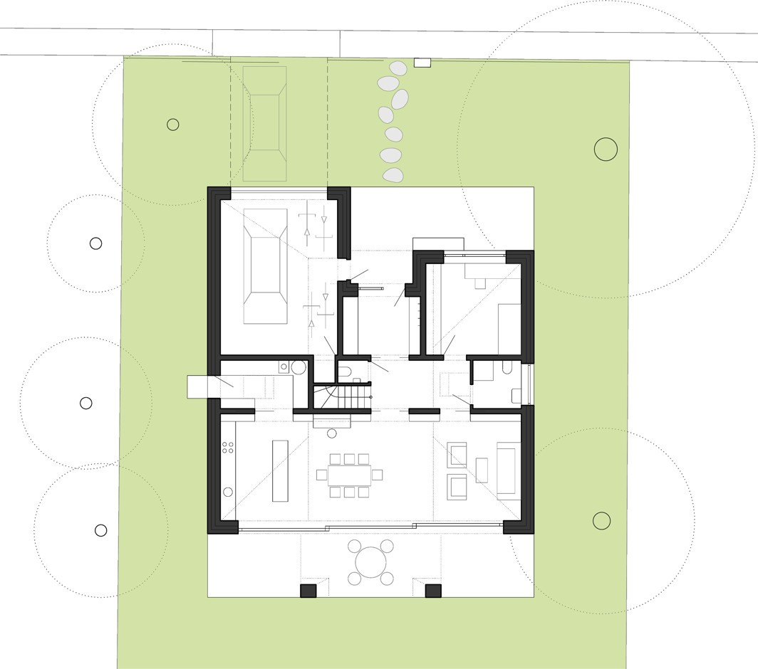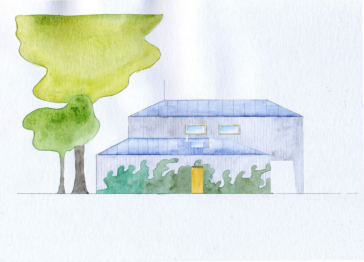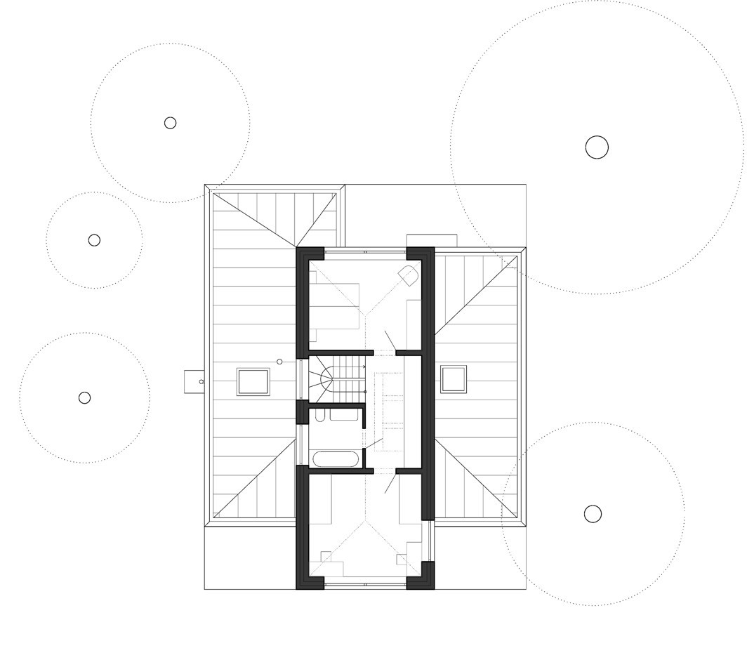 S územním rozhodnutím vydaným předem na jinou stavbu se studio Rusina Frei vypořádalo po svém. Do okrajové části Prahy navrhli architekti rodinný dům, který se přizpůsobuje jak požadovaným územním podmínkám, tak drobnějšímu měřítku bývalé zahrádkářské kolonie. V kontrastu ke světlému interiéru s betonovou podlahou a stropem v přízemí dům pokrývají tmavá dřevěná prkna. Horní část domu se "rozkročuje" nad přízemní hmotou a vytváří zastřešenou terasu směrem do zahrady s bazénem.