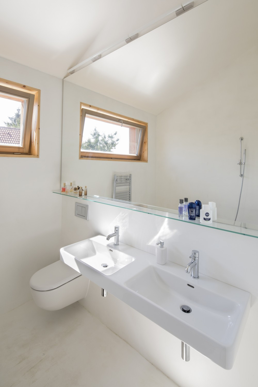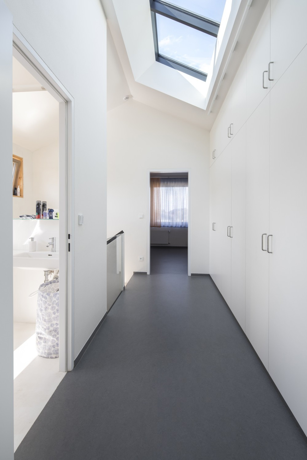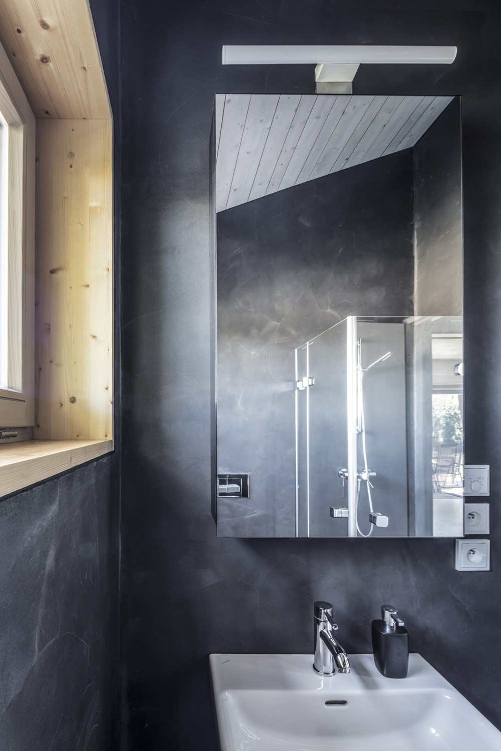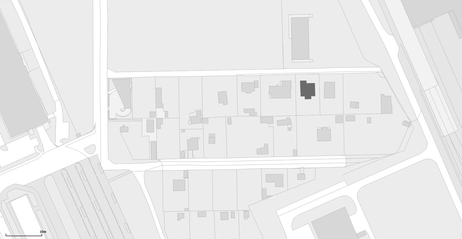 S územním rozhodnutím vydaným předem na jinou stavbu se studio Rusina Frei vypořádalo po svém. Do okrajové části Prahy navrhli architekti rodinný dům, který se přizpůsobuje jak požadovaným územním podmínkám, tak drobnějšímu měřítku bývalé zahrádkářské kolonie. V kontrastu ke světlému interiéru s betonovou podlahou a stropem v přízemí dům pokrývají tmavá dřevěná prkna. Horní část domu se "rozkročuje" nad přízemní hmotou a vytváří zastřešenou terasu směrem do zahrady s bazénem.
