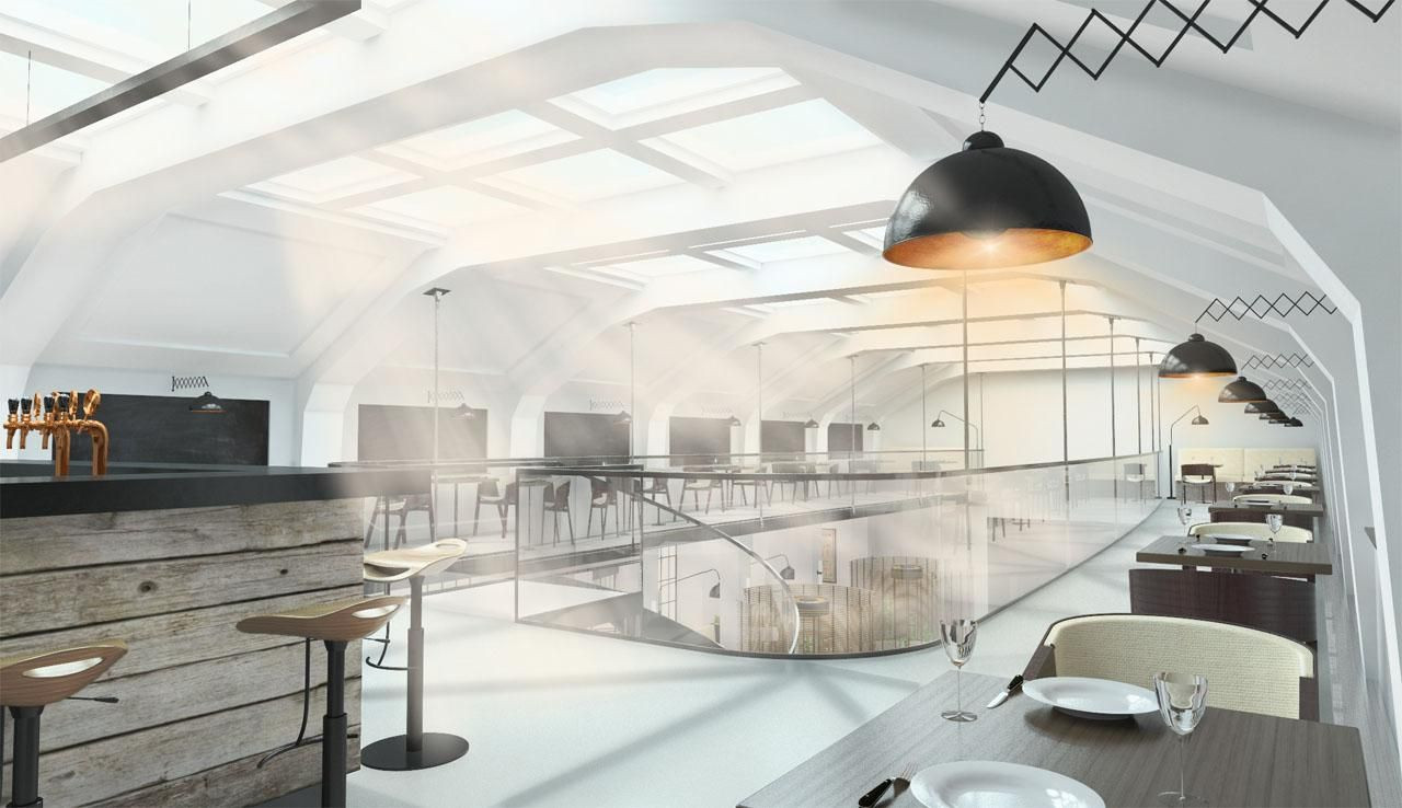 Vložené mezipatro je ocelové, zavěšené pomocí ocelových táhel za železobetonová žebra udávající tektoniku prostoru. Sezení v restauraci je rozvrženo takovým způsobem, aby se zde nacházeli místa k sezení jak pro menší počet osob, tak i pro větší skupinu osob.