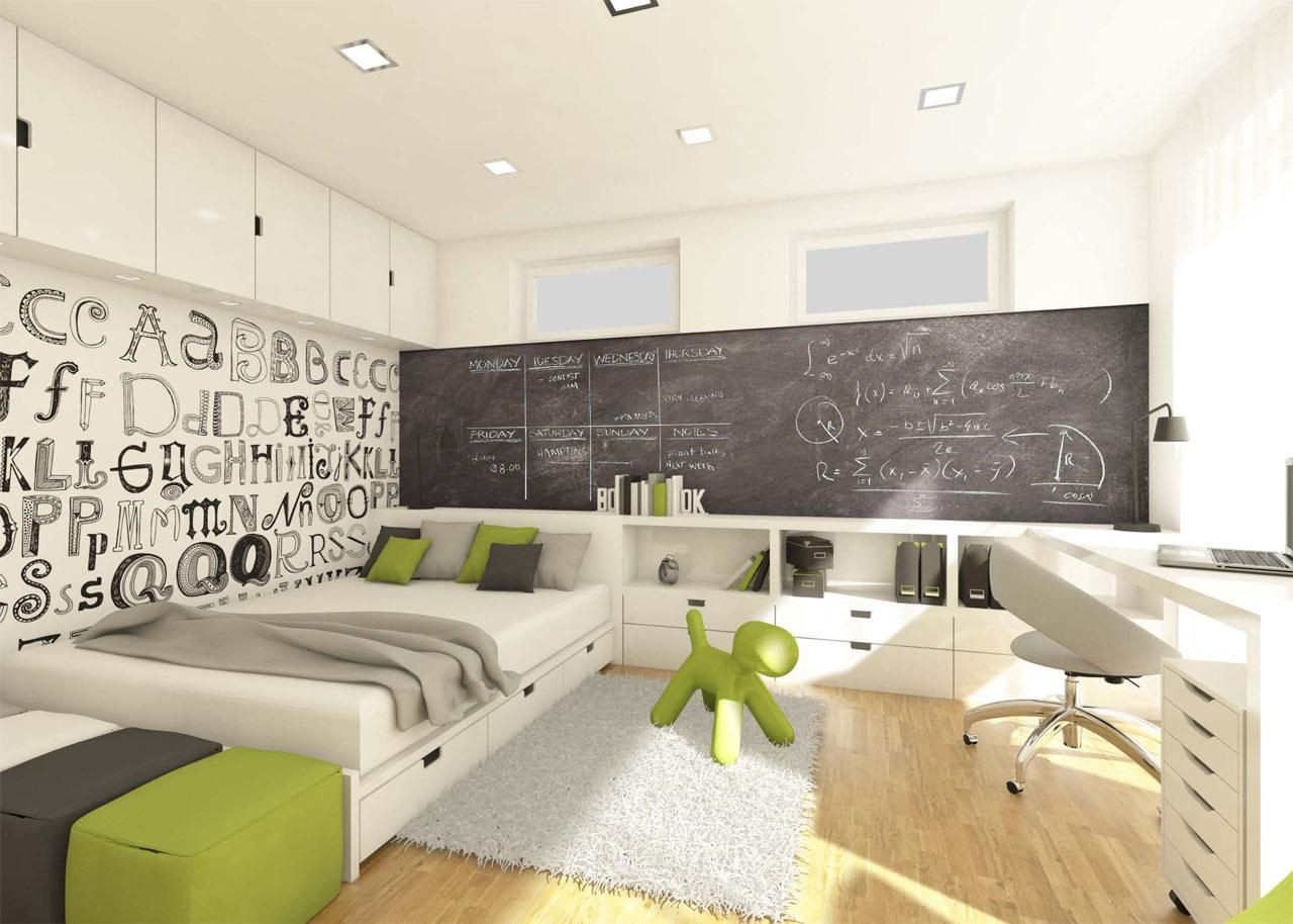 Pokoj je rozčleněn na zónu spací, pracovní a relaxační. Nábytek ve studentském pokoji byl navržen v bílé barvě. Celá jedna stěna pokoje byla opatřena matným tabulovým nátěrem a je tak určena pro vlastní kreativitu obyvatel pokoje.