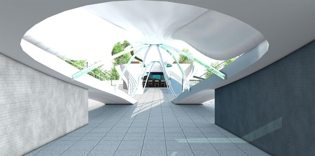 Jestliže je tu možnost jednání, musí zde být i možnost ubytování, kdyby se jednání prodloužilo. To zajišťují malé apartmány, zakopané v zemi. Přední prosklená stěna je orientována na jihozápad s výhledem na řeku Moravu. Pro zpříjemnění pobytu zde byla zřízena mala samoobsluha s denními potřebami, která se nacházíu východního konce lávky ( lávka je na ní usazena pomocí Elastomerového ložiska). Vobjektu sou dále veřejné toalety s denní místností a prostor pro prodej jízdenek na lanovou dráhu, vedoucí na vrchol kopce. Zastávku MHD jsem přesunul ze vzdálenějšího místa do centra dění. Z severní strany situace jde přes pěší komunikaci přijít nahoru na lávku a dále na druhou stranu vede pěší cesta nahoru na vrchol. Sama cesta je upravena s množstvímzastávek, vyhlídek a prostorů pro odpočinek.