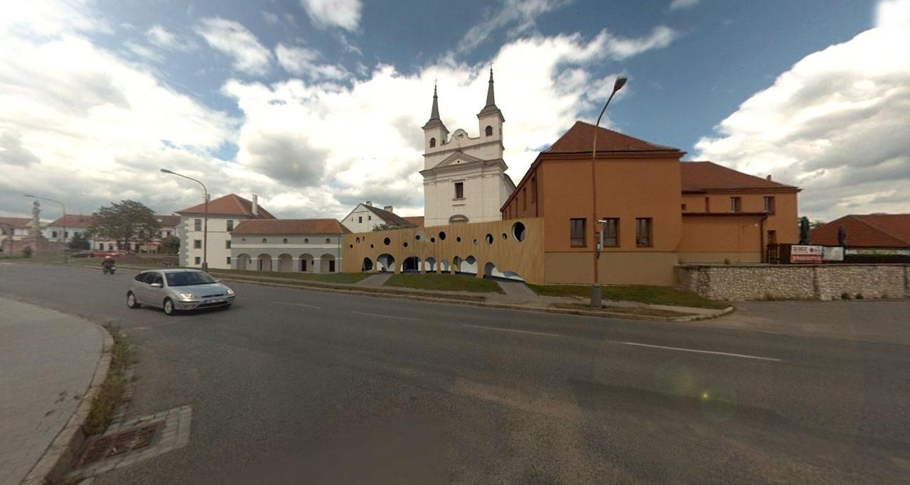 Navrhovaná přístavba je dvoupodlažní, s plochou střechou, umístěná ve svažitém terénu. Plynule spojuje radnici s okolní zástavbou. Přístavba živě reaguje svým tvaroslovím na stávající radniční historický objekt. Podloubí i kruhové okenní prvky v 1.NP pokračují také v nově navržené budově, avšak již v moderním provedení. Skrz přístavbu vede přímé veřejné schodiště, které vytváří průchod k baroknímu kostelu. Výška stavby je přizpůsobena okolnímu radničnímu objektu (po začátek střechy) a panoramatu obce (pro svou malou výšku je kostel i zámek dobře vidět i z dálky). Při analýze místa stavby byly zjištěny četné nedostatky místa (nedostatek parkovacích míst, použití parkoviště pro stánky s obchody, nutnost objezdu náměstí k parkovišti), proto můj návrh vytváří nové parkovací místa, propojuje parkování s hlavní cestou a vytváří „kamenné“ obchody v podloubí. Druhé podlaží má komerční využití. Může sloužit obci nebo jako prostory pro pronájem. Dále víceúčelová místnost v prostorech bývalého nádvoří umožňuje pořádat různé společenské akce, rauty nebo výstavy umění.
