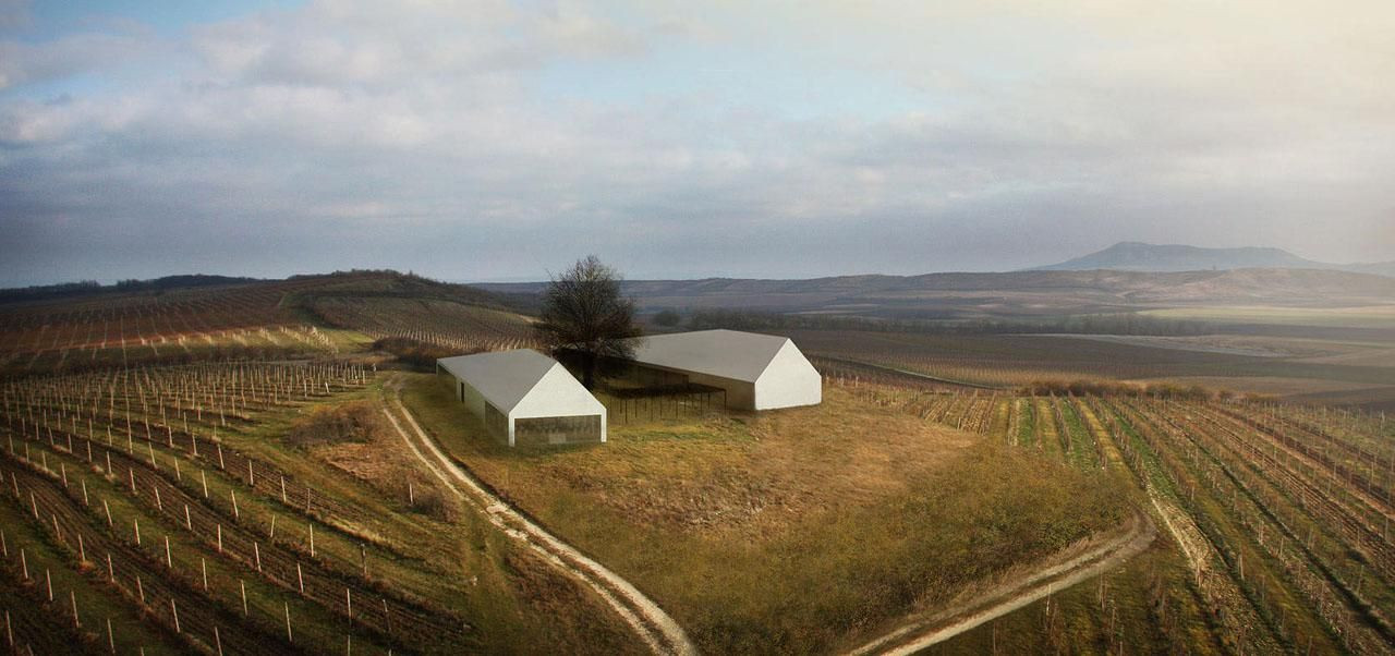Postupným vývojem projektu se tedy schéma proměnilo z uzavřeného kláštera do hospodářské usedlosti s dvěmi nadzemními hmotami, které jsou otevřené do krajiny a umožňují proudění energie, které teče po hřebeni Staré Hory, prochází skrz dvůr a graduje na volném prostoru, který vznikl na střeše technologické části. Víno má vymezené podzemní prostory, kde je vlhko a chlad. Nadzemní prostory jsou lehké a transparentní, uchopitelné na první pohled. S tím kontastují betonové klenby a sklepy, čímž získává projekt více rovin.