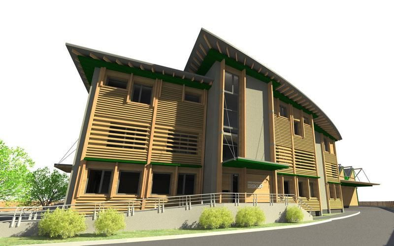 Stavební objekty jsou vsazeny na střed pozemku, administrativní budova (AB) při jižní straně a výrobní budovy (VB) se zázemím při straně severní > AB je orientována hlavními průčelími na jih – solární zisky, sever – světelná a teplotní stabilita. Architektonické tvarosloví AB je dáno zejména funkčními prvky dřevěných stínících konstrukcí – lamely, svislá žebra a přesahy střech.