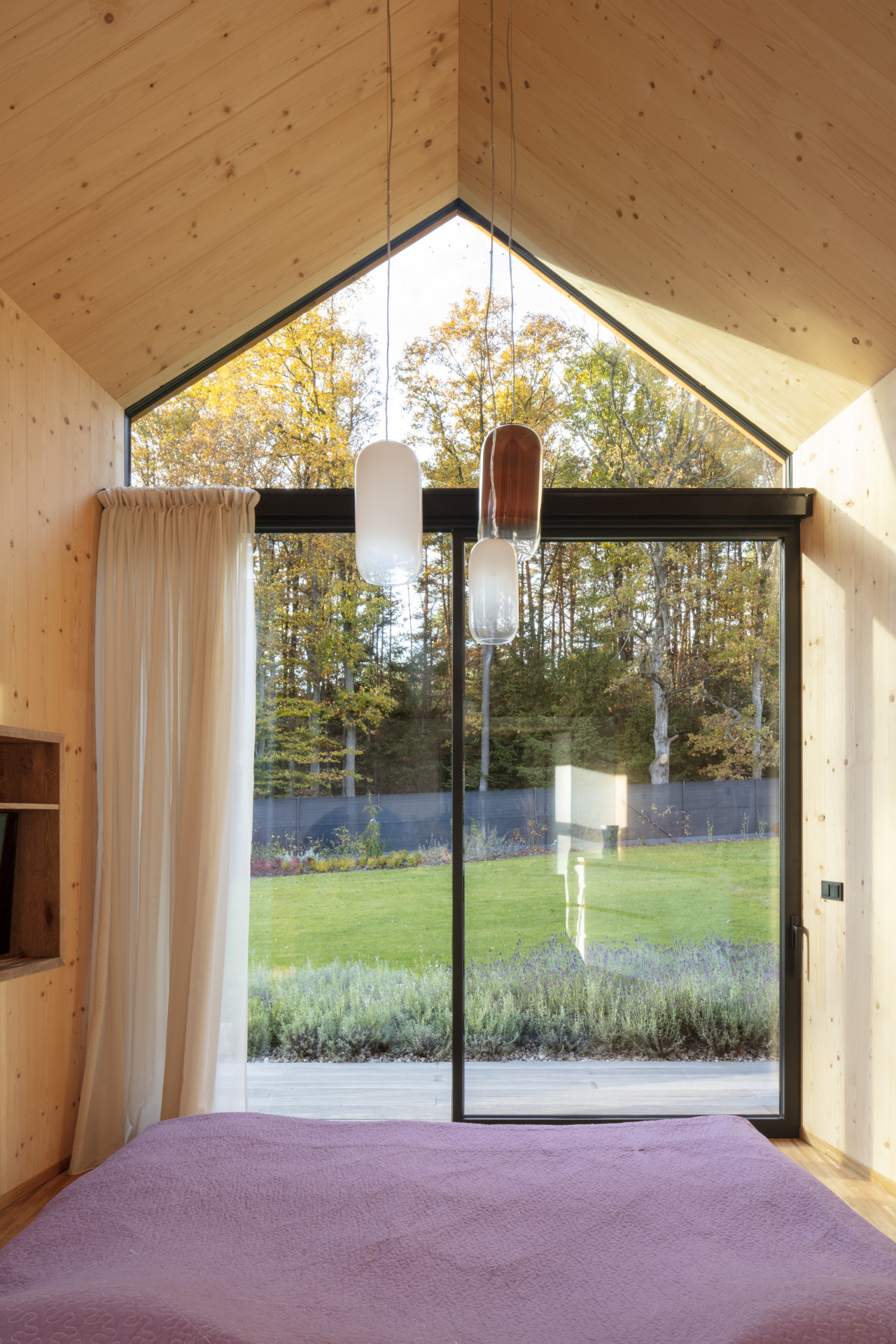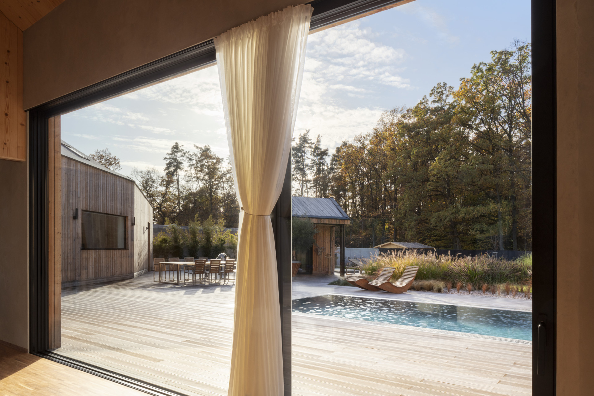 Garáž se přirozeně napojuje na pozemní komunikaci, přístřeškem se pak dá projít do zahrady. Do té se otevírají hlavní obytné prostory, na které navazuje pobytová terasa se zapuštěným bazénem. Severní část domu se větví na tři části, v každé je jedna ložnice, jejichž štítové stěny uzavírají velkoformátová okna v minimálních antracitových rámech.