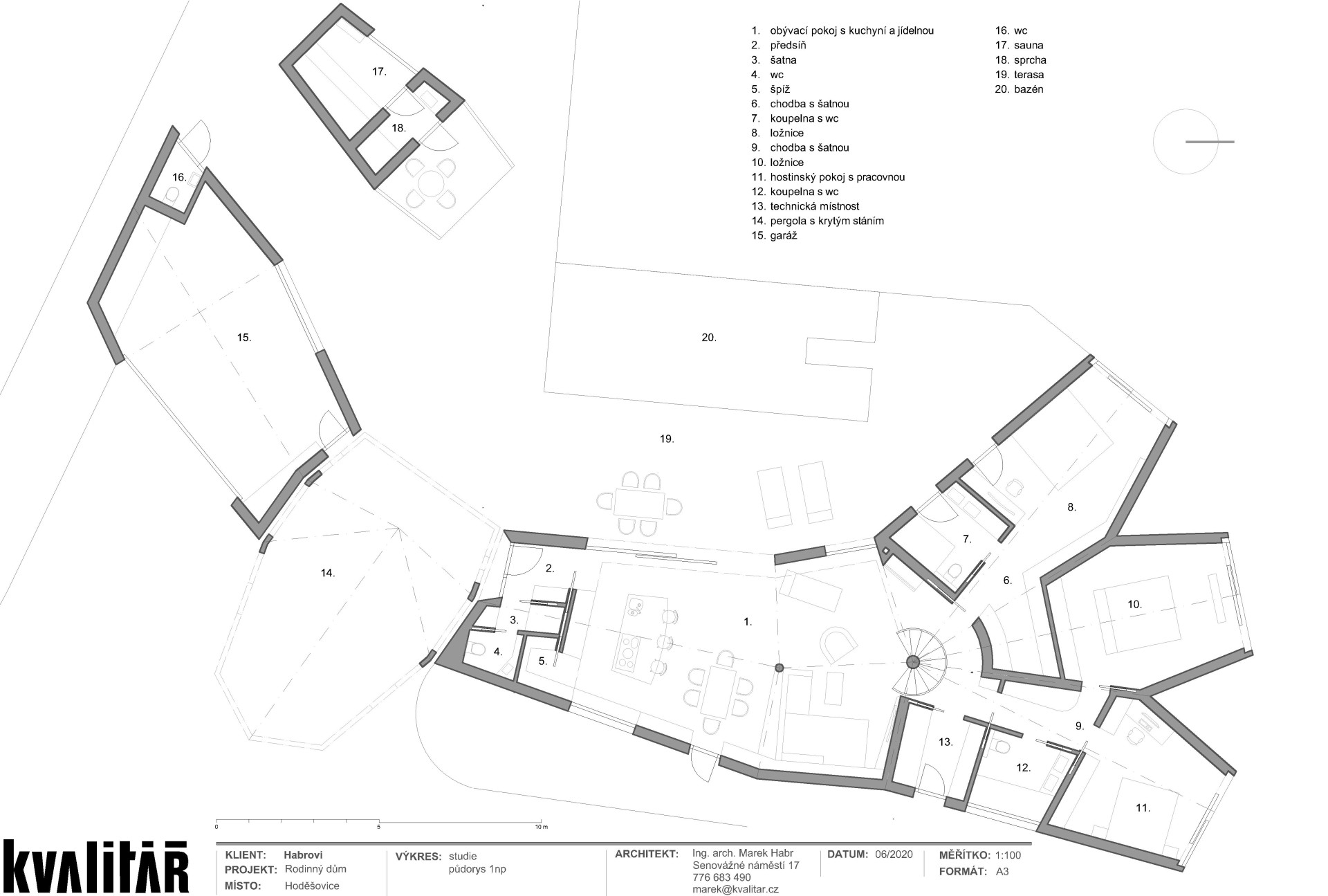 Jedná se vlastně o spojení tří vedle sebe stojících budov. „Samostatně stojící garáž a obytná část jsou hmotově těsně spojeny průchozím přístřeškem,“ popisuje strukturu domu Marek Habr.