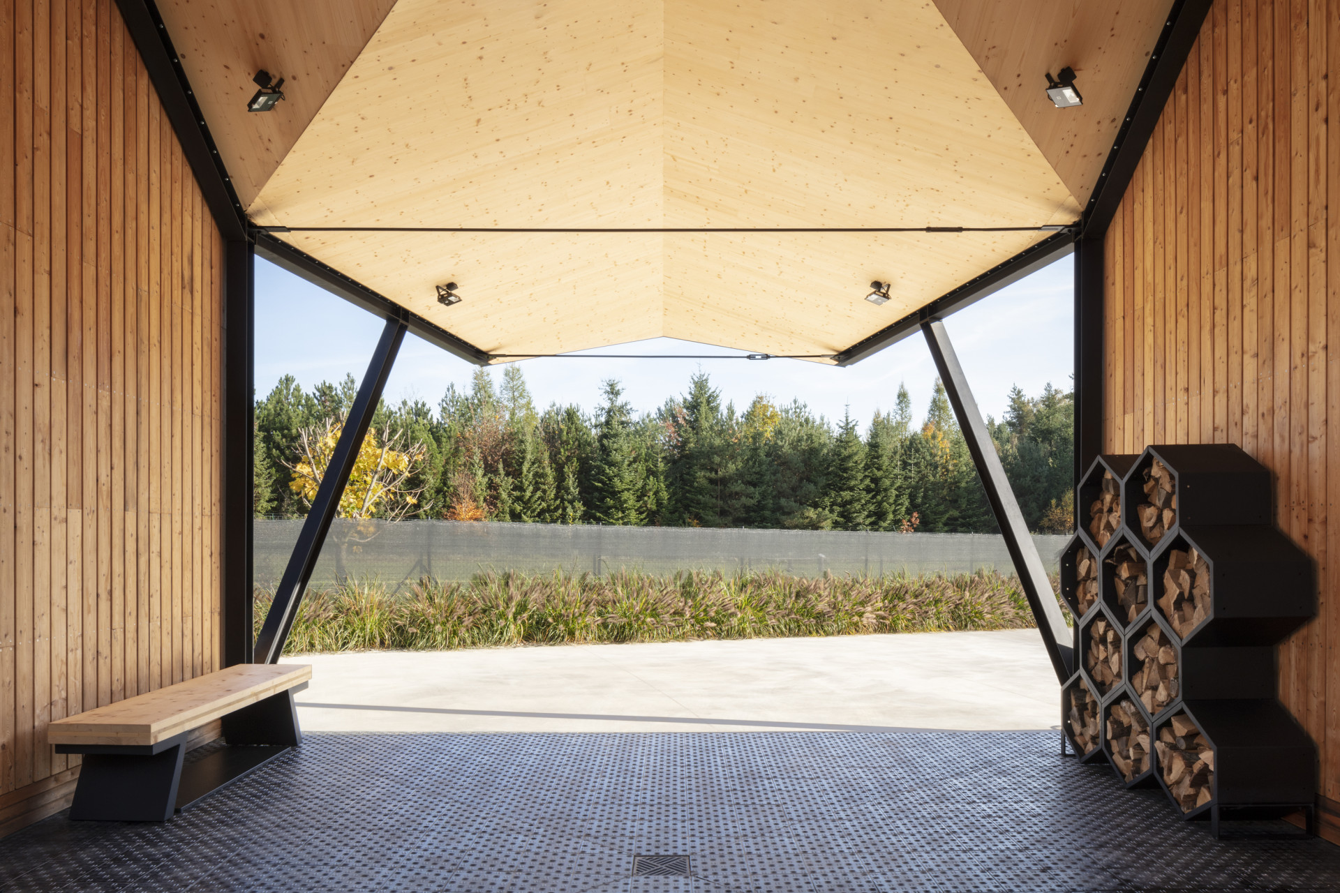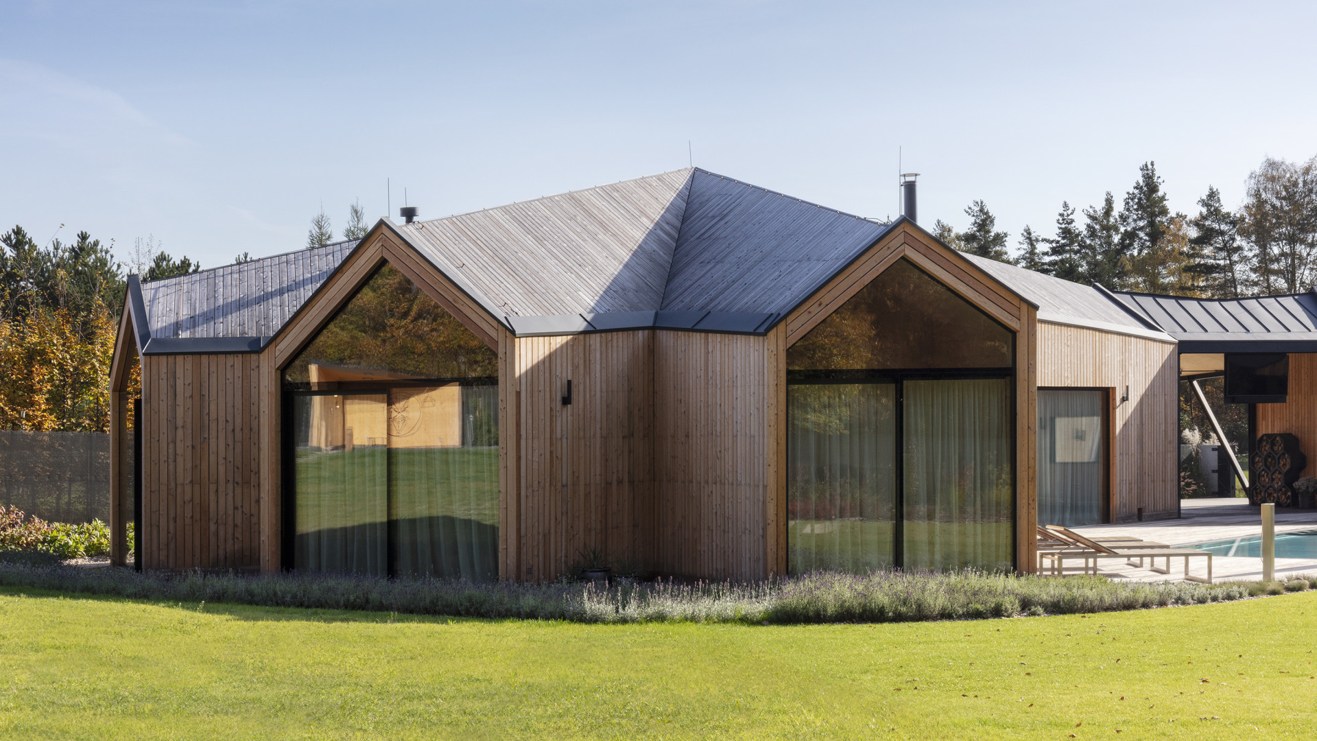 Svérázná interpretace dřevěného statku. Architekti chtěli navázat na tradici, současně ale vytvořili sebevědomý novotvar