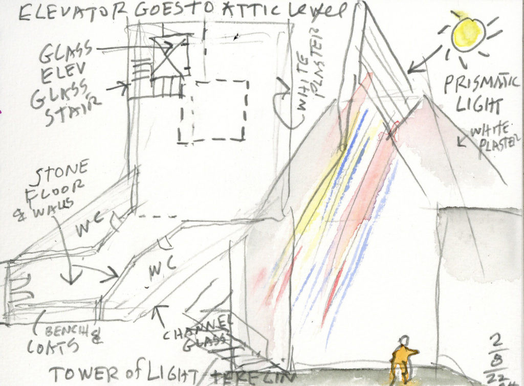 Křehké objemy muzejní přístavby efektně protne světelná věž podle návrhu Stevena Holla – amerického architekta, podle jehož návrhu vyroste v Ostravě nová koncertní síň. „Tower of Light je prostorem světla, jasným a expresivním vyjádřením tématu i provozních požadavků. Směřuje vzhůru, do nebe, za světlem, za nadějí. Nabízí ztišení, prostor pro vzpomínání i prostor pro vnímání a meditaci nad posvátností samotného života a sílou i křehkostí humanistických idejí,“ popisuje symboliku věže architektka Marcela Steinbachová za ateliér Skupina. Inspirací pro návrh věže byla kresba Měsíční krajina terezínského vězně-chlapce Petra Ginze.