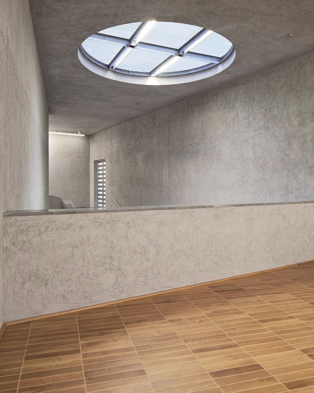 Odstíny šedi uplatněné na fasádě muzea se propisují i do řešení interiéru. Nositelem neutrálního odstínu zde již nejsou cihly, ale žilkovaný mramor a drsná škrábaná omítka uplatněné v komunikačních prostorách, které opět odkazují k řešení vnitřního prostředí historického objektu. Tmavě šedý mramor zde však navíc doplňuje pozinkovaný obklad, který, ač ve vztahu k použitému kamenu kontrastní, přispívá k dotvoření harmonického a nadčasového charakteru prostoru.