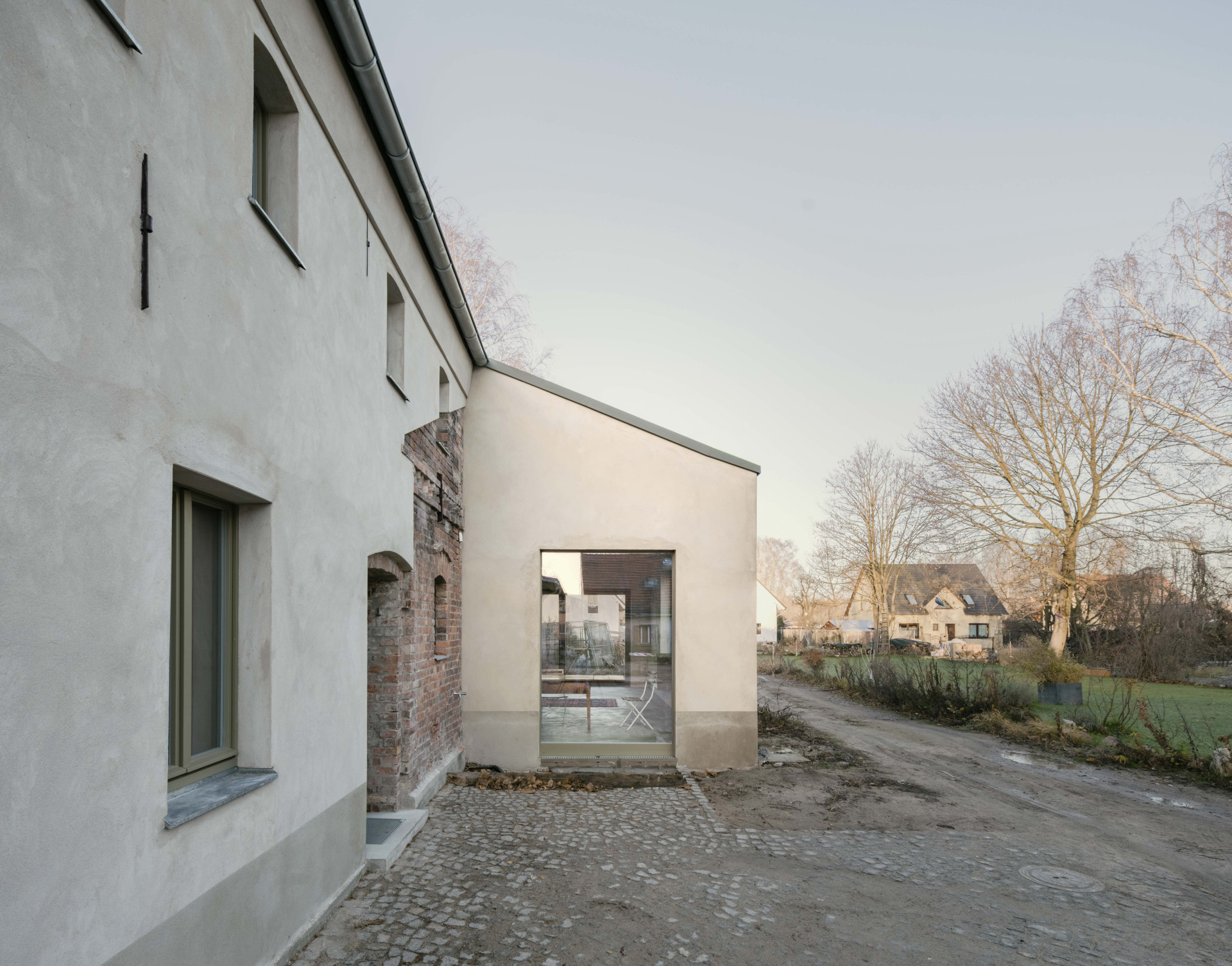 Aby se ve stavení pohodlně bydlelo, bylo ho potřeba rozšířit o společné obytné prostory. Přístavba propojená s kočárovnou vznikla podle návrhu architektů ze studia Helgy Blocksdorf. Na starou část navazuje svou světlou fasádou a jemně zelenými okny, zároveň ale nepopírá to, že je novostavbou a do celku tak vnáší přítomnost. Fasáda původního objektu poodhaluje na rozdíl od přístavby své cihelné zdi.