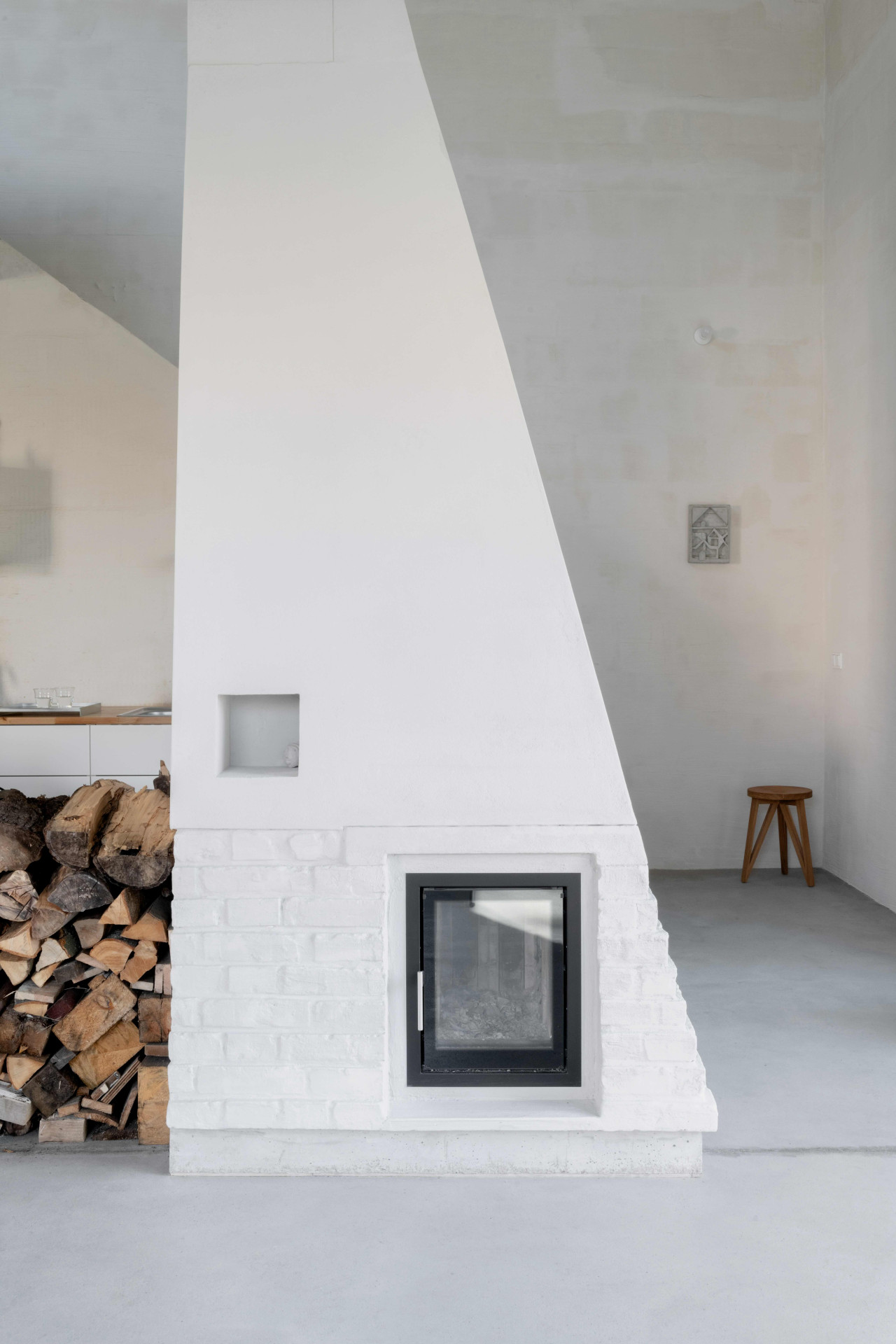 Do novostavby na čtvercovém půdorysu architekti umístili převýšený obývací prostor s kuchyní. Ve svém srdci má důmyslně pojatý krb, jež syrovým interiérům dodává útulnost.