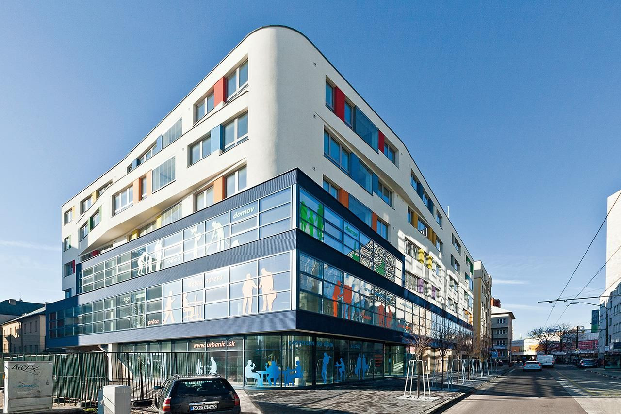 Principiálne je objekt navrhnutý tak, že jednotlivé funkcie prerastajú až na fasádu. Prízemie, 1. poschodie a časť 2. poschodia sú určené a prispôsobené prevádzkam služieb a administratíve. Na fasáde sa táto funkcia premieta transparentnými zasklenými plochami kombinovanými s tmavomodrou horizontálne pásovanou fasádou. Nebytové funkcie sú umiestnené práve na pohľadovo exponovanej časti objektu a odvádzajú svojou transparentnosťou pozornosť od intímnejšej časti – bývania. Nezabudnite si vychutnať i názov domu a jeho spracovanie. Na spodnom tmavomodrom pásovaní nájdete jemne ustúpenú časť. Tvorí názov objektu – URBANIC. Hra s detailom je pre tento ateliér typická. K obytnej funkcii zvolili architekti horizontálne členenú fasádu zvýraznenú vrstevnicovým usporiadaním jednotlivých podlaží. Touto hrou dosiahli optické zníženie domu. Na rozdiel od sterilne celopresklenej fasády oproti, ktorá vás atakuje a neponecháva súkromie, URBANIC na vás dýchne trochou prívetivosti a optimizmu.