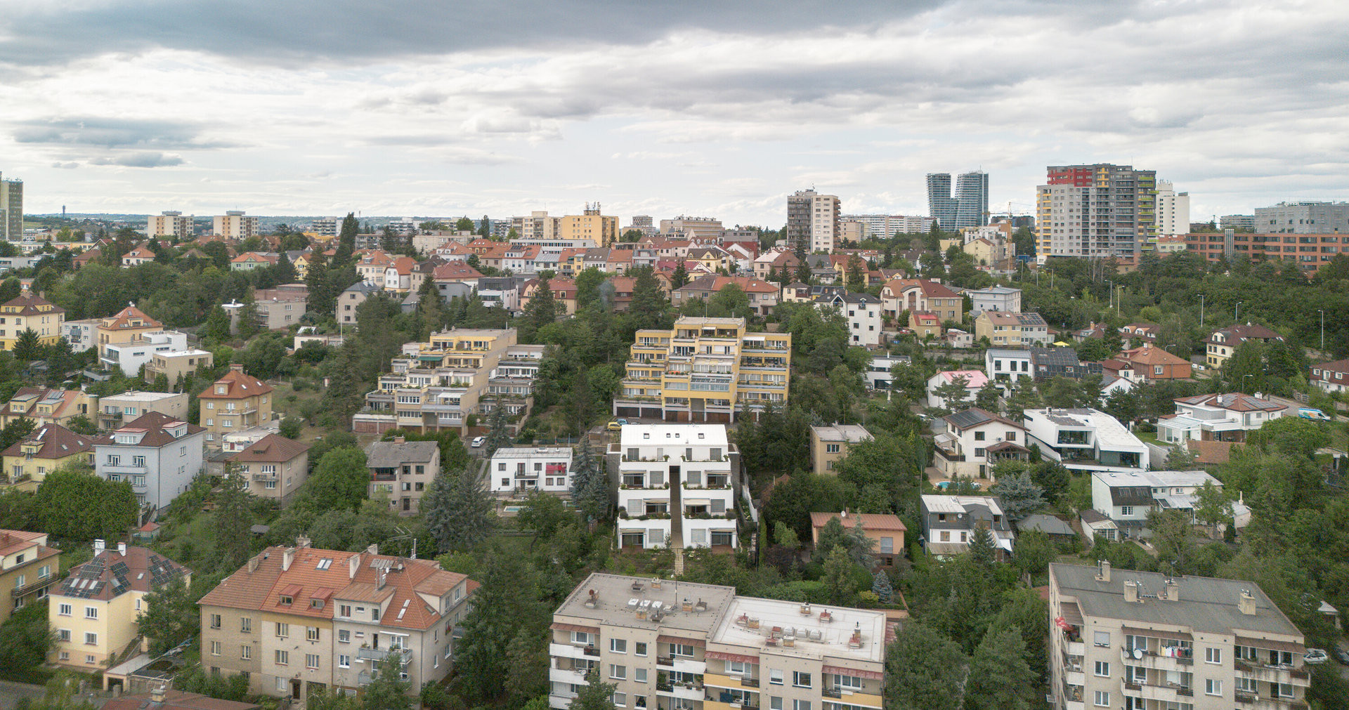 Vokolí nové činžovní vily se nachází celá řada výrazně řešených domů. „Asi nezajímavější je dvojice brutalistních terasových bytových domů z přelomu 60. a 70. let reagujících na prudce stoupající terén, jež přes ulici sousedí s pozemkem naší stavby. Naopak k jižní straně pozemku přiléhá soubor bytových domů ze 70. a 80. let. 20. století. I tento architektonický kontext jsme se snažili návrhem reflektovat,“ píše architekt Čeněk. Povedlo se, krčský svah získal novou stavbu, která nabízí komfortní bydlení a do svého okolí citlivě zapadá.