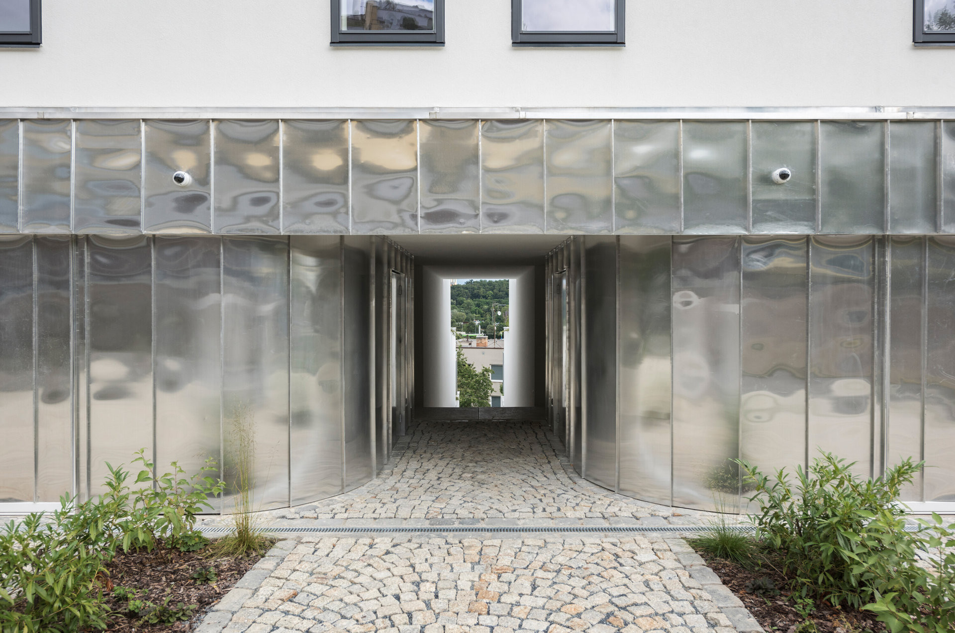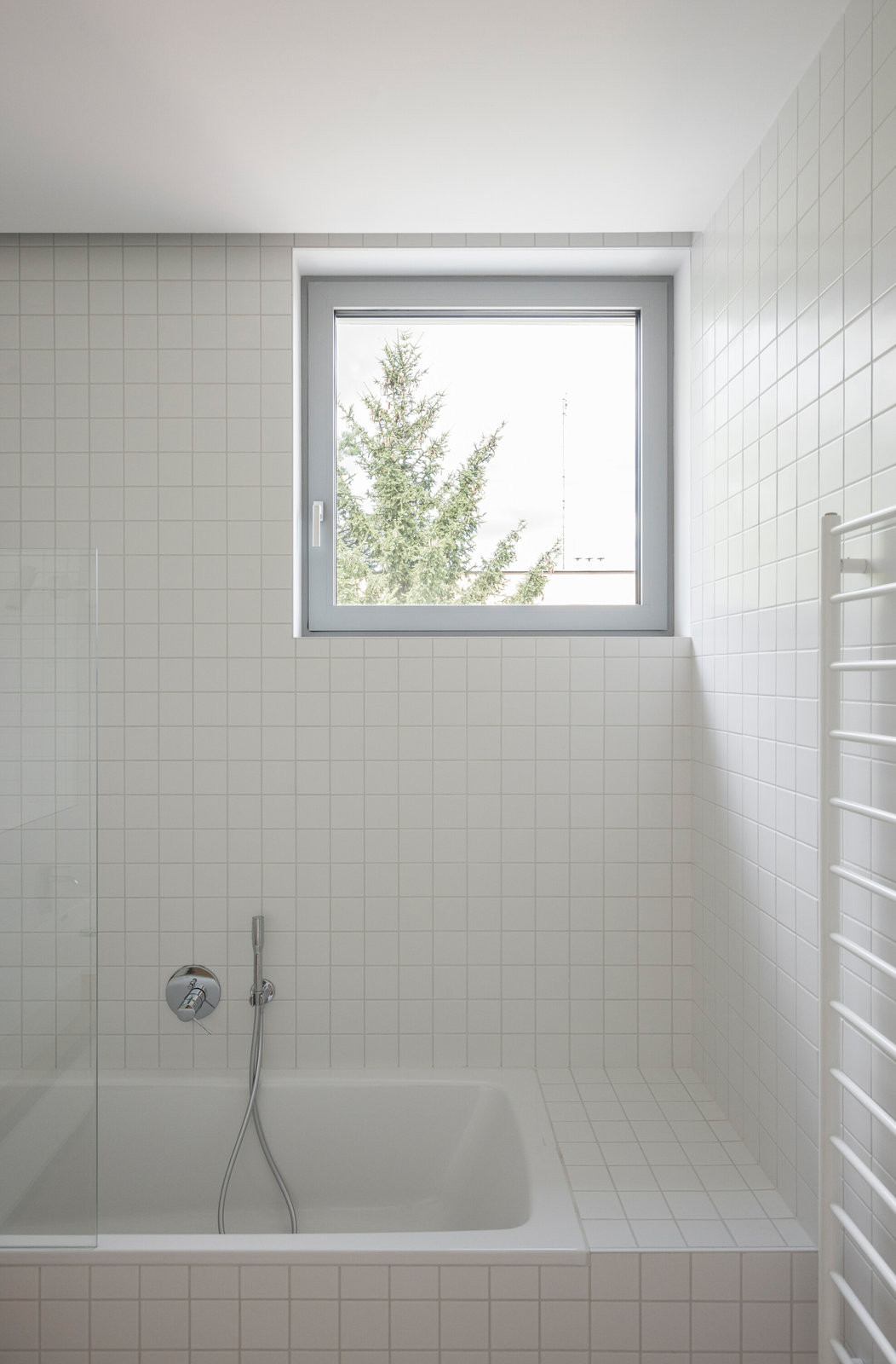 Výsledkem chytré práce s komplikovaným pozemkem je právě terasový dům, bílý blok kopírující terén. Na jeho bocích jsou podle výhledů z interiéru komponované různé typy čtvercových oken. „Vstupy do bytů jsou z vnějšího schodiště, které protíná dům v ose mezi oběma sekcemi, a je částečně překryto objemem podkroví. Tento výrazný řez hmotou stavby zároveň propojuje ulici a zahradu, která je o téměř 8 metrů níž,“ popisuje Martin Čeněk.