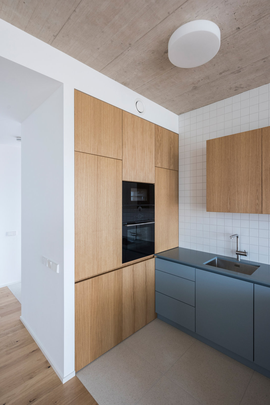 Autorské jsou rovněž interiéry. Základní odstíny jsou bílá a béžová. Vestavěný nábytek je pokrytý dubovou dýhou, doplňují ho ale barevné lakované povrchy, které sem vnáší trochu hravosti – třeba šedomodrý kuchyňský ostrůvek, anebo žlutá nika v ložnici. Terasy stíní pergoly se žlutými baldachýny. Obývací pokoje všech bytů mají kromě přístupu na terasy a výhledu do zeleně také sedací bezrámová okna s hlubokým parapetem. Na stropech je přiznaný železobeton stropních desek.