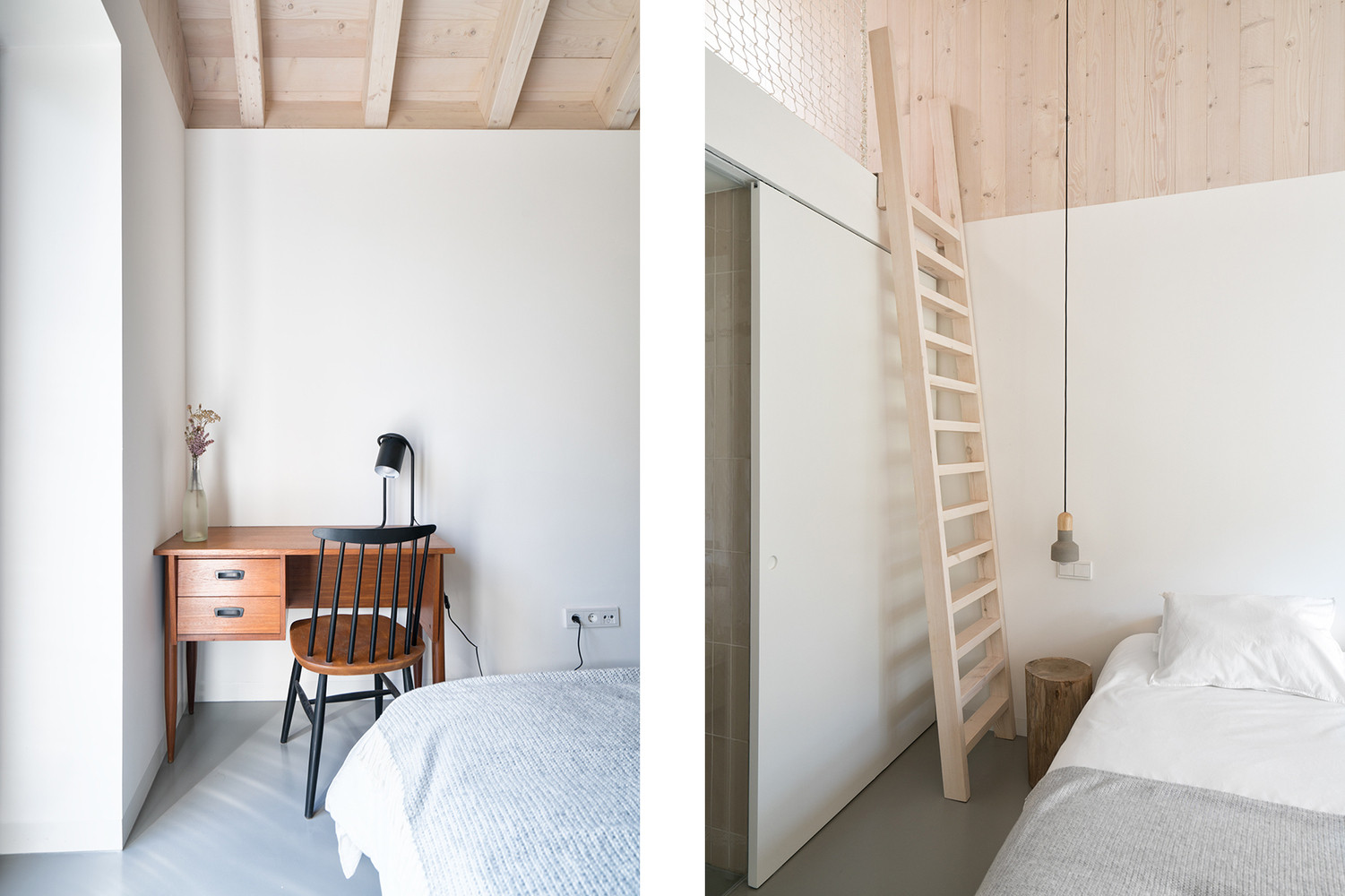 Vzdušnou dispozici navrhla architekta tak, aby se přizpůsobila požadavkům páru, rodiny s dětmi i větší skupině přátel. Centrum domu tvoří prostorný obývací pokoj s kuchyňským koutem a jídelním stolem, na nějž navazuje venkovní dlážděná terasa. Technické zázemí a ložnice s vlastními koupelnami jsou situovány při bočních stranách objektu, přičemž každá z ložnic se stejně jako obývací pokoj otevírá velkými okny do exteriéru. Nad prostor koupelen pak Laura Alvarez navrhla útulná mezipatra osvětlená střešními okny, do nichž je možno vystoupat po žebříkovém schodišti z dané ložnice.
