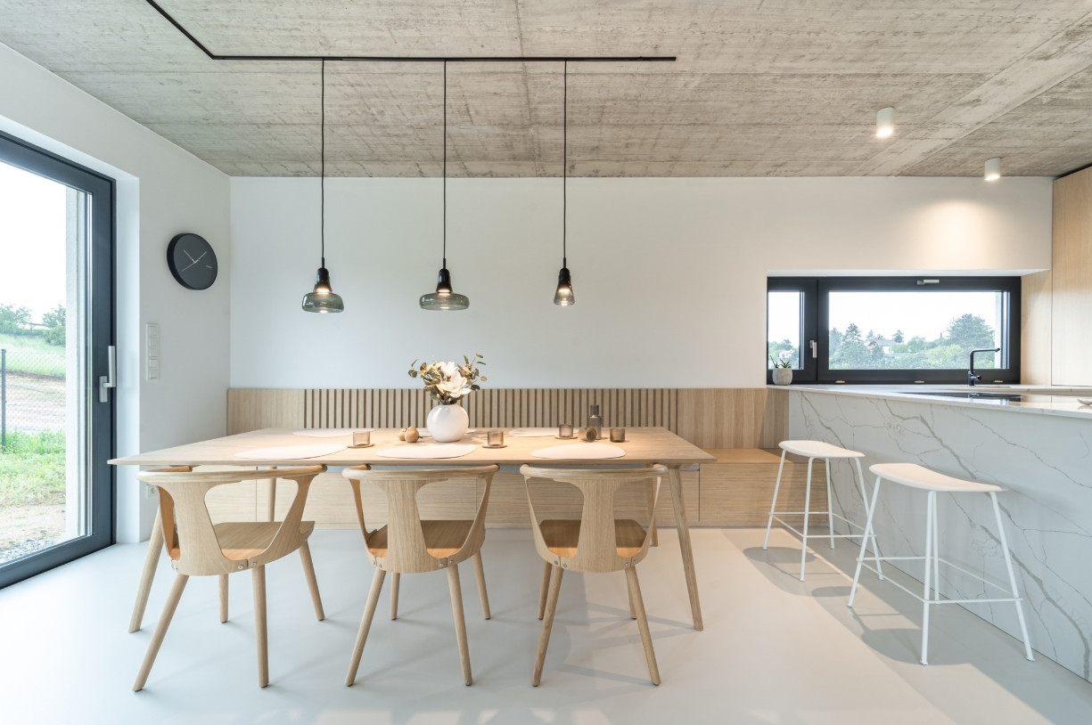 Rodinný dům v Popůvkách u Brna je zvenčí dílem developera, jeho duši ale vtiskly architektky ze studia Atel!er. V interiéru propojily syrovost betonu s jemností přírodních povrchů a vytvořily nadčasové bydlení v duchu stylu japandi – kombinace japonské střídmosti a skandinávského „hygge“.