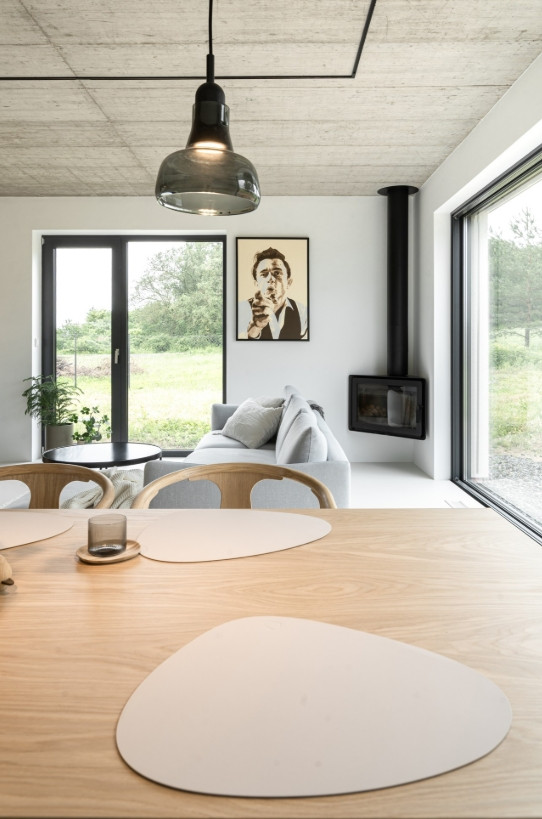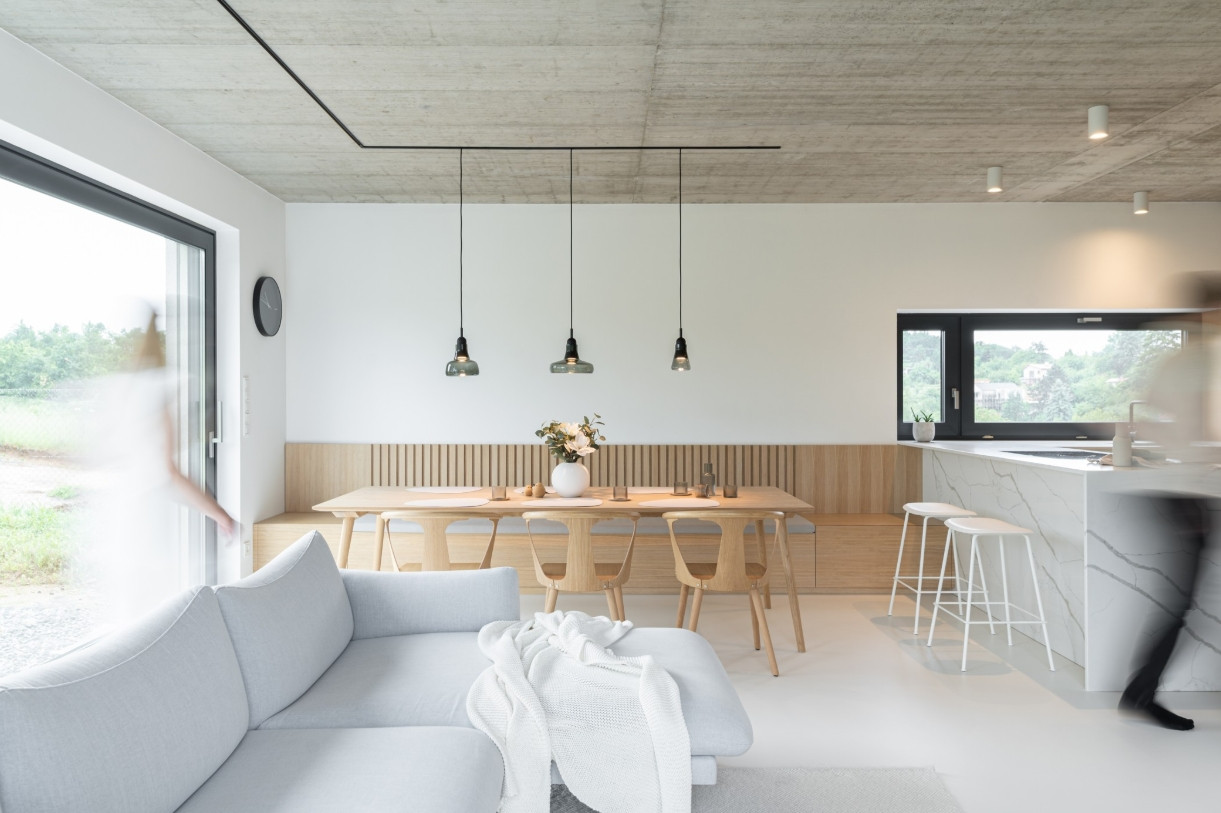 Rodinný dům budoval developer, do interiérů ale promluvily architektky. Propojily v něm syrovost betonu s teplem přírodních materiálů. Vytvořily tak vzdušné bydlení, které je minimalistické, ale zároveň útulné.
