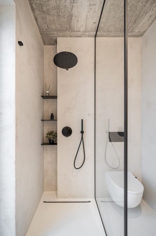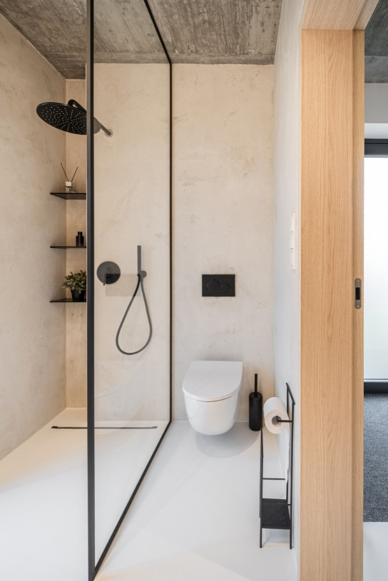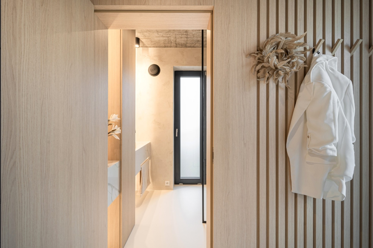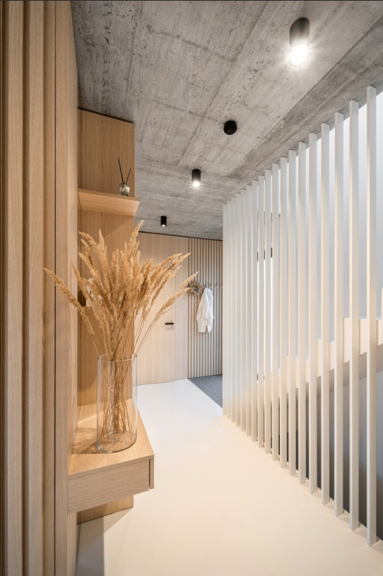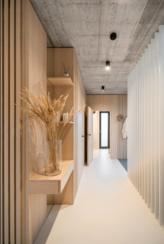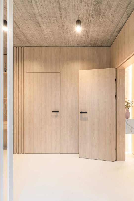 „Kromě dekoru mramoru od Technistone, který vytváří jemný kontrast k surovému betonovému stropu, jsme v interiéru pracovali s velkoformátovými plochami sahajícími od podlahy až ke stropu. Ty slouží jako vizuální protiváha výrazné stropní textuře. Zároveň nám pomáhají akusticky členit prostor pomocí zakomponovaných lamel, které mají i praktickou funkci – například ukrývají vzduchotechniku za kuchyní nebo sklopné háčky ve vstupních prostorách,“ komentuje Kateřina Horych nejen práci s lamelami.