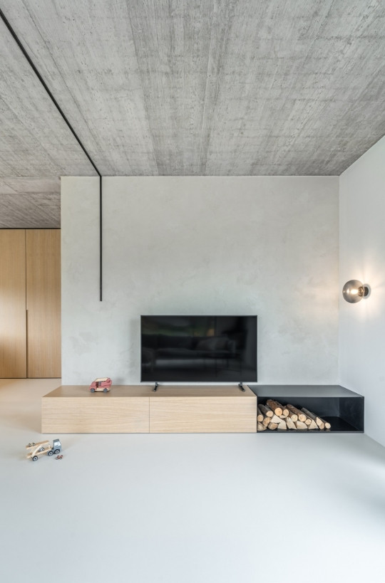 Charakter interiéru určují surové i ušlechtilé materiály, čisté linie a promyšlené detaily. Na nábytku se uplatnila dubová dýha. Dominantou se stal pohledový betonový strop. Ten měl být původně omítnutý, ale zanechal se v surové podobě, a tak po něm esteticky vedou rozvody osvětlení, obojí v černé barvě, takže ladí s antracitovými okny.