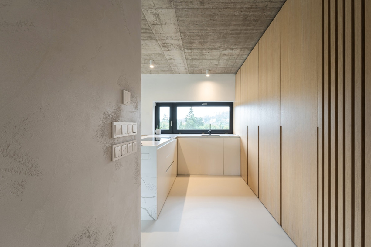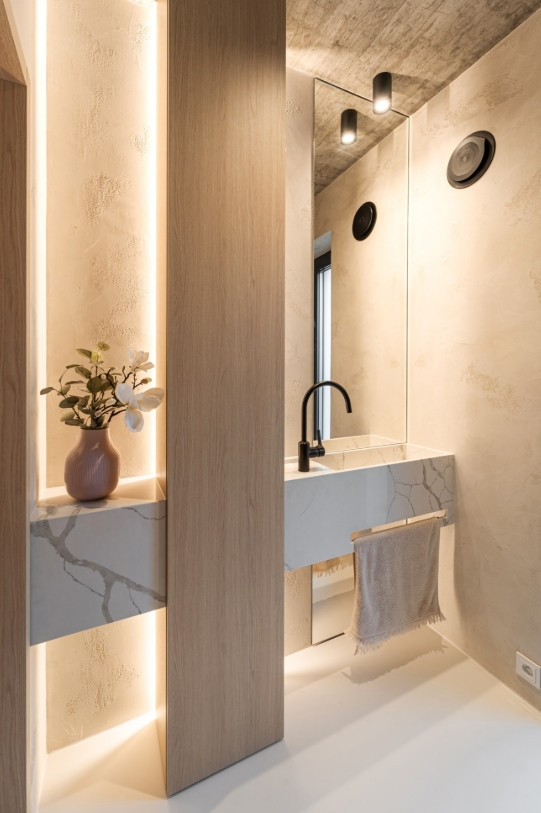 Do této skladby materiálů architektky zasadily i tvrzený kámen od Technistone, jehož vzhled připomíná přírodní mramor, ale zároveň nabízí odolnost vhodnou pro každodenní provoz. Architektky měly s materiálem už zkušenosti a v rodinném domě v Popůvkách ho použily hned na dvou místech – na kuchyňském ostrůvku a také v koupelně, kde z něj navrhly atypické umyvadlo do úzké niky.