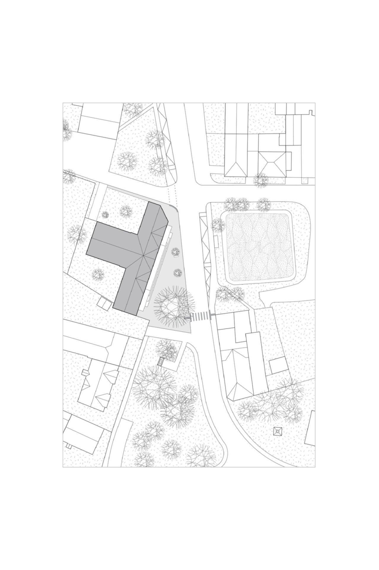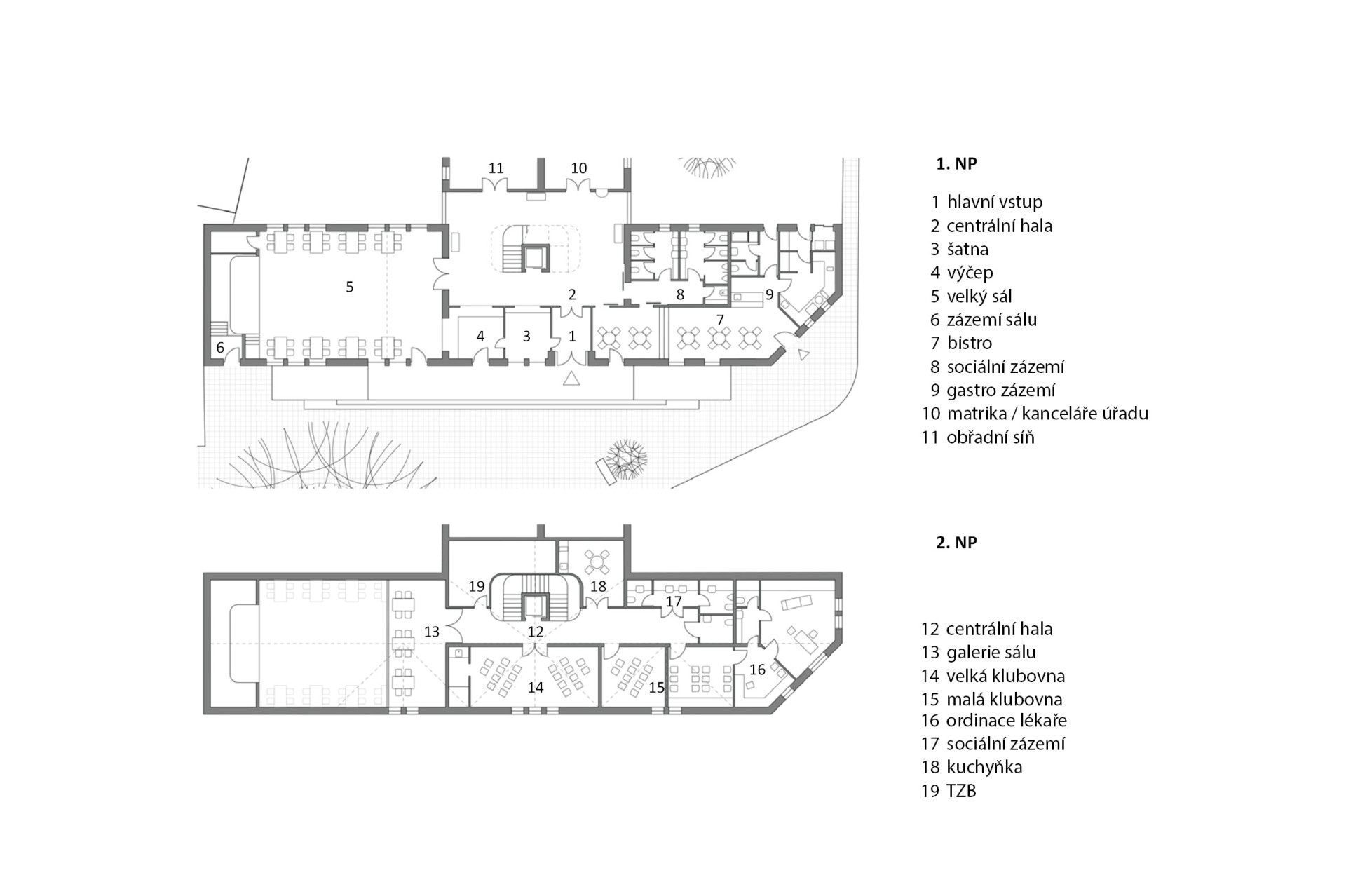 S citem se hledalo taky měřítko, objekt je jen dvoupodlažní, do výšky nevyčnívá, výrazný ale je. Půdorysně téměř stoprocentně kopíruje stopu domu, který na místě stával předtím. Odchylkou je akorát nově „useknutý“ roh. Ten stavbě dodává ozvláštnění, zároveň zpřehledňuje dopravní situaci a taky je v něm umístěný vstup do bistra – provozu, který má potenciál lidi na náves přivést.